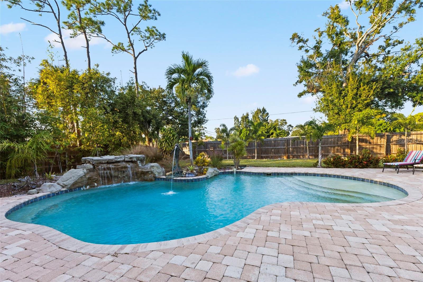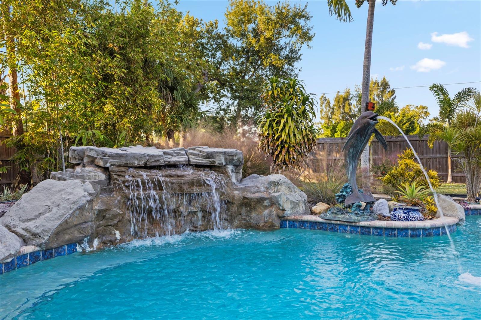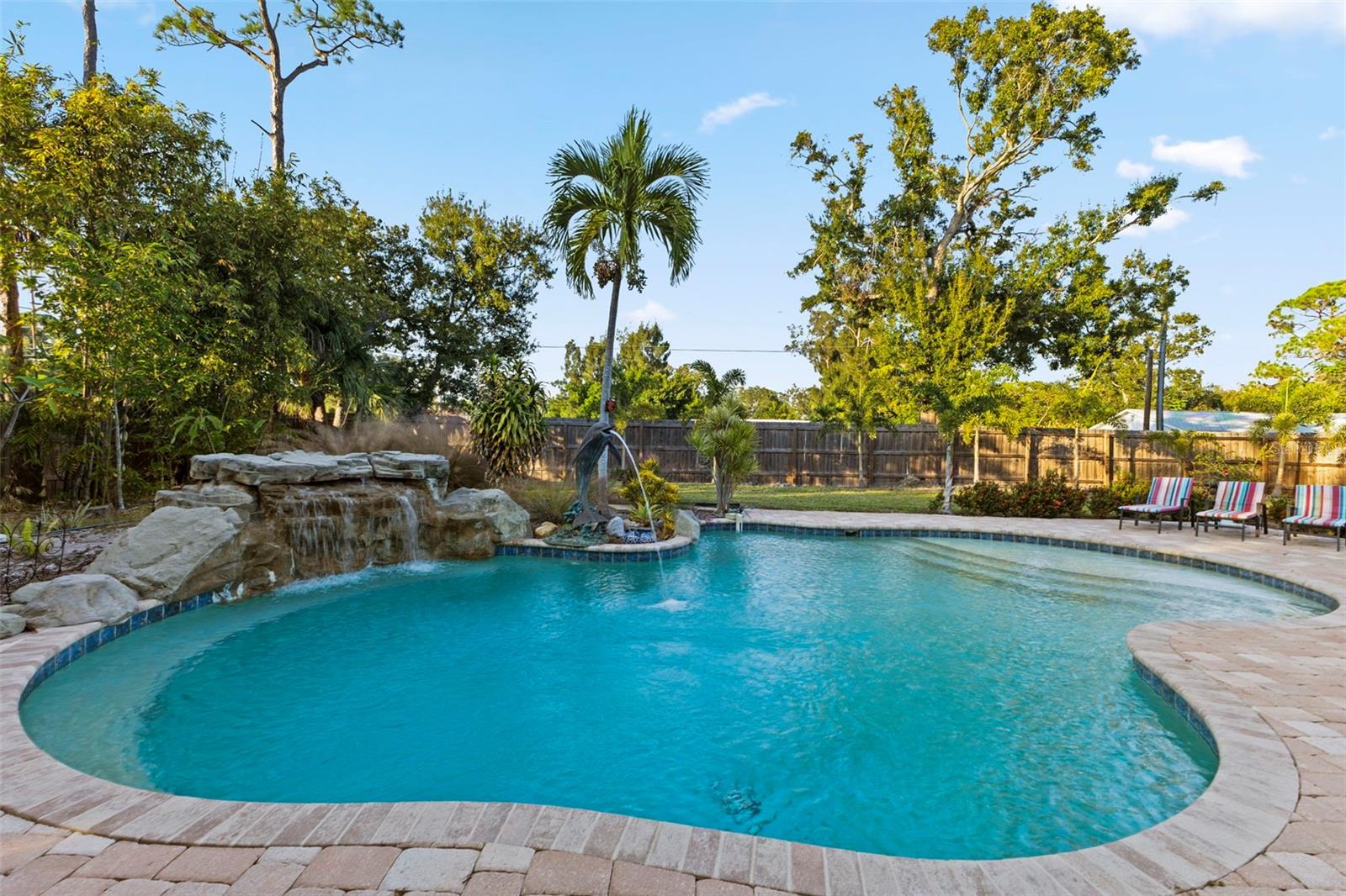 An inviting Sarasota residence that blends spacious indoor living with a true resort-style outdoor oasis, all positioned in one of the most convenient and desirable locations in Sarasota County. Thoughtfully decorated and beautifully maintained, this home opens with a charming courtyard entrance that sets an immediate tone of warmth and sophistication. Inside, Brazilian hardwood floors flow throughout the living spaces, complementing abundant natural light and an open, flexible layout. The home offers large bedrooms and two versatile flex rooms ideal for a den, office, playroom, hobby studio, gym, storage, or an additional guest suite. Upgraded interior doors add a refined touch, while the master bedroom features a custom built-in closet system for exceptional organization. The kitchen impresses with an epoxy river kitchen-island countertop paired with a copper farmhouse sink, creating a stunning focal point for both cooking and entertaining. Additional highlights include Mexican tile accents, a generous walk-in pantry, and thoughtful design that blends character with function. Step outside to discover the crown jewel of the property: a private, resort-style lagoon pool designed for the ultimate Florida lifestyle. This expansive 20, 000-gallon saltwater pool showcases a rockwall waterfall, a dolphin fountain, bench seating, and a sun shelf for lounging. With outstanding sun exposure perfect for sunbathing, the pool is surrounded by an oversized pavered patio offering abundant space for lounge seating and entertaining. A 340-sq-ft screened lanai with a ceiling fan extends the indoor living space and provides a comfortable transition to the home’s breathtaking outdoor retreat. Mature tropical landscaping creates lush privacy, enhancing the serene ambiance and delivering the feeling of a secluded paradise. Completing the outdoor experience is a tiki bar with bartop seating and built-in lighting, ideal for evening cocktails, weekend celebrations, and memorable nights under the Florida sky. The property also includes a wired utility and workshop shed, plus an irrigation system for easy landscape maintenance. Beyond its impressive features, the location elevates this home even further. Residents are less than 10 minutes from Downtown Sarasota’s world-class dining, boutique shopping, waterfront parks, and vibrant cultural arts district. The world-famous Siesta Key Beach, renowned for its powdery white quartz sand, is approximately 10 minutes away, offering effortless beach days. The upscale UTC Mall and surrounding dining and entertainment district are about 15 minutes away, while St. Armands Circle and Lido Beach are roughly 20 minutes away for oceanfront dining and luxury leisure. Everyday conveniences, including Sarasota Memorial Hospital, grocery stores, parks, boat ramps, and I-75, are all within minutes, making this home a rare combination of comfort, style, and accessibility. Beautifully updated, move-in ready, and enhanced with an outdoor living experience rarely found in this location, this property presents an exceptional opportunity to embrace the best of Sarasota living! ROOF 2020. Two of three HVACs 2023.