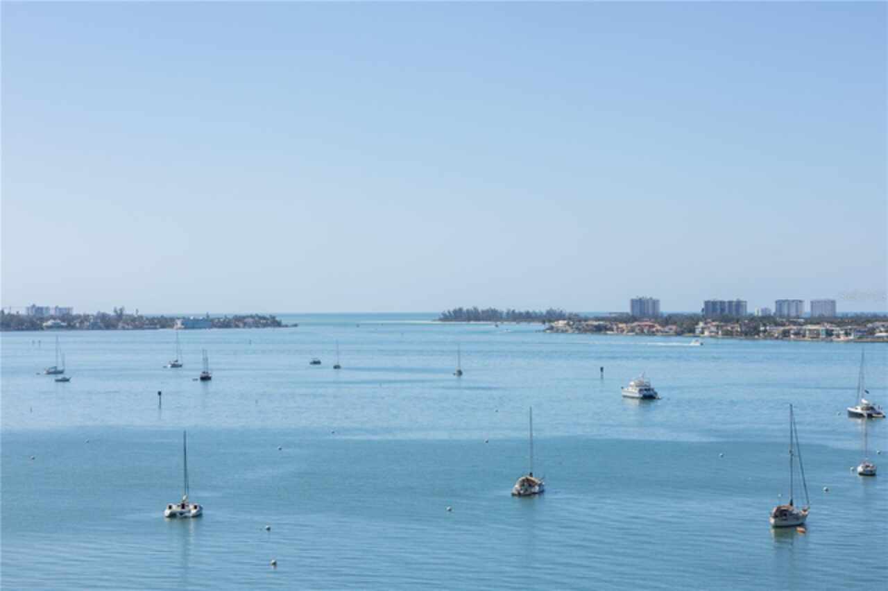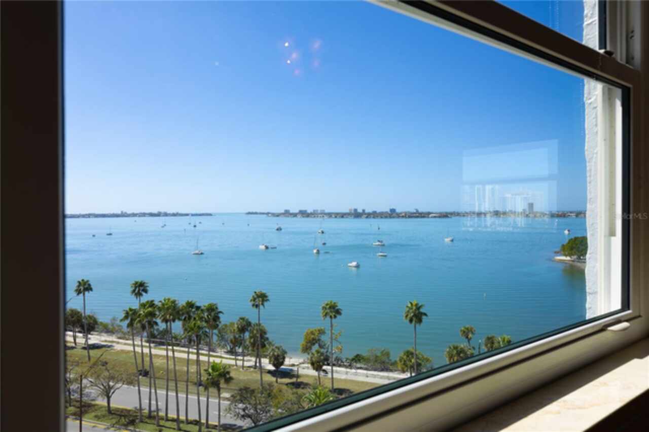 Motivated Sellers *The best Priced Penthouse with Direct Bayfront View *Rare Opportunity to own a Downtown Sarasota Penthouse for under 1 million with Stunning, breathtaking full-bay views, two bedrooms/two baths, and a luxurious condo with a spacious great room floor plan. Natural light is throughout, and beautiful harbor views overlook the Bayfront, Marina Jack, and Big Pass to the Gulf of Mexico. Enjoy nightly sunsets. Wood flooring flows throughout all the rooms. Designer kitchen with stainless steel appliances, classic, rich wood cabinets, luxurious granite countertops, cooktop, and wall oven- a chef's delight. A designed electric fireplace and a large primary bedroom suite entice you to enjoy tranquil water views of the bay, including the Ringling Bridge. Gorgeous bathrooms. New washer and dryer. Additional storage closets are available for your convenience. PLEASE NOTE: Older condos are experiencing BUYERS' concerns about the maintenance costs of aging buildings. However, it's important to note that this building has undergone a thorough inspection and maintains reasonable reserves, making it a solid investment opportunity. Experience maintenance-free living with 24-hour concierge service, a heated pool, a club room, an exercise room, and a library. Enjoy the rich cultural amenities of our fabulous town: fine dining, galleries, shops, opera, theatre, Whole Foods, and Selby Gardens. Prime location with the marina across the street and just minutes over the bridge to St. Armand's world-famous shopping. It is a short drive to Siesta Key and Lido beaches. The Selby Gardens is within a short distance. Restaurants are nearby. Walk to Palm Avenue, visit famous art galleries and great restaurants, and enjoy one of the best Sarasota areas to work and live in.