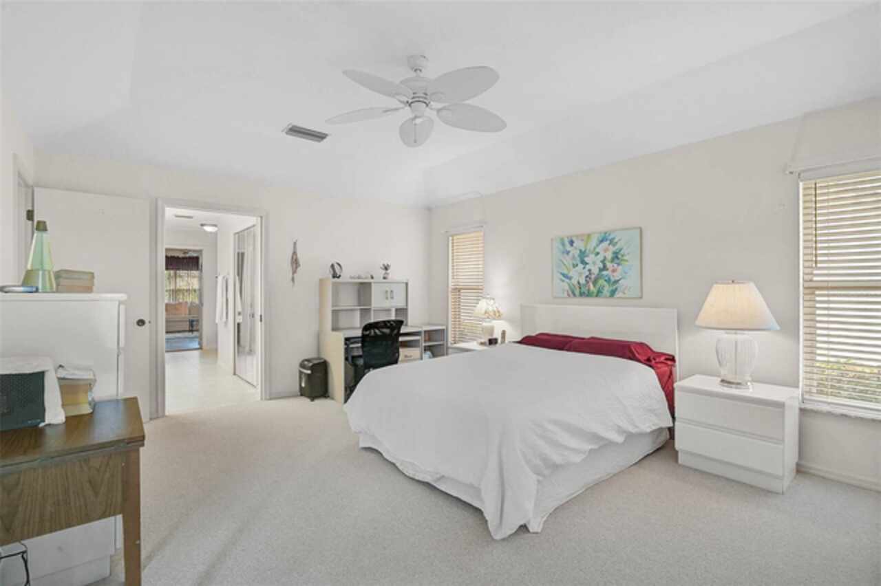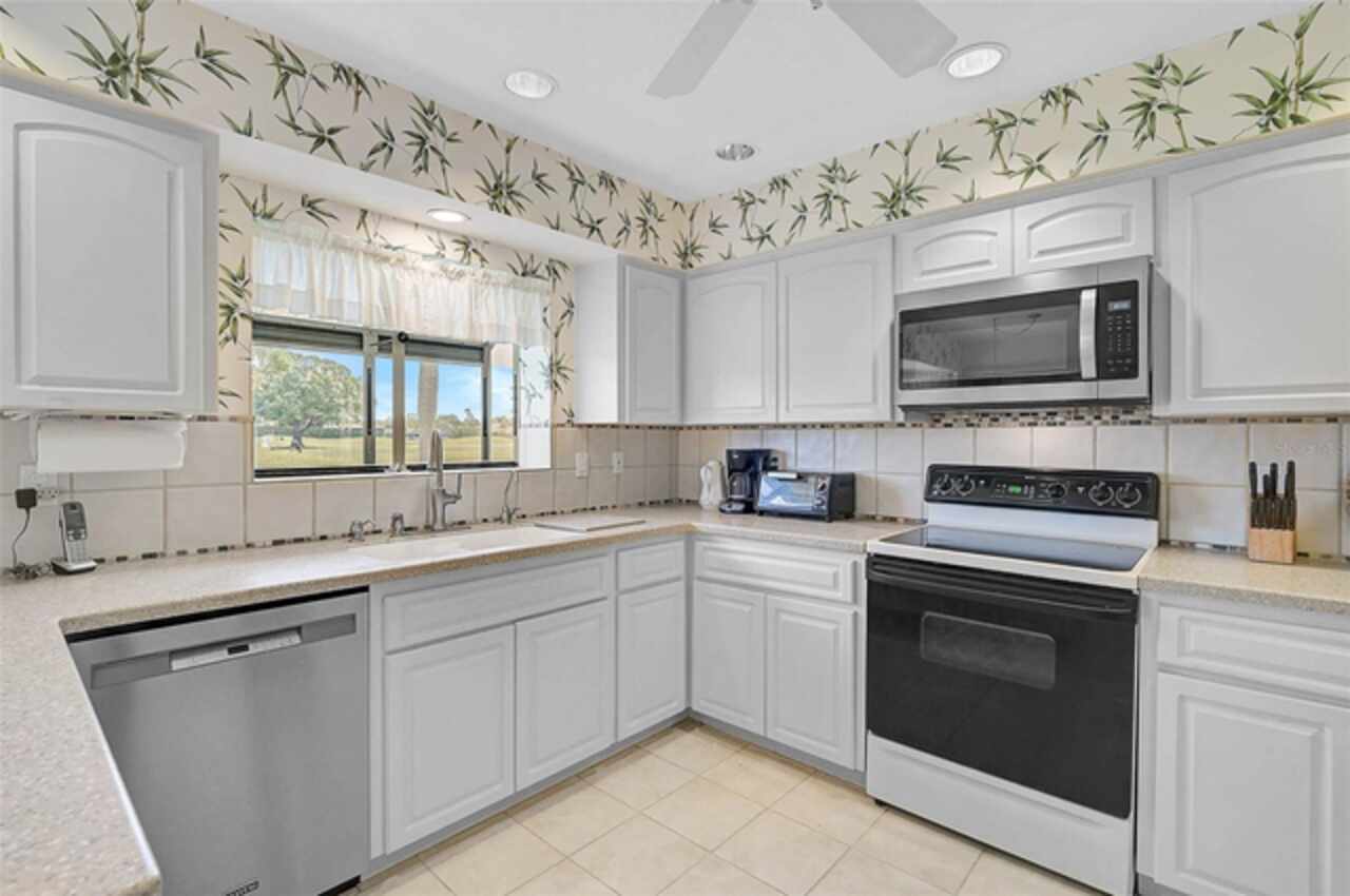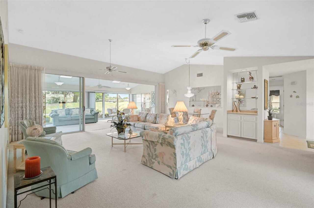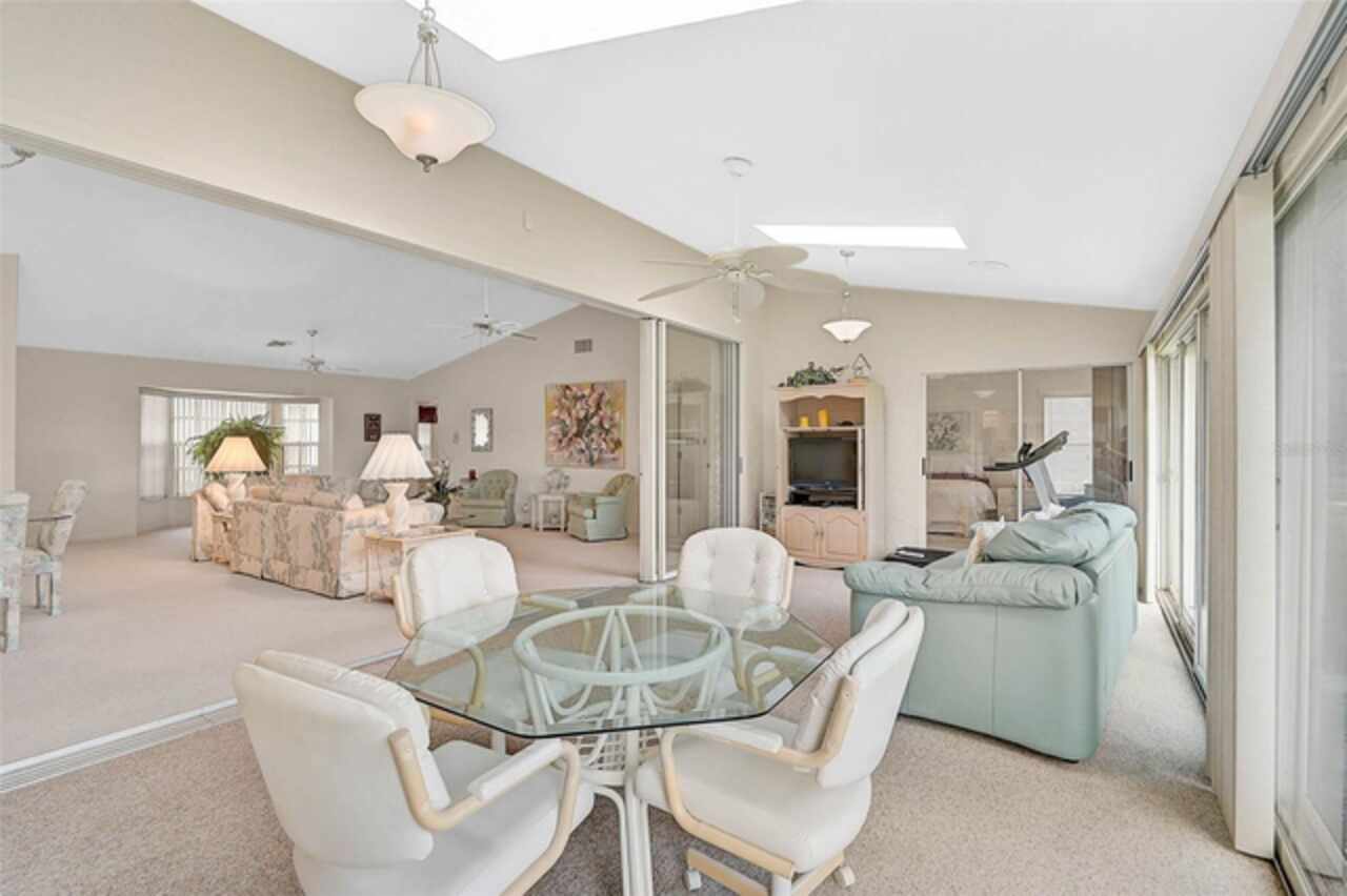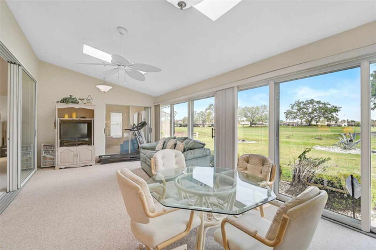 Located in Peridia Golf & Country Club, this 3BR/2BA home offers desirable golf course frontage and a comfortable split floor plan. The interior features high ceilings and a light, bright atmosphere throughout. The kitchen includes Corian countertops, an eat-in area, and a conveniently located laundry room just off the kitchen, complete with a large sink and a spacious pantry. The large, glass-enclosed lanai with skylights provides additional living space and a great spot to relax. The primary bedroom is carpeted and features an en-suite bathroom with double sinks, a separate tub, and a walk-in shower. The roof was replaced in 2014. Residents of Peridia Golf & Country Club enjoy access to a variety of amenities, including an 18-hole executive golf course, tennis and pickleball courts, water aerobics, Mah Jong, a book club, bingo, and live music on Friday nights. The renovated Tiki Bar adds even more to the vibrant community atmosphere. Quarterly Master Association fee: $877, Annual Food/Beverage minimum: $450, One-time Application Fee: $100, One-time Capital Reserve: $4, 000. Contact us today to schedule your showing and learn more about this opportunity to join the Peridia lifestyle!
