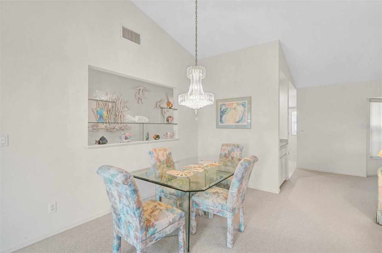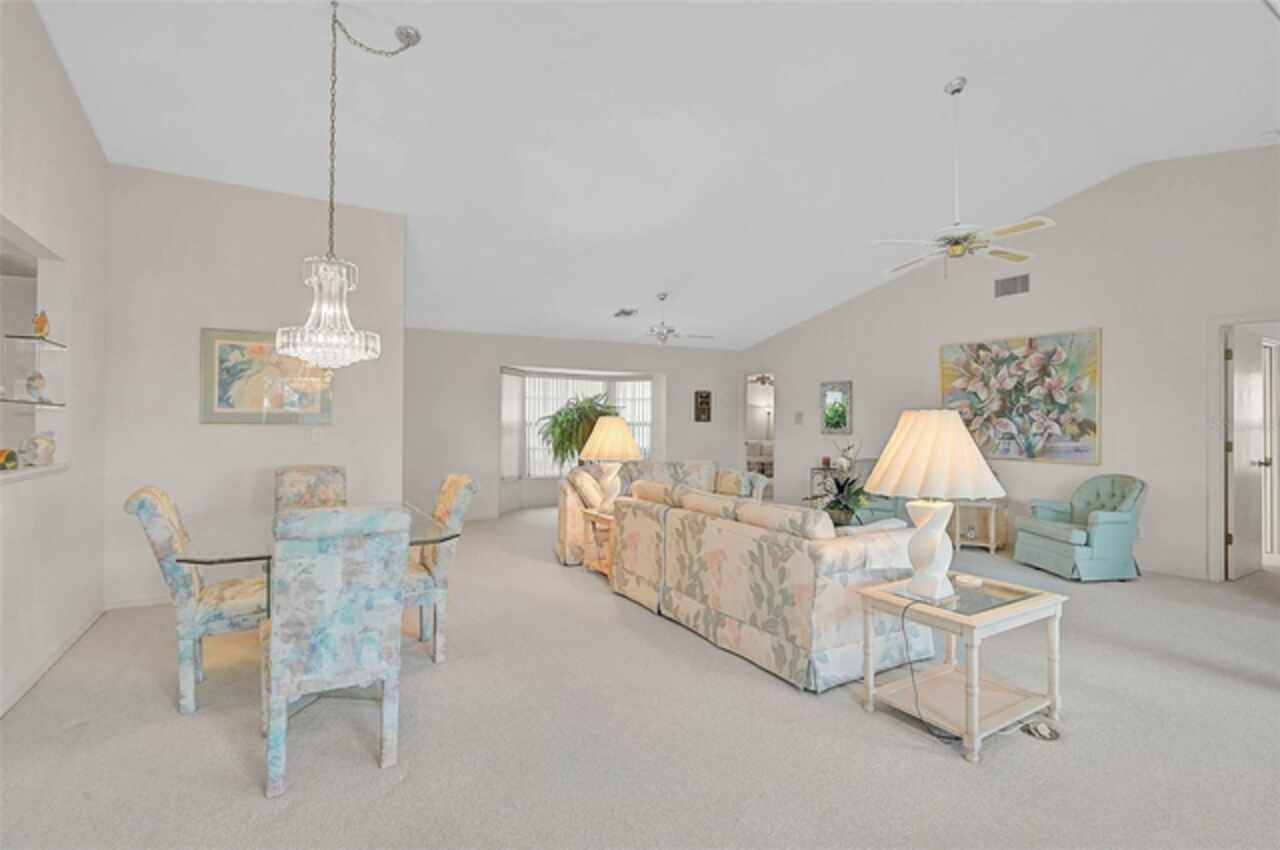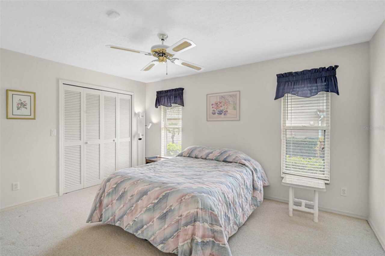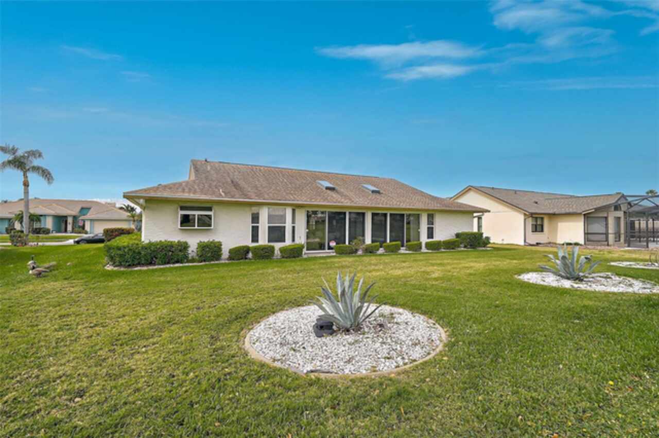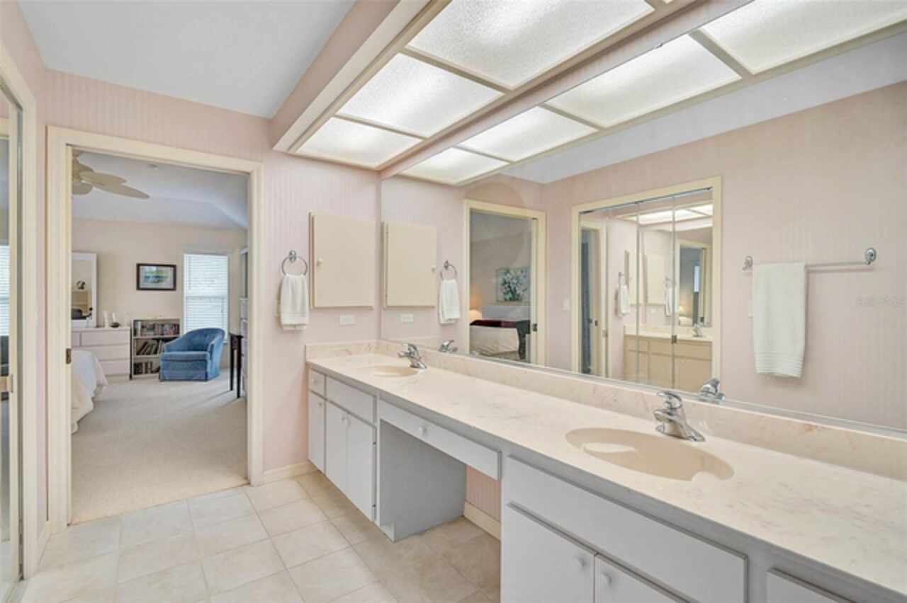 Located in Peridia Golf & Country Club, this 3BR/2BA home offers desirable golf course frontage and a comfortable split floor plan. The interior features high ceilings and a light, bright atmosphere throughout. The kitchen includes Corian countertops, an eat-in area, and a conveniently located laundry room just off the kitchen, complete with a large sink and a spacious pantry. The large, glass-enclosed lanai with skylights provides additional living space and a great spot to relax. The primary bedroom is carpeted and features an en-suite bathroom with double sinks, a separate tub, and a walk-in shower. The roof was replaced in 2014. Residents of Peridia Golf & Country Club enjoy access to a variety of amenities, including an 18-hole executive golf course, tennis and pickleball courts, water aerobics, Mah Jong, a book club, bingo, and live music on Friday nights. The renovated Tiki Bar adds even more to the vibrant community atmosphere. Quarterly Master Association fee: $877, Annual Food/Beverage minimum: $450, One-time Application Fee: $100, One-time Capital Reserve: $4, 000. Contact us today to schedule your showing and learn more about this opportunity to join the Peridia lifestyle!