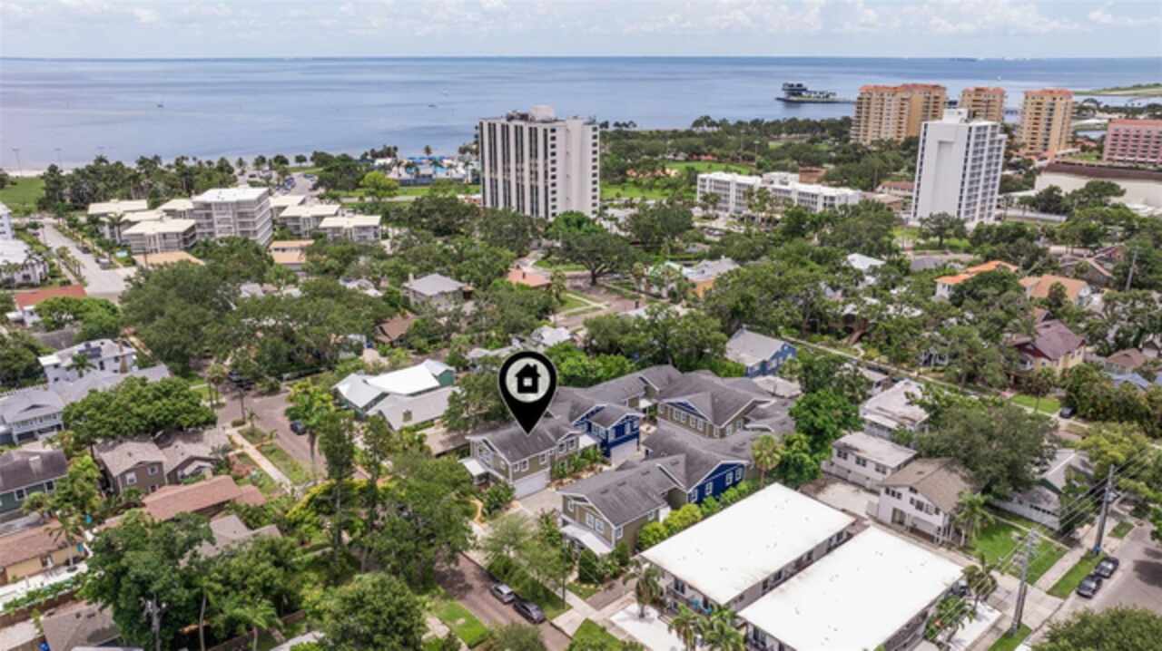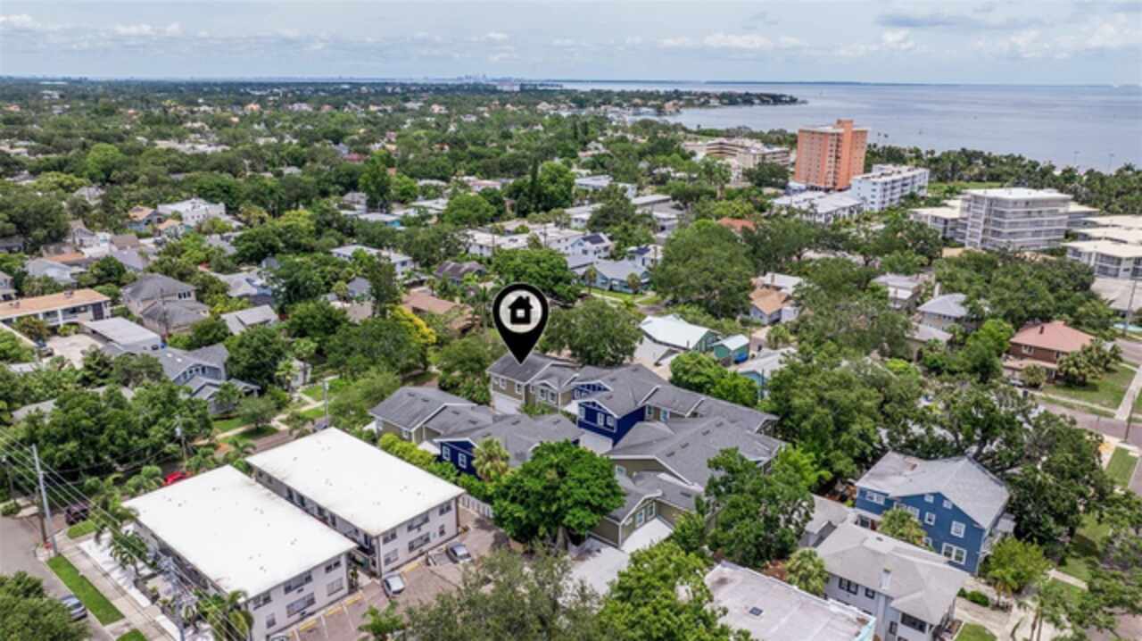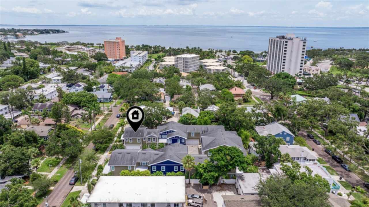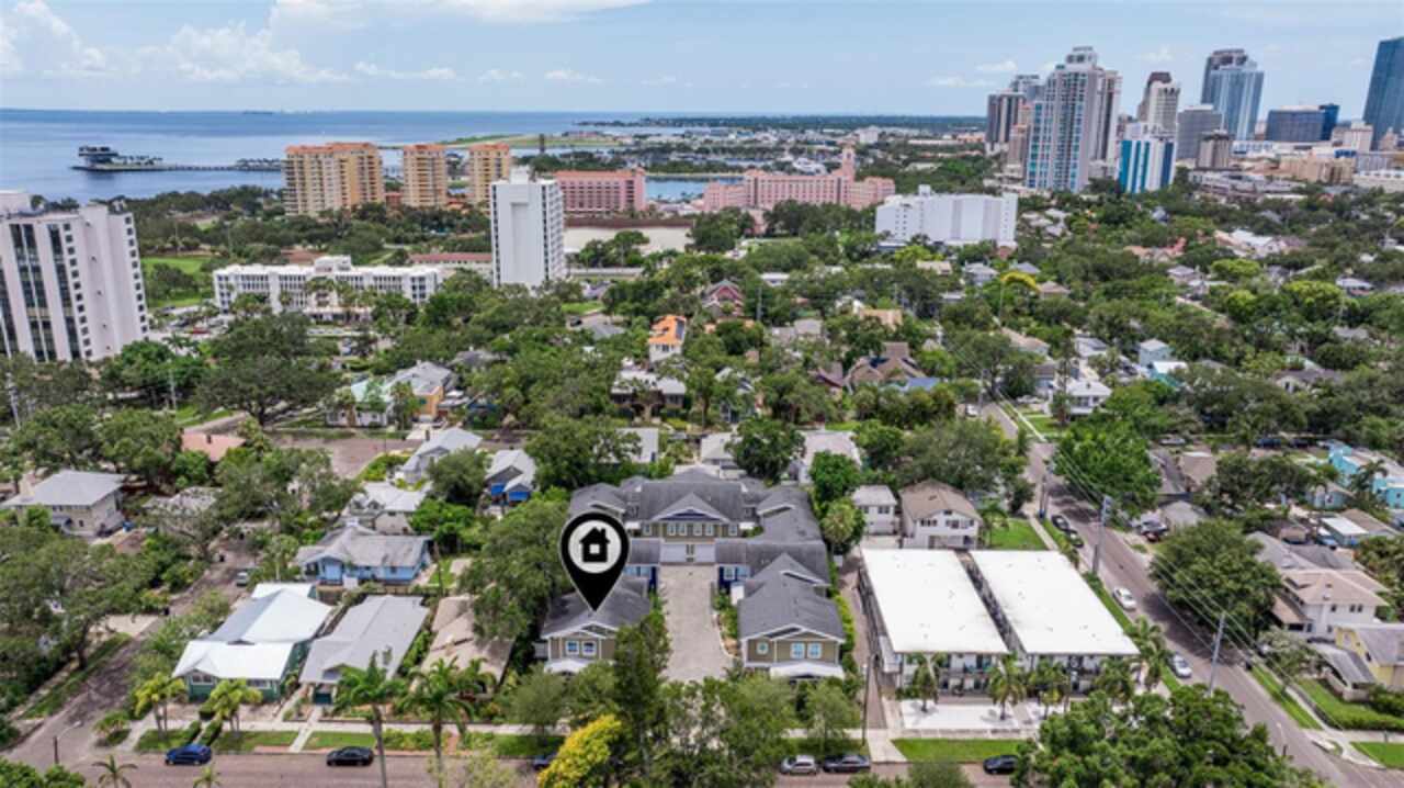 Located in the highly sought-after Historic Old Northeast neighborhood in a NON-FLOOD ZONE this impeccably designed 2-bedroom and den/bonus room, 2.5-bath townhome, built in 2017, offers the perfect blend of classic charm and modern convenience. With 2, 096 sq ft of thoughtfully designed space, this two-story masonry block construction townhome is positioned at the front of a boutique 8-unit community, offering a single-family home feel with a large front porch featuring a charming swing and a private, cozy backyard ideal for outdoor entertaining or grilling. Just a 10-minute walk and six blocks from vibrant downtown, this home is in the perfect location. The open-concept first floor is designed for both everyday living and entertaining, featuring a spacious dining room and a beautifully appointed kitchen with custom soft-close solid wood cabinetry, quartz countertops, a stylish backsplash, and stainless steel appliances with natural gas range. The living room effortlessly transitions into the kitchen and overlooks French doors that lead to the private backyard. An oversized 2-car garage is seamlessly integrated into the home, offering easy access. Completing this level is a well-designed half-bath. Upstairs, you’ll find a spacious family room, a private laundry room, and a generously sized guest bedroom with an en-suite bathroom. The primary bedroom is a true retreat, complete with a large walk-in closet and a spa-like en-suite bathroom featuring an oversized frameless glass shower and premium fixtures. This home is loaded with thoughtful upgrades, including a new HVAC system (2024), wood flooring throughout, crown molding, custom blinds, hurricane-impact windows and doors, built-in closet systems, a built-in Murphy bed, ceiling fans in every room, and lush landscaping in the backyard. The entire home is equipped with a whole-house water filtration system, ensuring the utmost comfort and convenience. Located just moments from the vibrant downtown area, with its eclectic shops, acclaimed restaurants, and picturesque Tampa Bay waterfront, this move-in-ready townhome offers the ultimate in comfort, style, and location. Experience Florida living at its finest—schedule your private showing today!