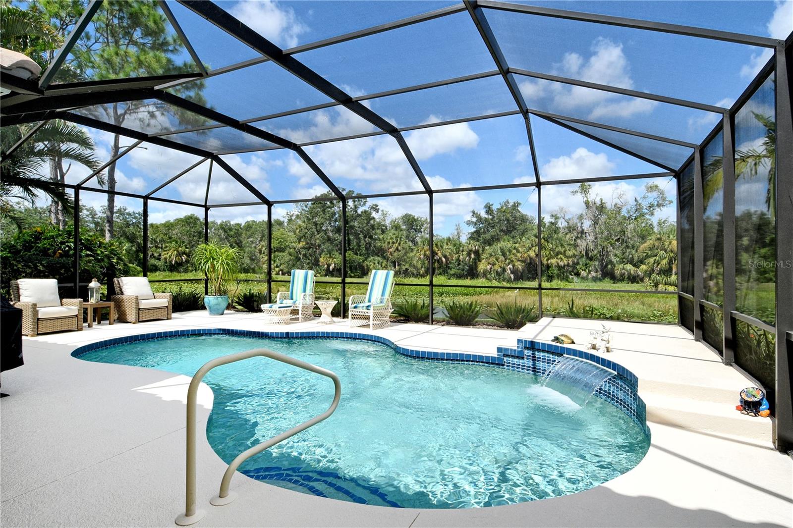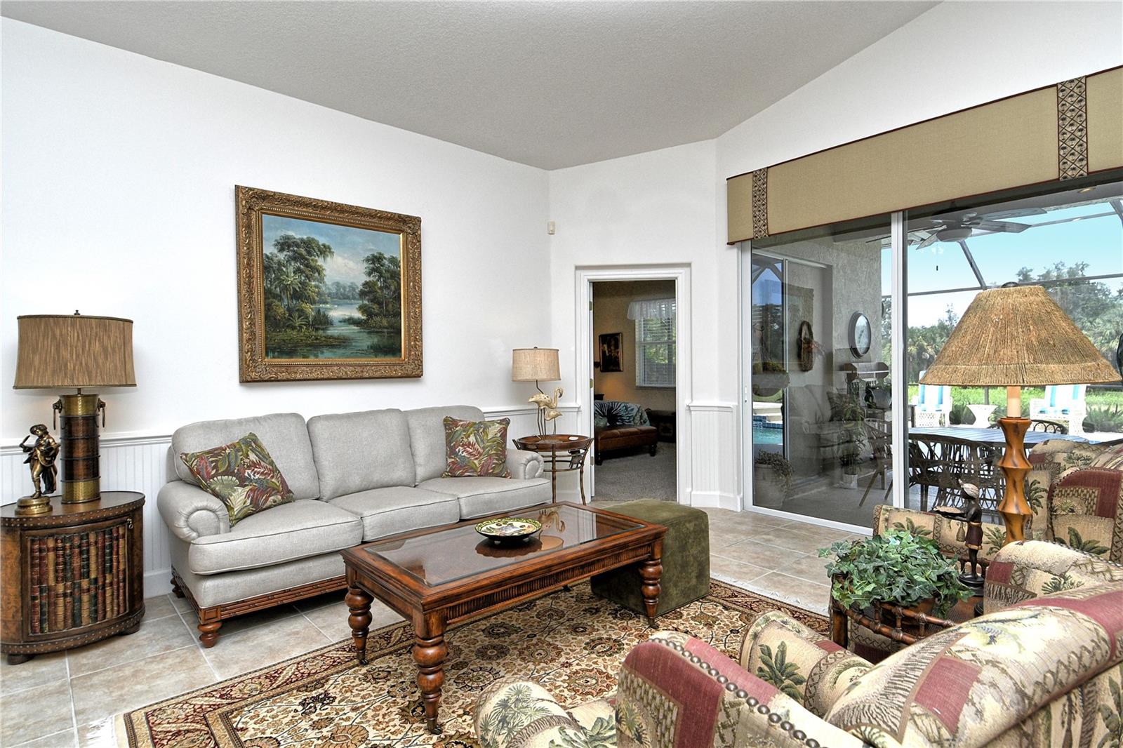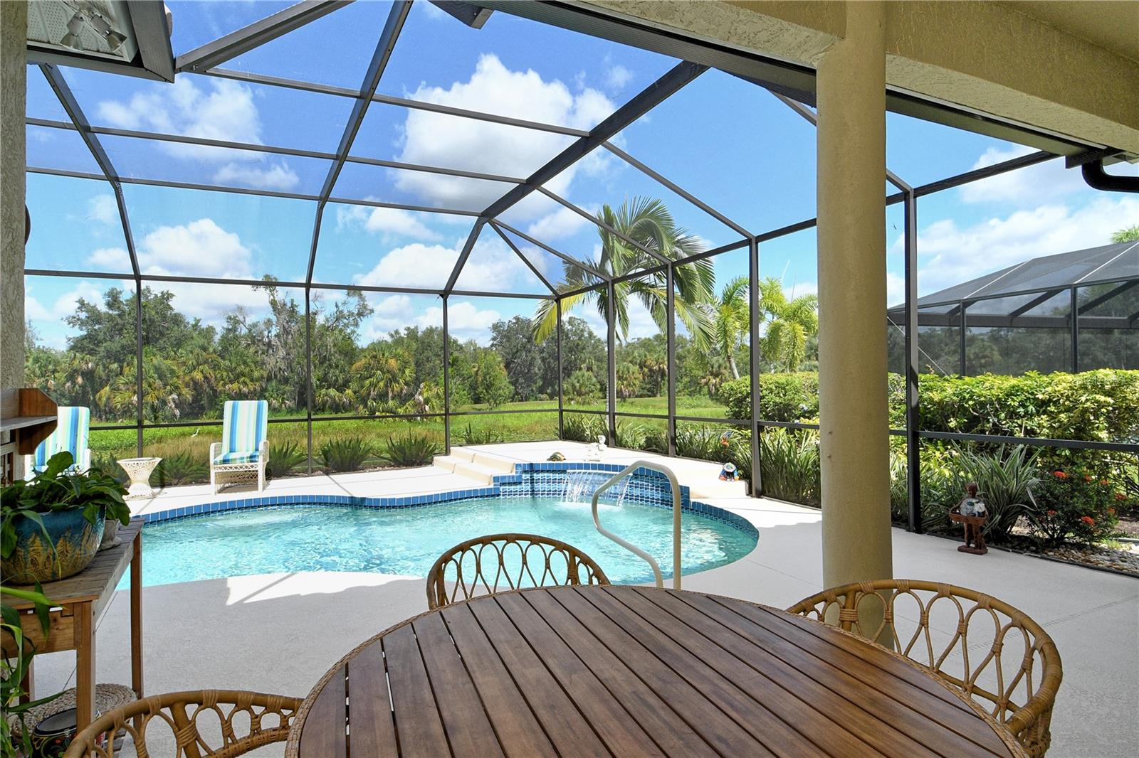 This is the property you have been waiting for! This absolutely gorgeous Innisbrook model Patio Home in Heritage Oaks Golf & Country Club features nearly 2, 000 square feet of living space and a stunning pool overlooking the picturesque water and preserve views in a tranquil and quiet part of the community. This lovely home has 2 bedrooms, 2 full bathrooms, a den/study that can double as a third bedroom, an oversized screened lanai with a gorgeous free form swimming pool, and a spacious 2 car attached garage. The owners of this property have maintained the property impeccably well and it shows! Many recent updates have been done to the home including a new roof (2024), a new paver driveway (2024) new air conditioning system (2024), new painting of pool cage and patio floor, and the property has been re-piped/re-plumbed (2023). As soon as you walk through the front door, you’re greeted with a ton of natural light flowing in through the rear slider doors. The decorative chair rail and beadboard details really add to the beauty of this home and the soaring vaulted ceilings make the space feel open and large, perfect for entertaining friends and family. Even the dining room features a spectacular built-in area with crown molding, decorative details, recessed lighting, and a cabinet array for additional storage. The den/study is a perfect flex space complete with luxury vinyl flooring, a usable built-in desk, and enough space that allows the room to be used conveniently as another bedroom if need be. The large primary suite provides plenty of space with dual walk-in closets, and a sizable bathroom complete with double sinks, a large soaking tub and shower. As you make your way outside, you’ll fall in love with the sounds of water, the beautiful swimming pool with a flowing waterfall, and the panoramic views of water and nature this property features. It is truly a spectacular sight! Relax in the evening and watch the abundance of wildlife that frequent this Certified Audubon Neighborhood. Heritage Oaks is known for its pristine 18-hole golf course, har-tru tennis courts, fitness center, 24-hour security, an impressive recently renovated clubhouse with 2 restaurants including the sensational 19th Hole Lounge, 5 heated swimming pools, and a calendar of events packed with activities. Take a tour of this outstanding property today!