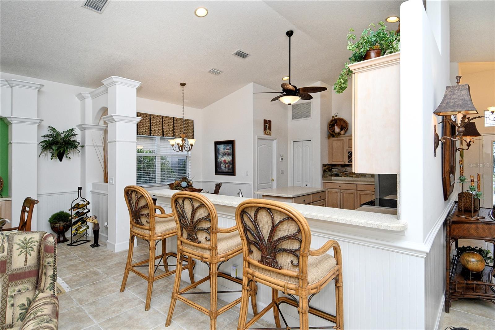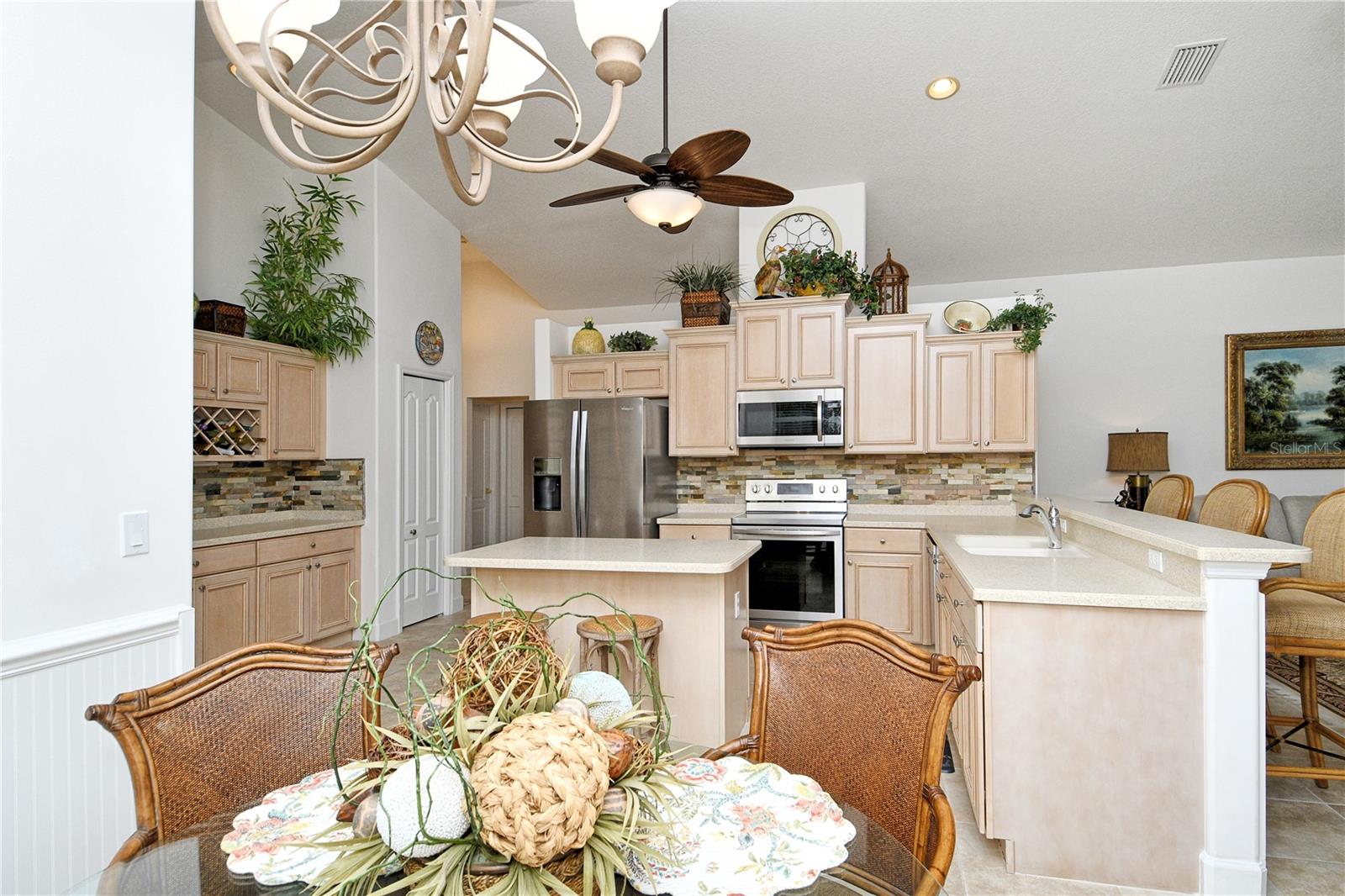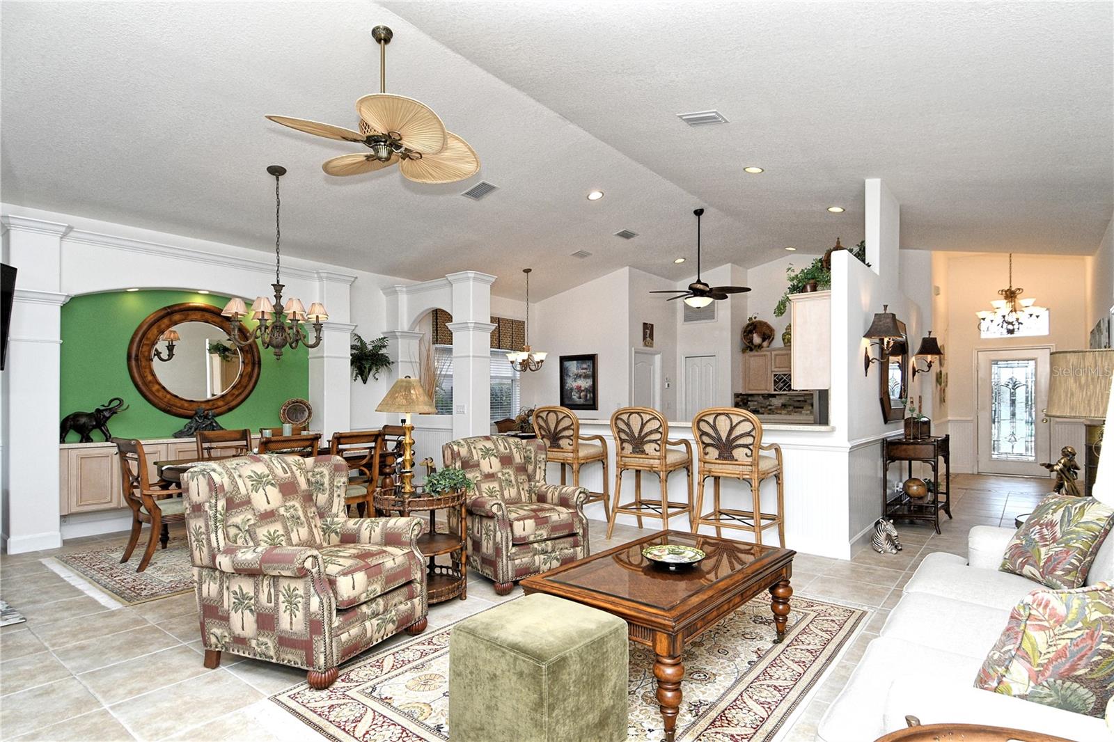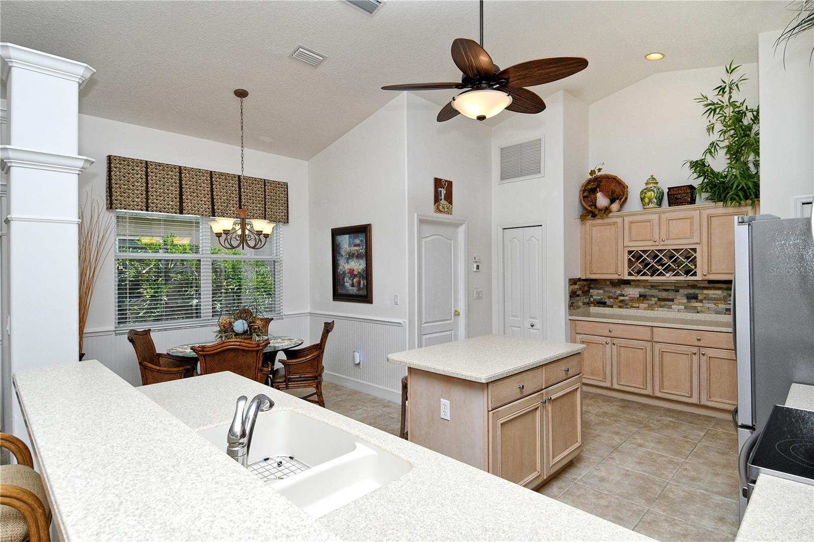 Built-in Features, Ceiling Fans(s), Eat-in Kitchen, High Ceilings, Open Floorplan, Solid Surface Counters, Split Bedroom, Thermostat, Vaulted Ceiling(s), Walk-In Closet(s), Window Treatments