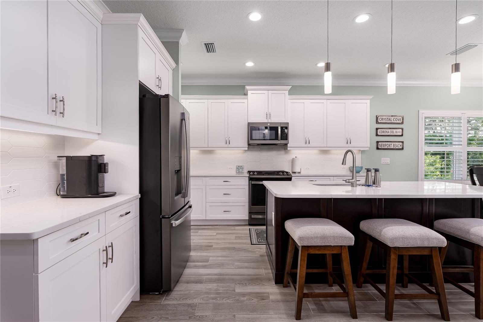 Crown Molding, Eat-in Kitchen, High Ceilings, Kitchen/Family Room Combo, Living Room/Dining Room Combo, Primary Bedroom Main Floor, Solid Wood Cabinets, Split Bedroom, Stone Counters