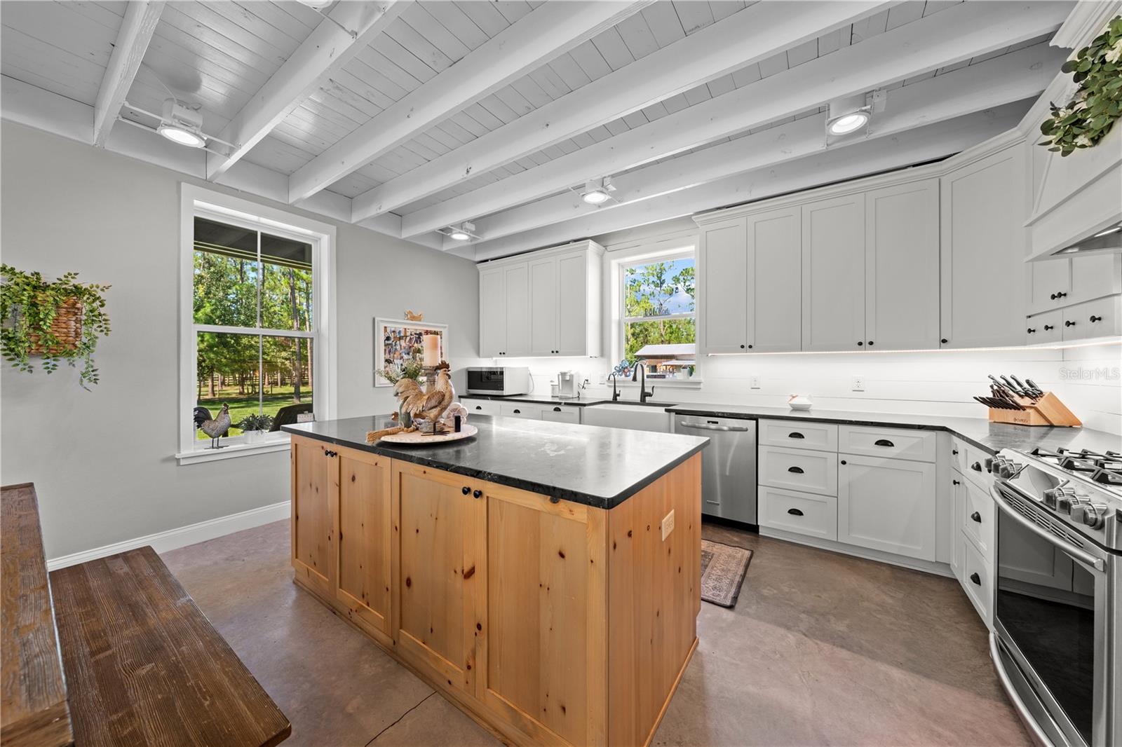 Ceiling Fans(s), Eat-in Kitchen, High Ceilings, Kitchen/Family Room Combo, Primary Bedroom Main Floor, Solid Wood Cabinets, Vaulted Ceiling(s), Window Treatments