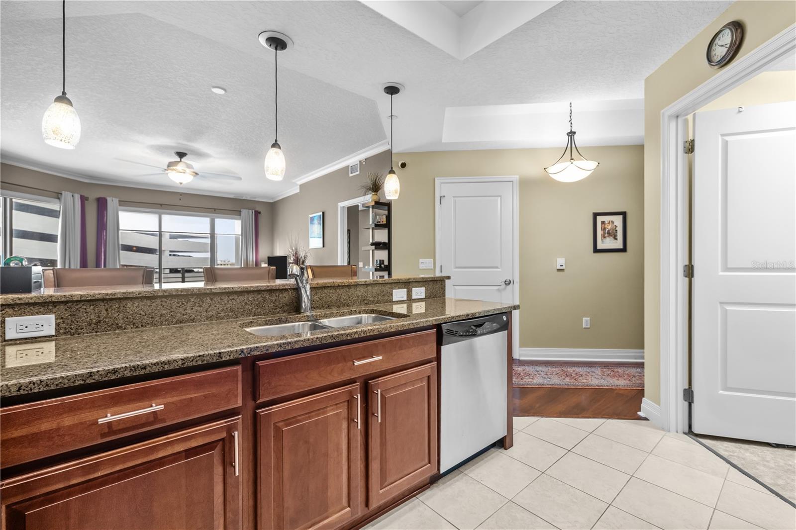 Ceiling Fans(s), Eat-in Kitchen, High Ceilings, Kitchen/Family Room Combo, Living Room/Dining Room Combo, Open Floorplan, Primary Bedroom Main Floor, Solid Surface Counters, Solid Wood Cabinets, Split Bedroom, Thermostat