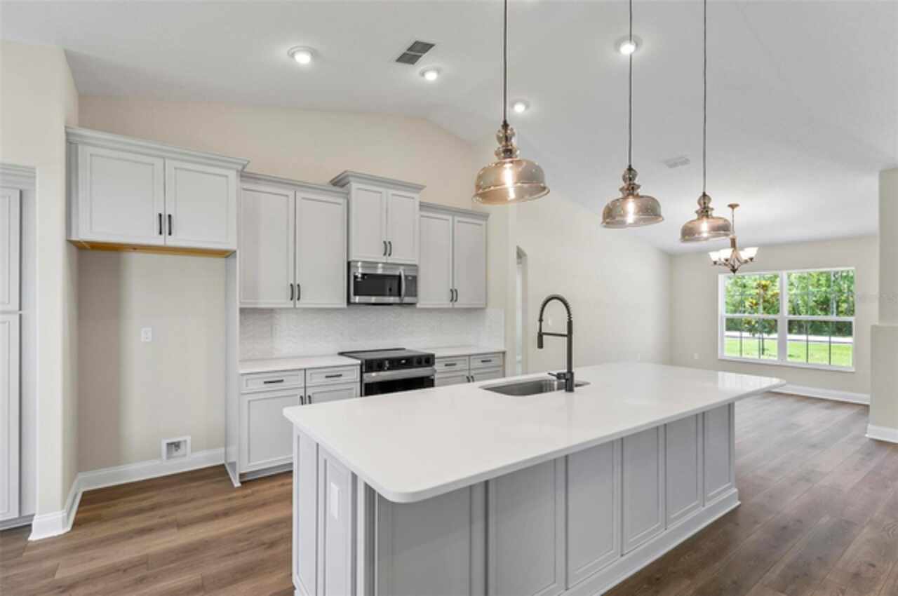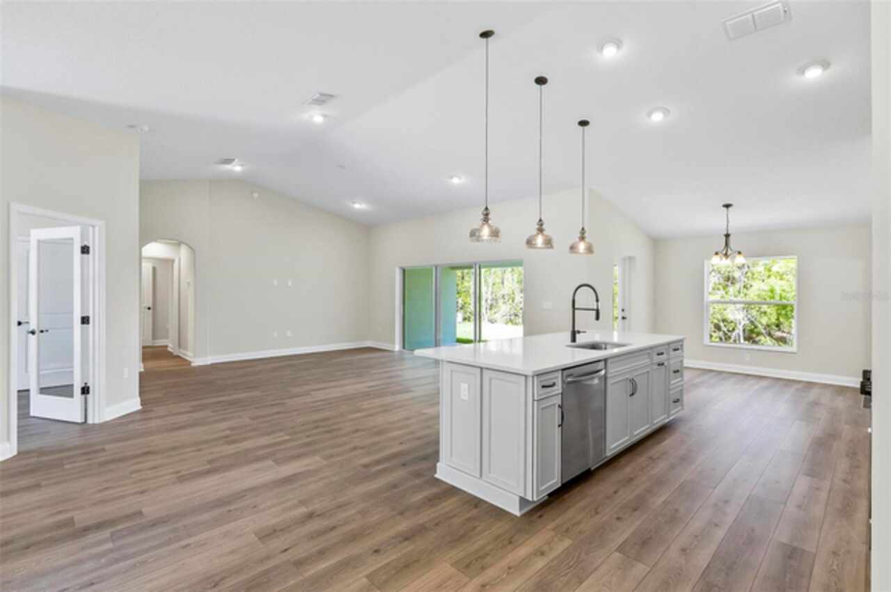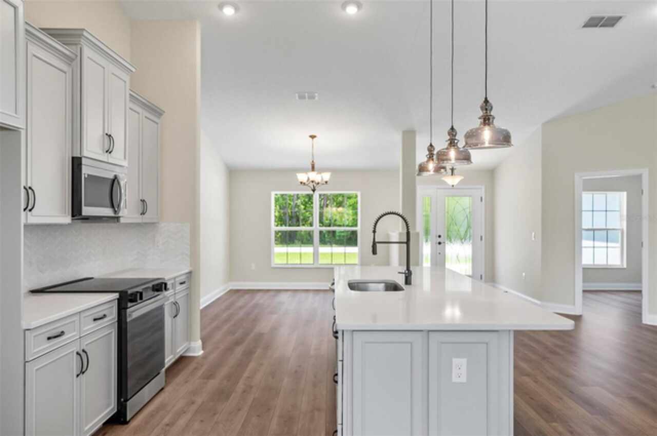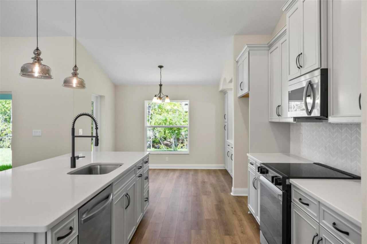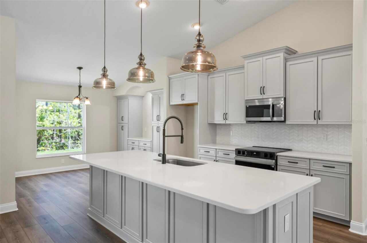 Bring All Offers! Welcome to the enchanting Willow model, a home that beckons with its warm embrace and thoughtful design. As you step inside, you'll be greeted by a spacious open floor plan adorned with arched entryways and Luxury RevWood seamlessly flowing through the main living areas and into the versatile den/flex room. For the culinary enthusiast, the kitchen is a true masterpiece, featuring quartz countertops, pendant lighting casting a gentle glow over the island bar, designer backsplash, and stainless steel appliances . Stylish hardware accents and 42" cabinets adorned with crown molding extend into the adjacent cafe, creating a perfect blend of functionality and elegance. The private owner's suite is a sanctuary of luxury, showcasing a recessed ceiling detail, two oversized walk-in closets for ample storage, a dual sink vanity offering convenience, and a generously sized walk-in shower for a spa-like experience. Step outside through the expanded sliding glass doors onto the lanai, where you can savor the beauty of your backyard with upgraded floritam sod and large 3 car garage. Closing costs paid up to $5000.