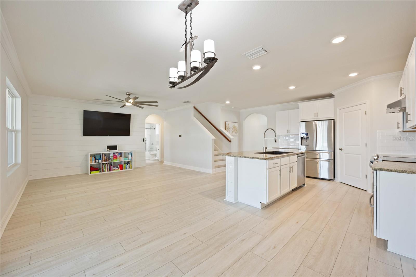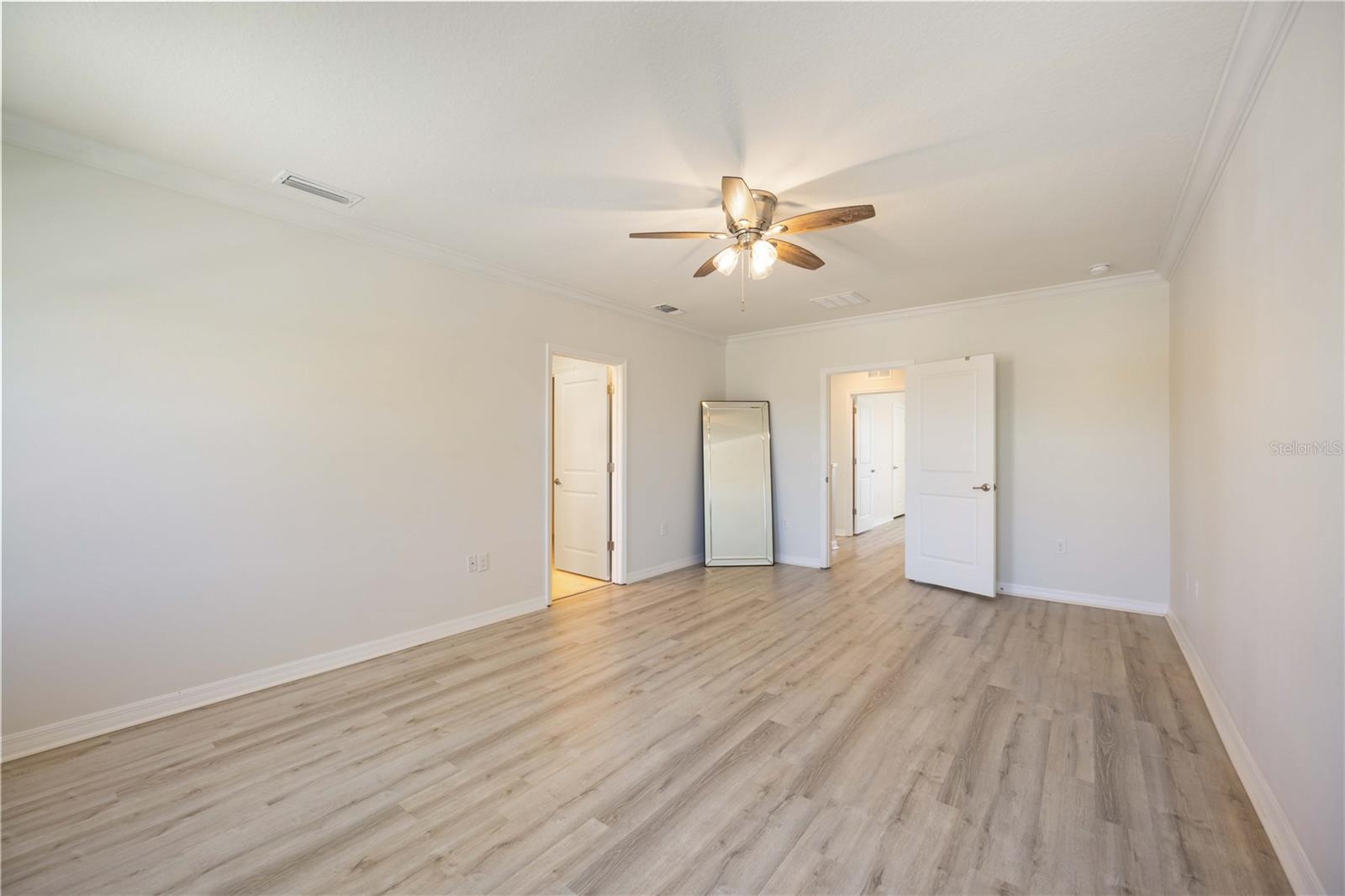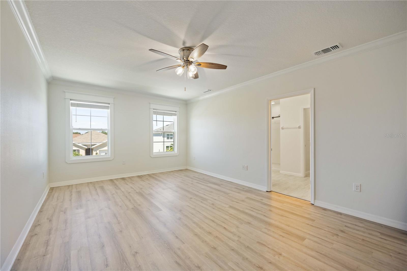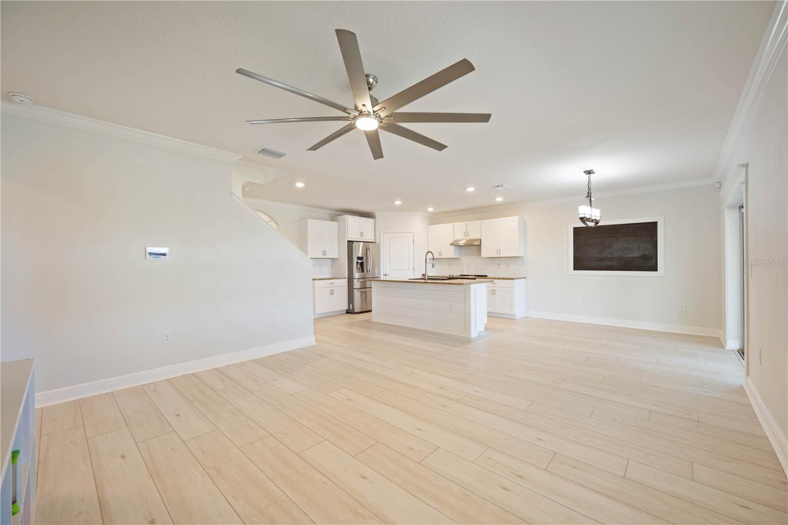 Ceiling Fans(s), Crown Molding, Eat-in Kitchen, Kitchen/Family Room Combo, Open Floorplan, PrimaryBedroom Upstairs, Solid Surface Counters, Stone Counters, Thermostat, Walk-In Closet(s)