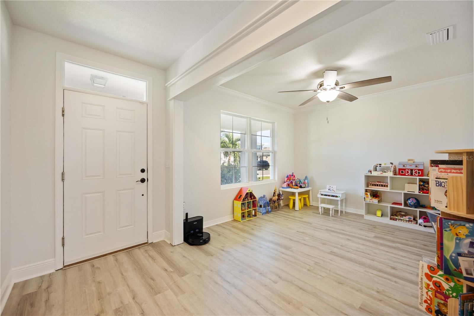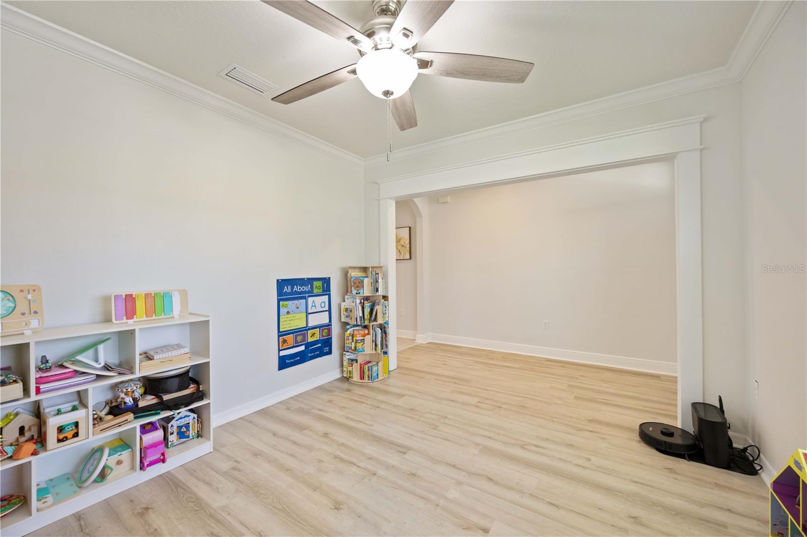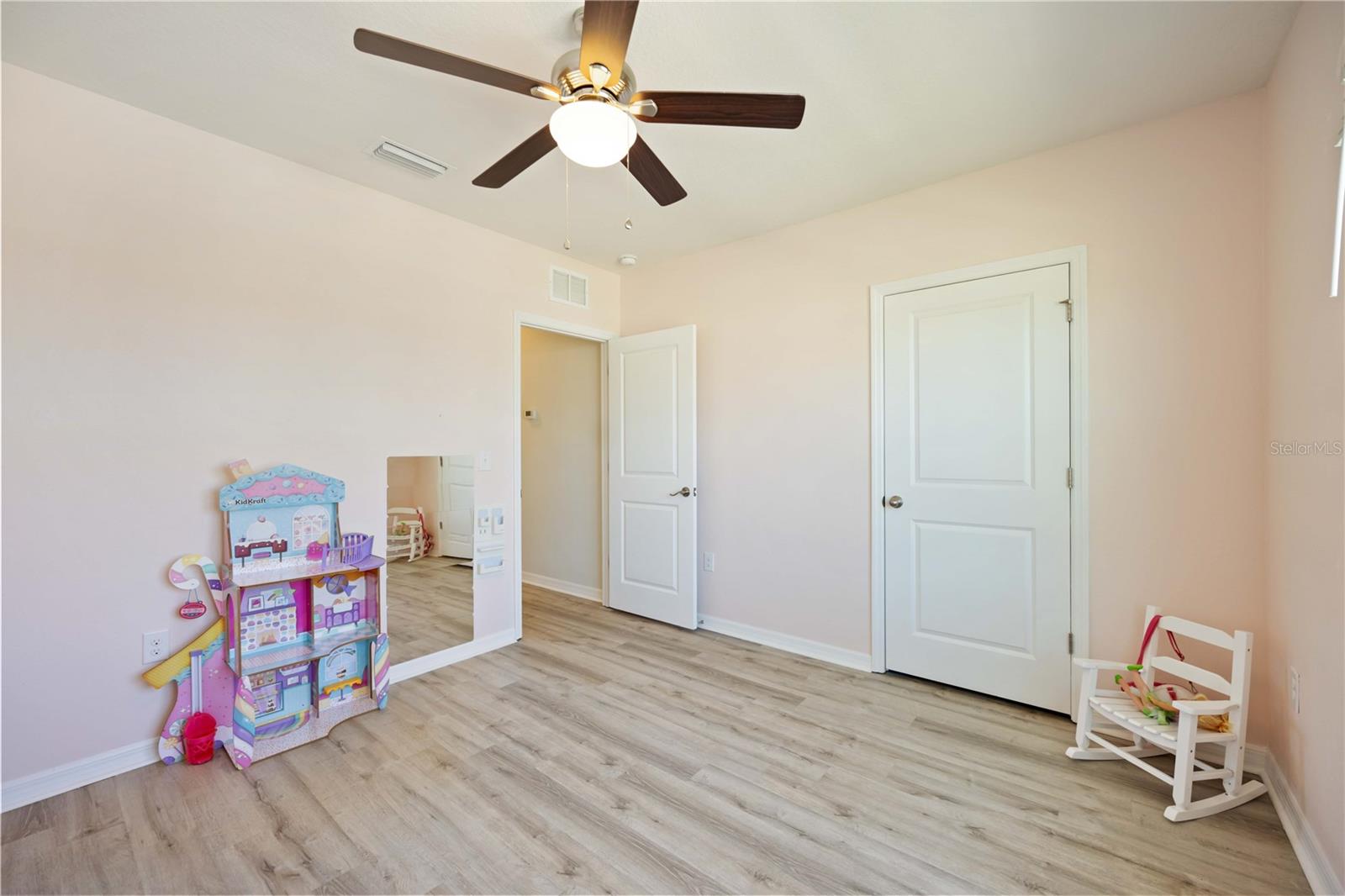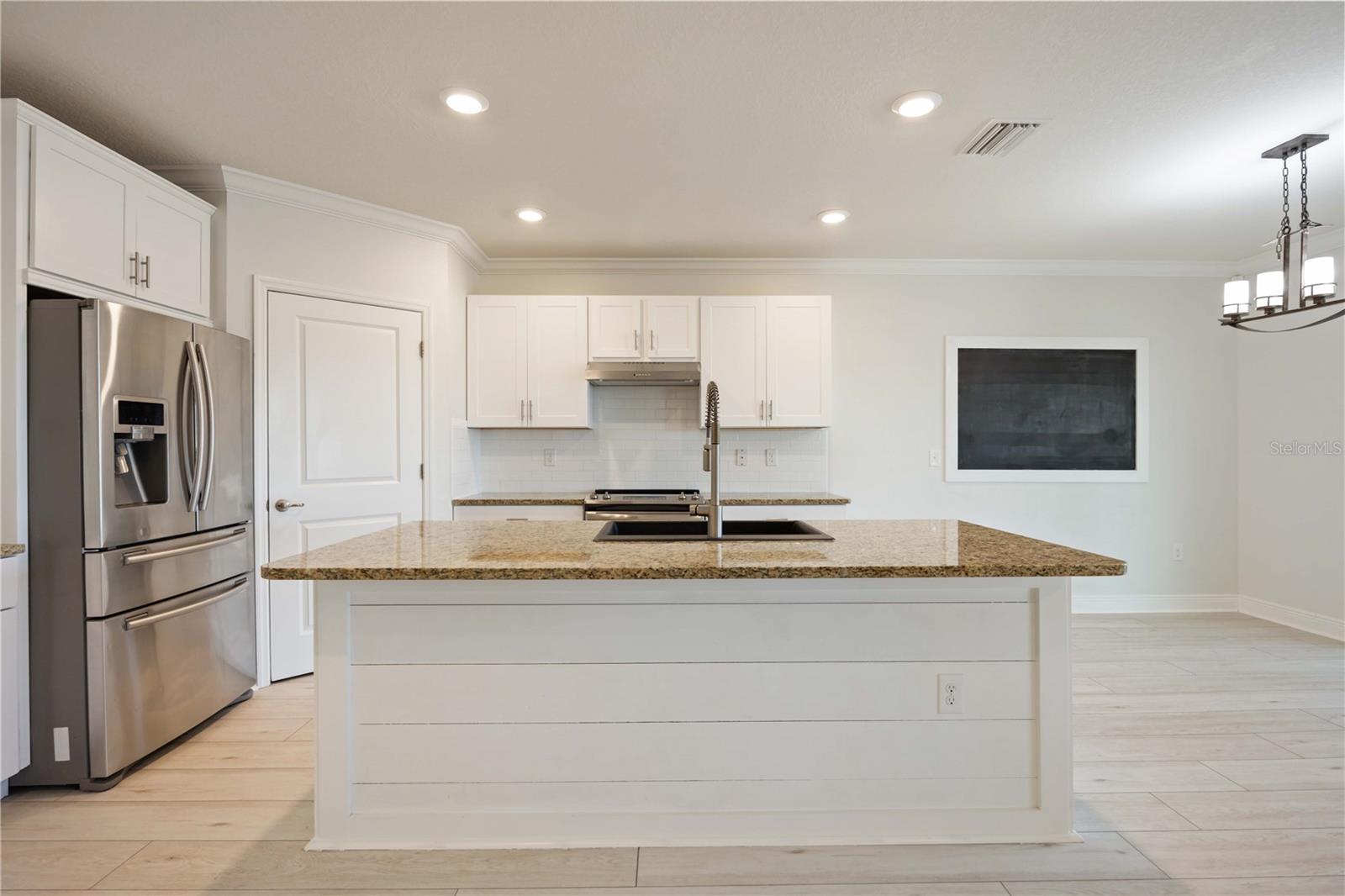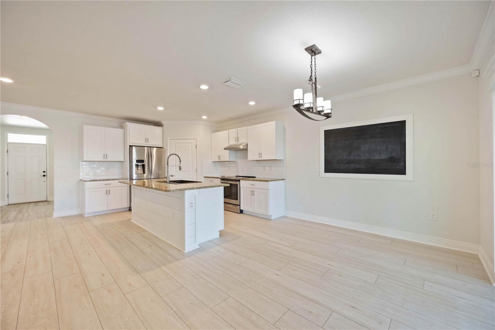 Ceiling Fans(s), Crown Molding, Eat-in Kitchen, Kitchen/Family Room Combo, Open Floorplan, PrimaryBedroom Upstairs, Solid Surface Counters, Stone Counters, Thermostat, Walk-In Closet(s)