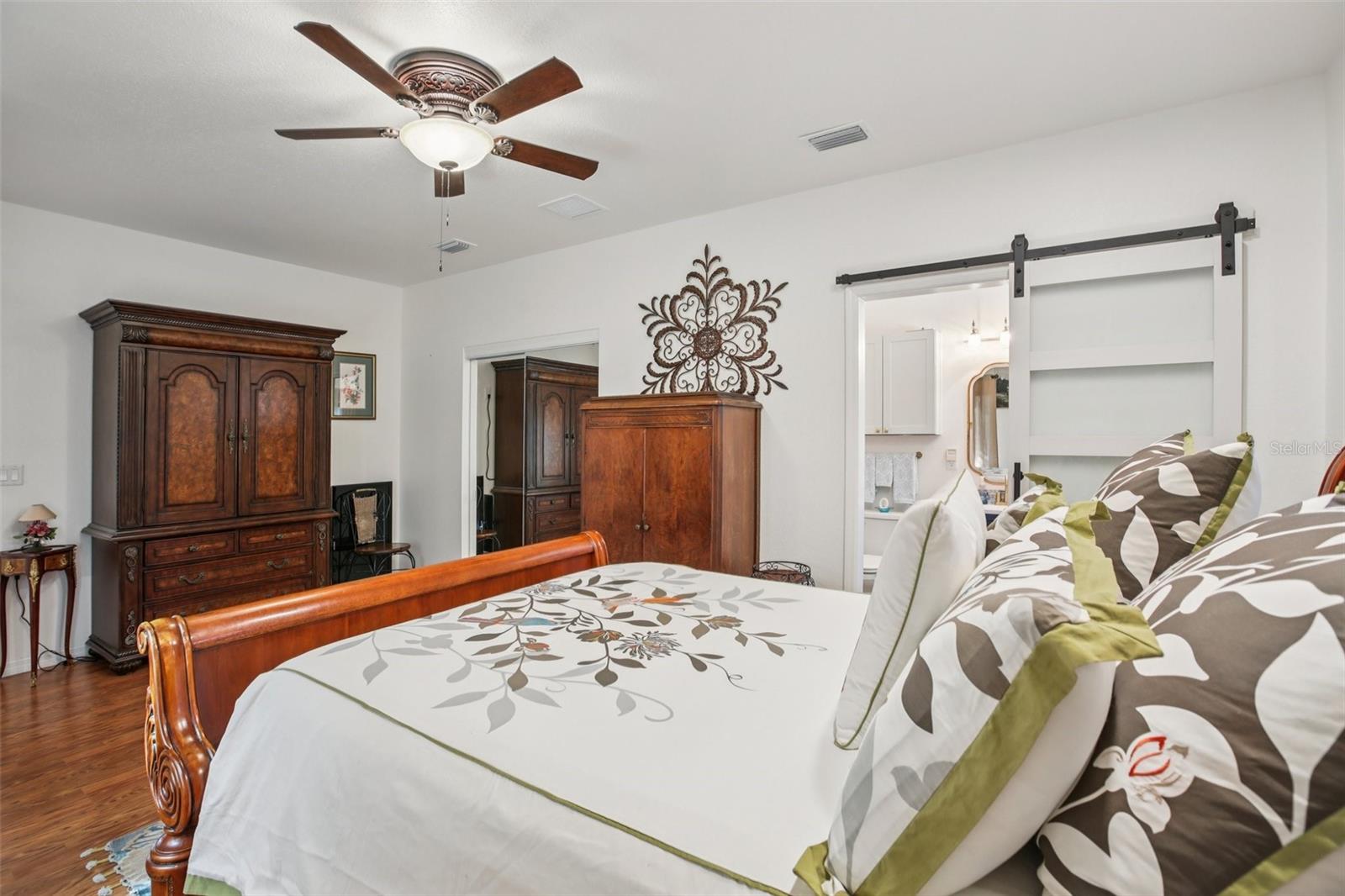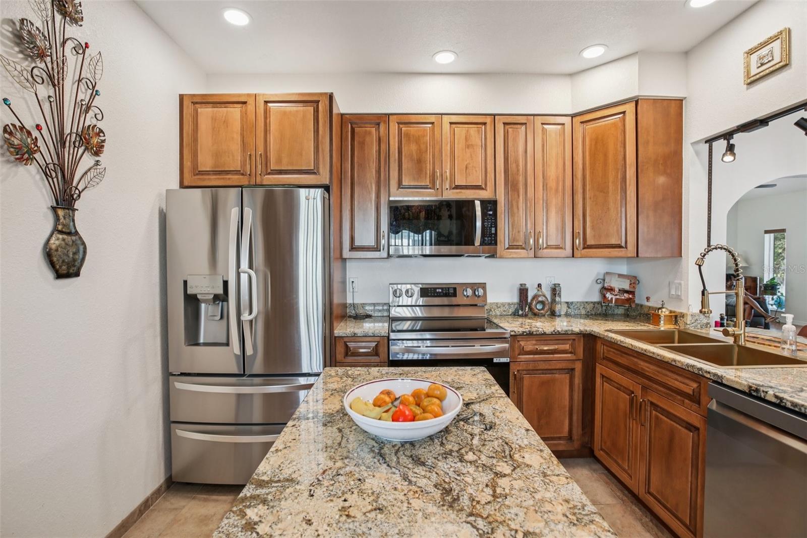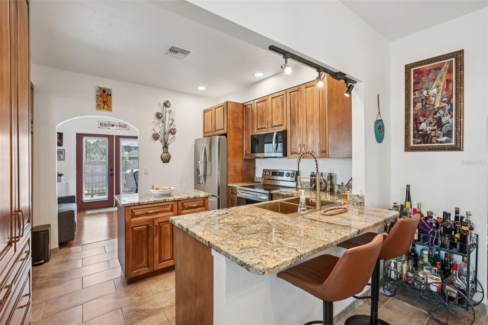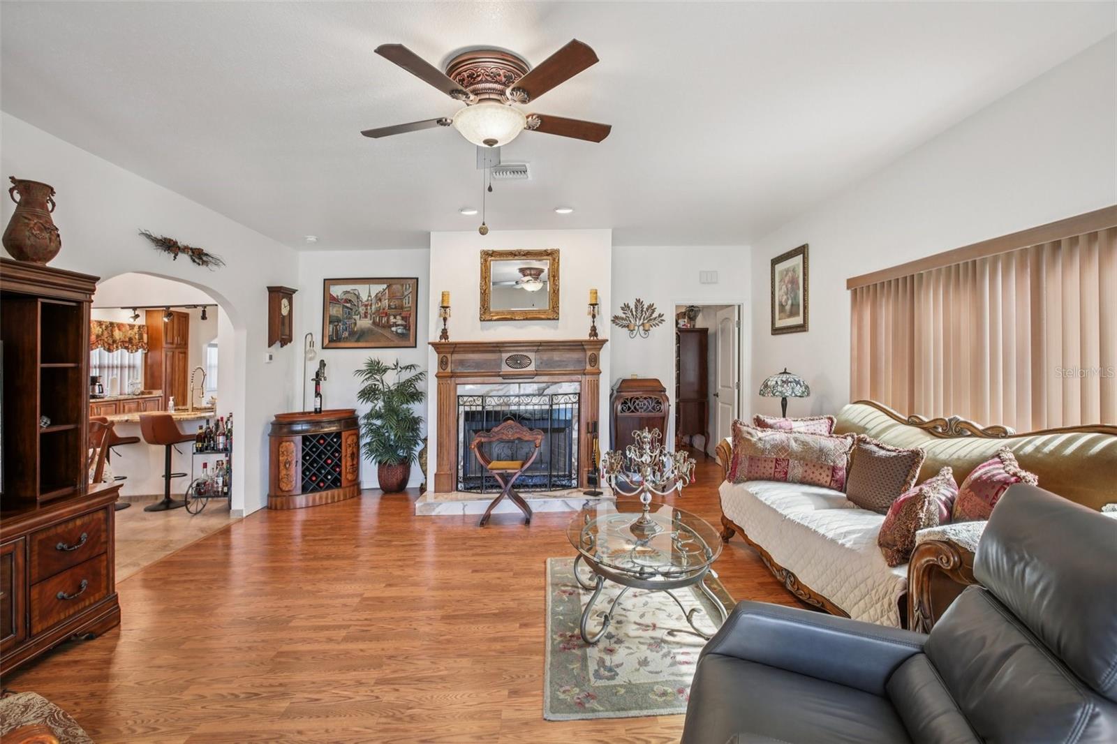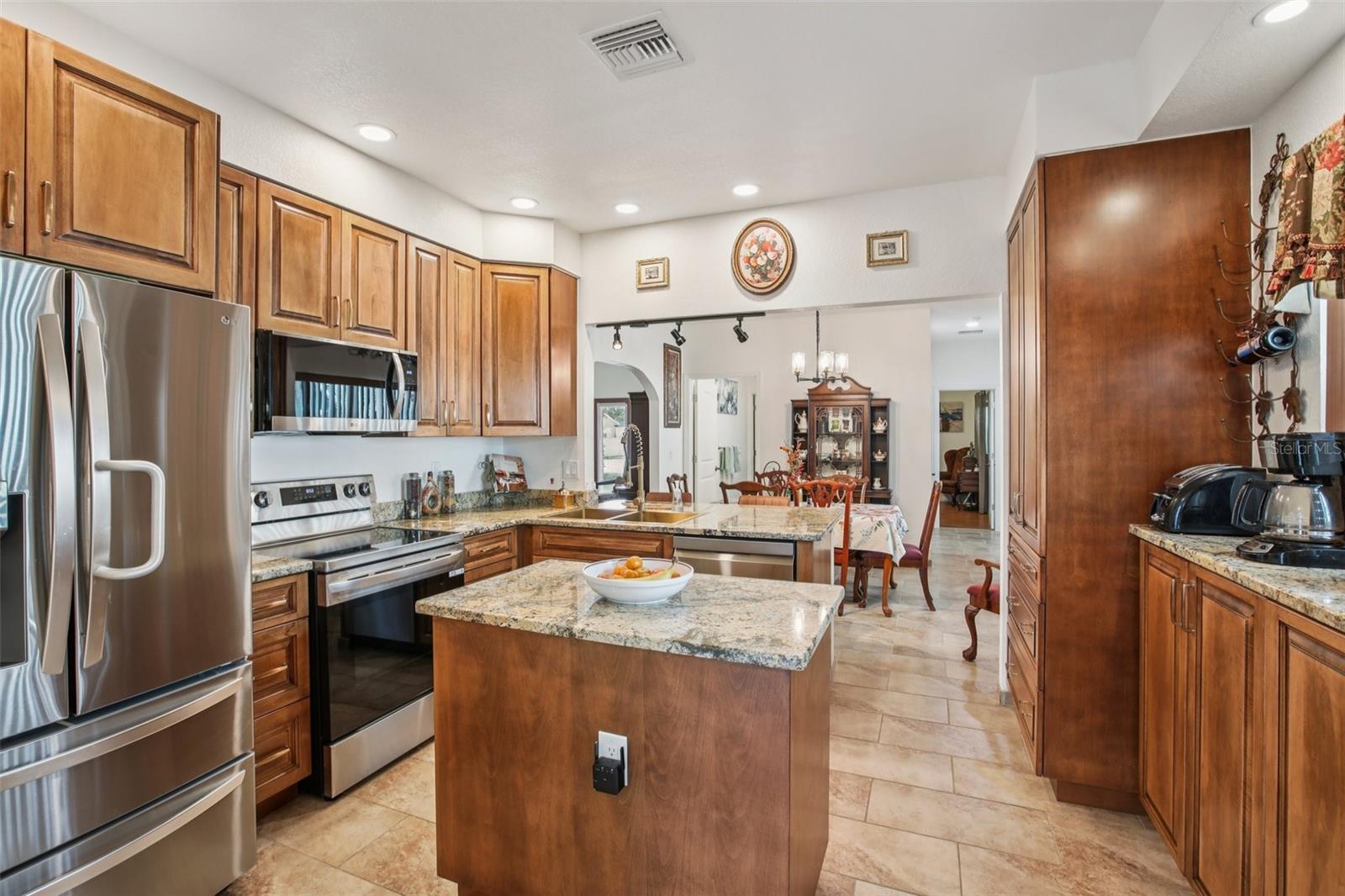 Built-in Features, Ceiling Fans(s), High Ceilings, Kitchen/Family Room Combo, Living Room/Dining Room Combo, Open Floorplan, Other, Solid Surface Counters, Solid Wood Cabinets, Split Bedroom, Stone Counters, Thermostat, Walk-In Closet(s)