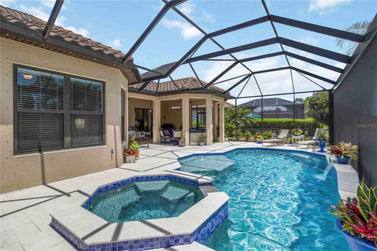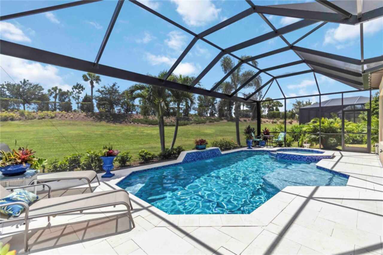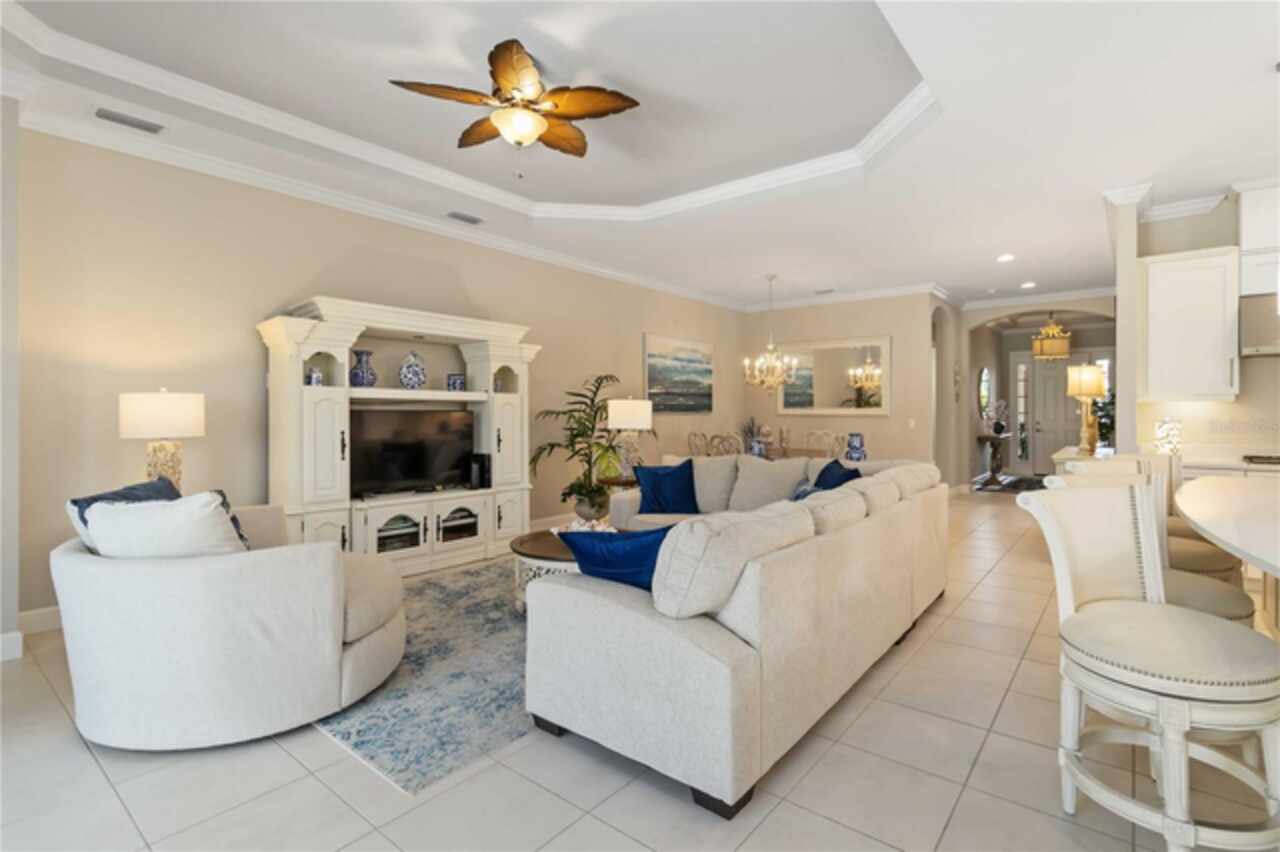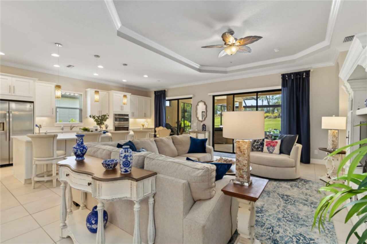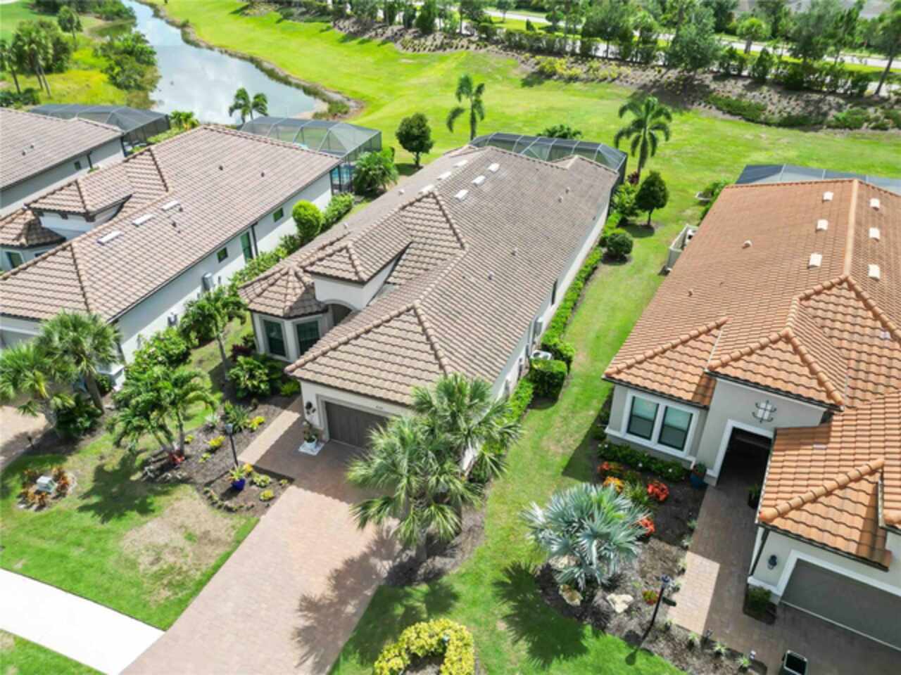 GOLF – SALT POOL – SUNSET Extended Lazio home in ESPLANADE with NEW Laminate floors in all bedrooms! Welcome to 4540 Terrazza Court, a beautifully maintained Lazio golf home on a spectacular lot in Esplanade at Lakewood Ranch, offering peaceful water views on one side and a lush panorama of towering palms and vibrant greenery from the lanai. Inside, this 3-bedroom, 3-bath home with an extended kitchen and flex study room offers a clean slate to make your own. The neutral palette, open layout, and inviting flow provide endless opportunities to design and personalize the space around your lifestyle. Designed for entertaining, the expanded travertine lanai sets the scene with a sparkling pool, relaxing spa, and waterfall feature—perfect for sunset gatherings or quiet mornings with coffee. Already plumbed for an outdoor kitchen so make it your own! The curated garden menagerie brings a storybook feel to your outdoor escape. Esplanade at Lakewood Ranch is a gated community offering a range of amenities including two fitness centers, full-service spa, bocce ball, pickleball courts, tennis club, fitness classes, walking trails, dog park, culinary center/club house, resort-style pool with private cabanas, resistance pool, and a full-service tiki bar and restaurant. This is a golf-deeded home. Bring your best offer — seller is motivated and ready to move!