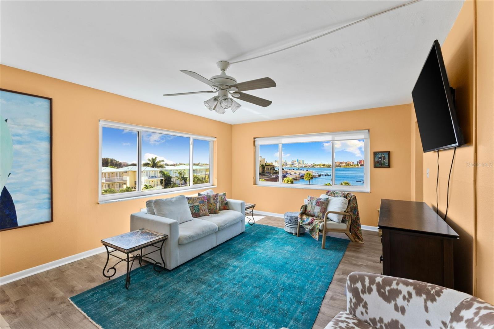 Incredible opportunity to own a desirable end unit in the Washington Tower on the fifth floor! When you enter through the front door, you are greeted with open water west views, which include beautiful sunsets all year round. Open concept living with dining off the kitchen so you can enjoy the view through the living room windows. An additional feature of the windows is they are hurricane impact-resistant (PGT Fl 1435.5, 1844.3 FL 242.7 FL239.7: Installed by StormFitters). The windows also all have treatments that roll down. There are generously sized bedrooms with walk-in closets as well as two spacious baths. This unit has preferred parking near the building, space #501. The grounds of the community are immaculately maintained and include an abundance of amenities including tennis, a shuffleboard court, a putting green, two pools both on the waterfront, a billiards room and an active social clubhouse community with indoor pickleball. This is also a 24-hour security gated community. The ideal location is proximal to all shopping, restaurants and beautiful gulf beaches! The monthly HOA fee for this 55-plus community includes cable, internet, escrow reserves, insurance, exterior building and grounds maintenance, outside pest control, on-site manager, water, sewer, trash, recreational amenities and 24-hour security. Roof 2024.