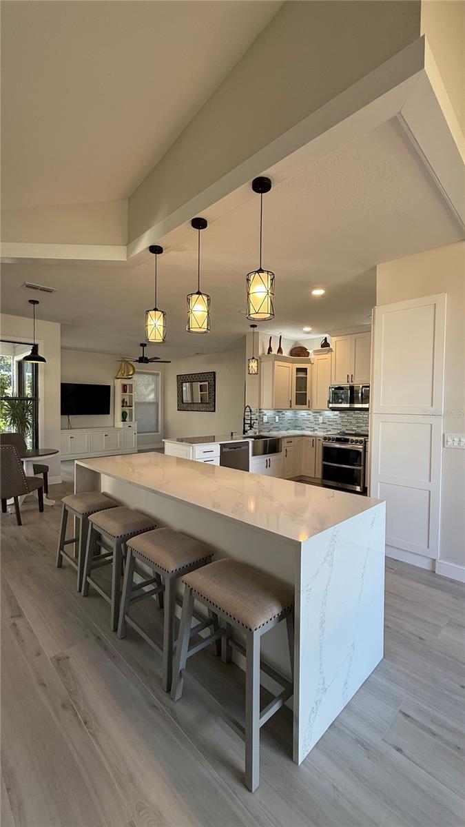 Ceiling Fans(s), Eat-in Kitchen, High Ceilings, Kitchen/Family Room Combo, Living Room/Dining Room Combo, Open Floorplan, Solid Wood Cabinets, Stone Counters, Thermostat, Vaulted Ceiling(s)