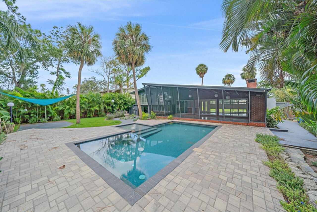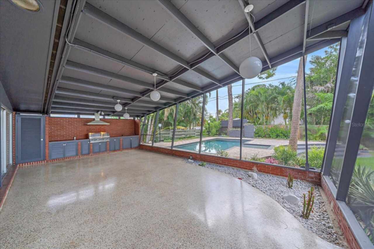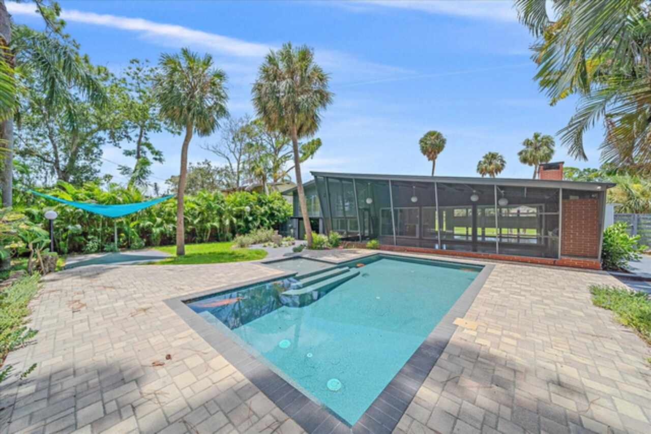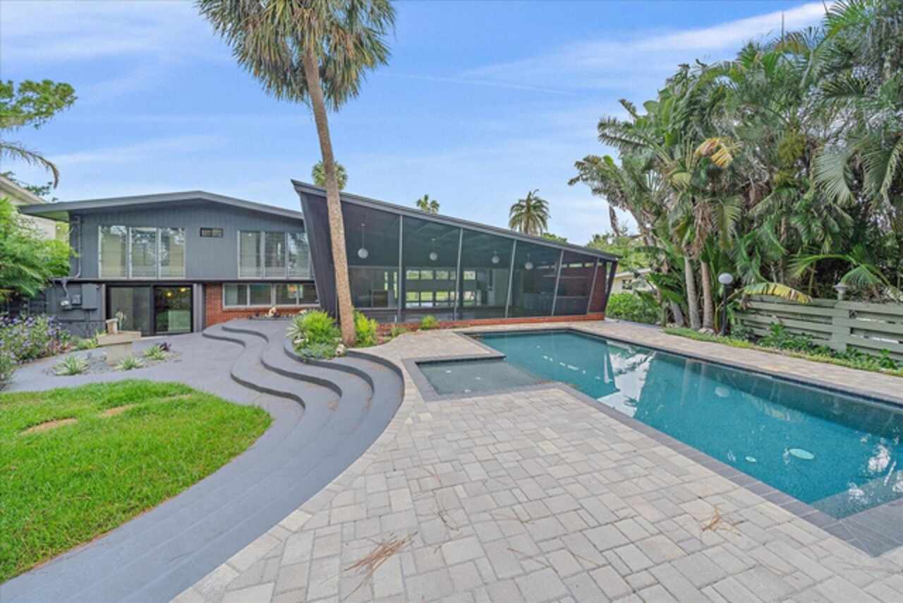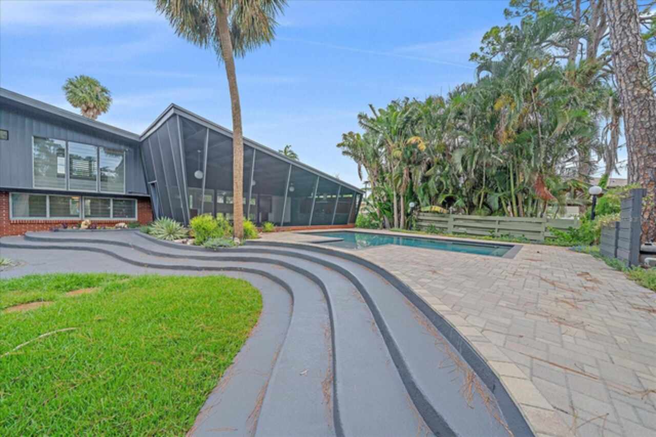Under contract-accepting backup offers. **Priced below recently appraised value** Designed by the famed architect, Glen Q. Johnson, this Mid-Century Modern Bird Cage Home is one of only 13 unique homes built in the area. Known for his work in designing the St Pete Beach Library, the North Shore Aquatic Center, and the Pinellas County Judicial Building, Glen Q. Johnson, designed these “Vision-Aire” homes to provide comfort in the tropical Florida weather. Each home featured a unique floor plan and were oriented to the Southeast in order to best catch the breezes from nearby waterways. The Birdcage nickname comes from the floor-to-roofline screened terraces providing the ultimate amount of comfort and style while enjoying the Florida weather. The home itself has been tastefully updated while taking careful consideration to preserve the original design and “feel” of the home. This particular home features 3 bedrooms, 2 bathrooms and 1869 square feet of heated/cooled living space. The main living area features beautifully restored terrazzo floors, a wood burning fireplace, and a completely redone modern kitchen all overlooking the massive outdoor patio space, outdoor kitchen, and beautiful saltwater pool. The primary is located on the second floor and has access out to the refinished private deck. The downstairs suite features a kitchenette, own private entrance, and independent mini-split air conditioning units making it the perfect guest suite, in-law suite, or vacation rental. An additional bonus room provides even more flexibility for those looking for an office space or workout room. Outside the home you are greeted by a gorgeous private oasis featuring mature landscaping, a saltwater pool with pavers, a free standing fountain and multiple covered seating areas. Providing further peace of mind is the new roof in 2023, new HVAC in 2024, and new water heater in 2024. Located in close proximity to downtown Saint Petersburg, world renowned Florida beaches, local boat ramps, parks, and much more, this unique home is surely a dream come true.