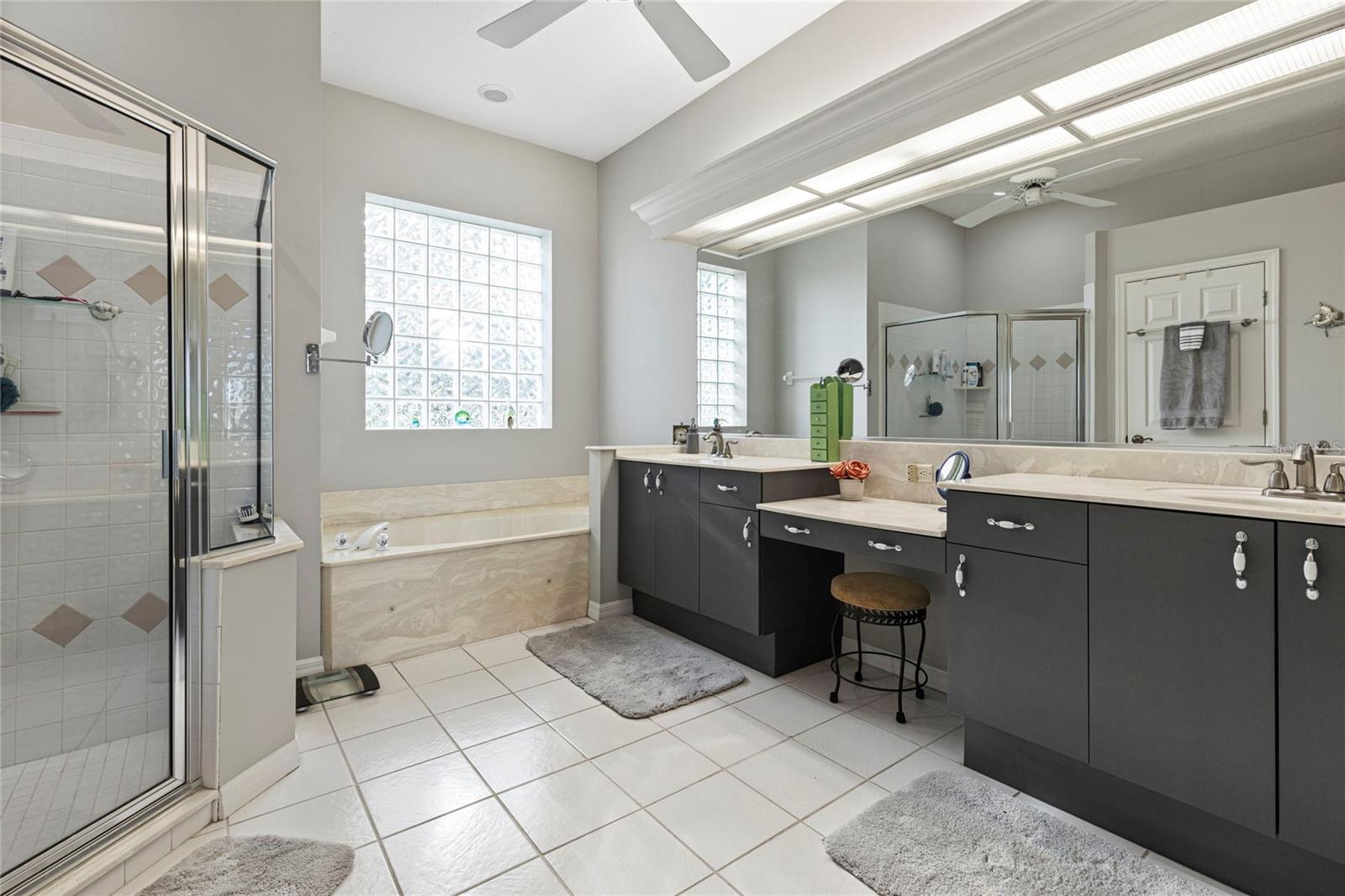 Ceiling Fans(s), Crown Molding, High Ceilings, Primary Bedroom Main Floor, Split Bedroom, Stone Counters, Tray Ceiling(s), Walk-In Closet(s), Window Treatments