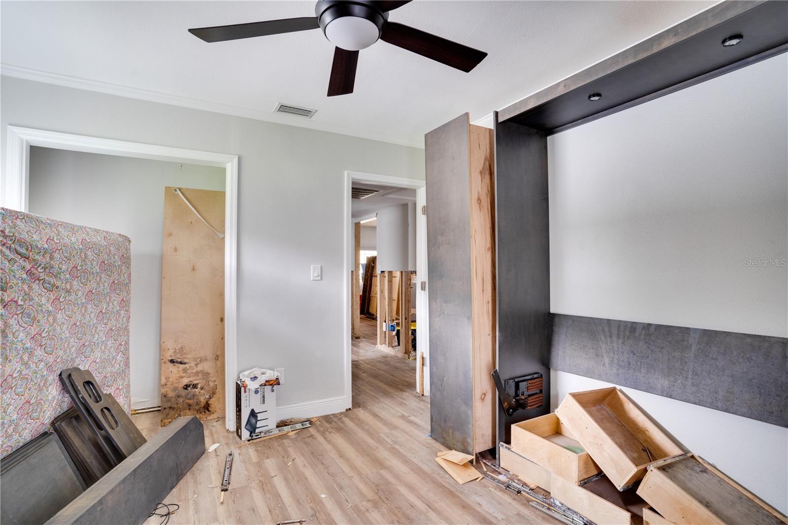 Built-in Features, Ceiling Fans(s), Primary Bedroom Main Floor, Solid Surface Counters, Solid Wood Cabinets, Window Treatments