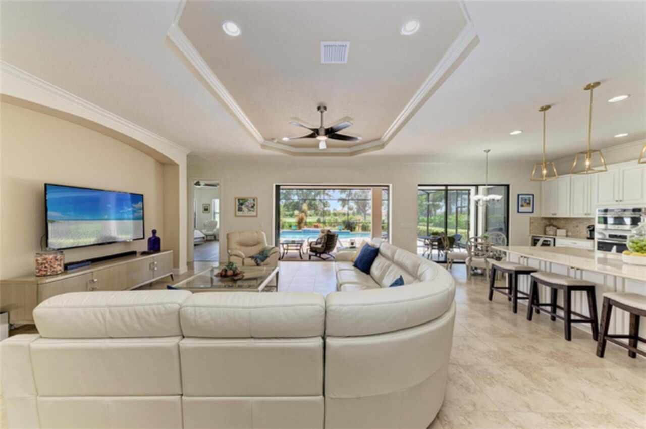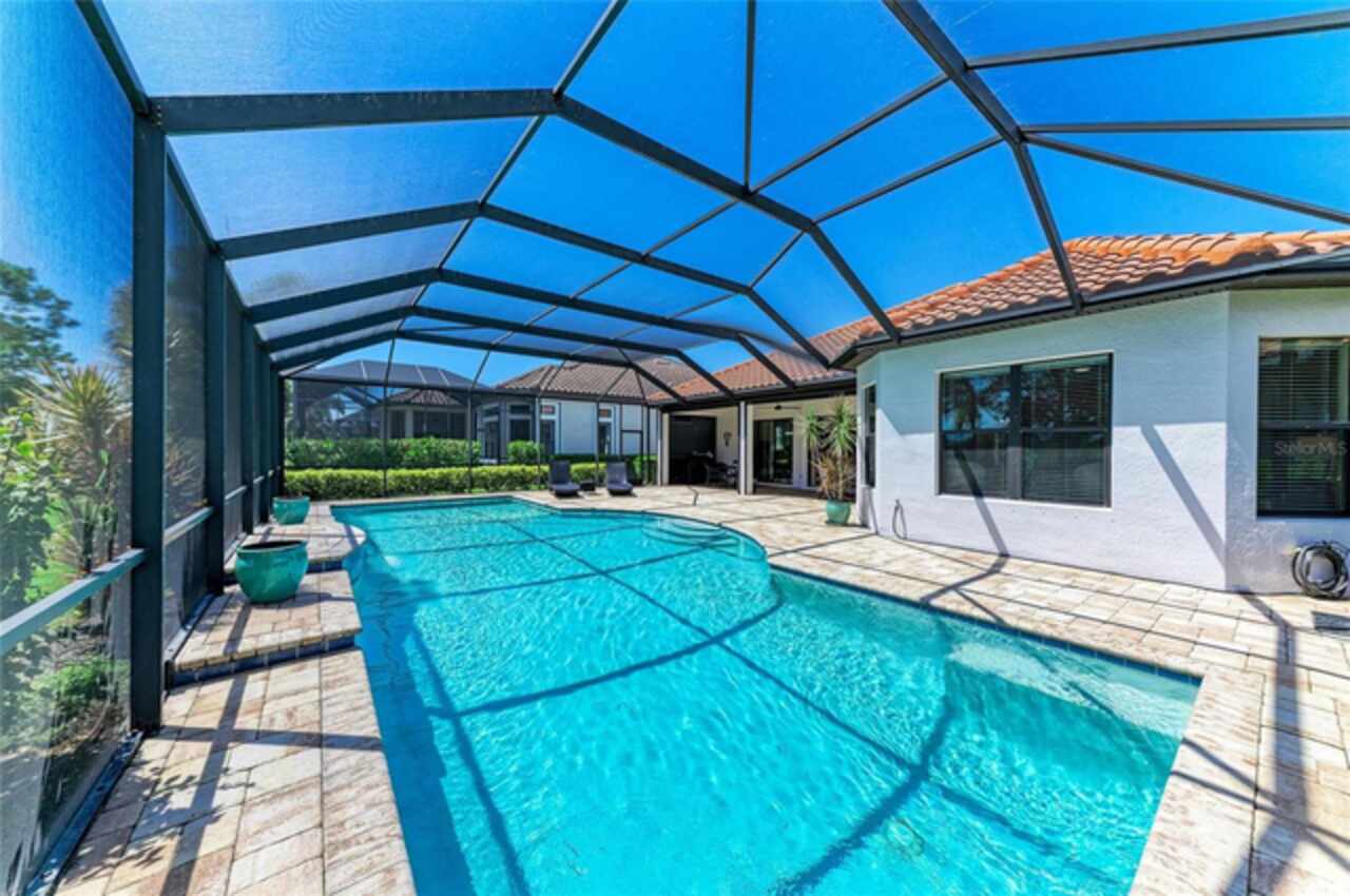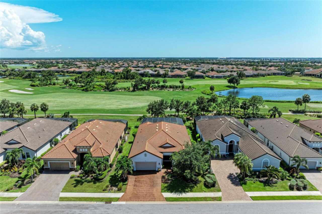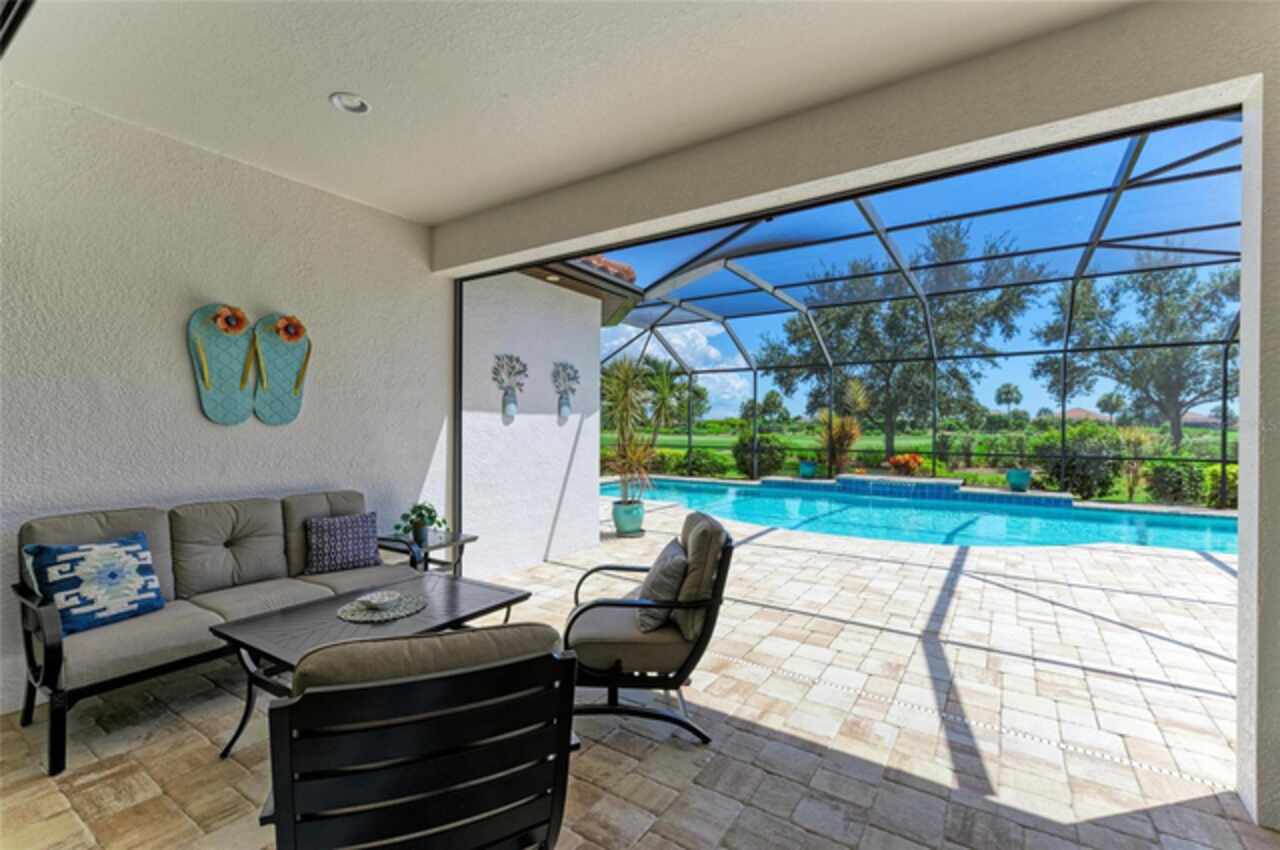 MAJOR PRICE REDUCTION ($300, 000 in SAVINGS) PLUS A REGISTERED GOLF CART INCLUDED ($20k retail value) PLUS PARTIAL FURNITURE PACKAGE – WITH AN ACCEPTABLE CONTRACT BY 12/15/25. Seize this limited time value opportunity to own the LOWEST priced Pallazio pool home on a GOLF-DEEDED LOT with direct views of golf course near hole #1 in Esplanade Golf & Country at Lakewood Ranch! True Play-In, Play-Out Convenience, here you can take advantage of the recent updates including NEW exterior and interior paint, NEW upgraded landscaping, and NEW LED lighting. This highly sought-after floor plan offers breathtaking southern exposure overlooking lush fairways. Enter through the grand double doors into a foyer with adorned columns, a tray ceiling, and soaring ceilings that flow into the expansive open-concept great room. Crown molding and disappearing pocket sliders fill the space with natural light and open to the lanai, showcasing an impressive 40-foot pool perfect for swimming laps or relaxing. The gourmet kitchen features Cambria quartz countertops, a crema Marfil marble backsplash, stainless steel appliances including a natural gas cooktop and built-in oven, a wine refrigerator, and an oversized island with chic pendant lighting, ample storage, and generous workspace. The extended kitchen offers a separate breakfast area opens to the lanai, enhancing the home’s indoor-outdoor flow. The extended primary suite is privately located and offers a spa-like en-suite bath with dual sinks, frameless glass shower, soaking tub, private water closet, and a large walk-in closet. Two guest bedrooms provide comfort and privacy—one with an en-suite bath featuring a frameless glass shower and quartz countertops, and the other with access to a full bath with quartz countertops and a shower/tub combination. A generously sized study/den with double doors offers flexible use and can easily serve as a 4th bedroom. The extended screened lanai includes a large, covered area, expansive paver deck, and sweeping golf course views, with motorized hurricane Kevlar screens for added convenience. The professionally extended driveway accommodates 3-cars, and the epoxy-floored garage includes overhead storage racks. Additional features include a newer washer and dryer in the spacious laundry room with a utility sink, under-cabinet storage, and drop zone. Esplanade’s amenities include an 18-hole championship golf course, tennis and pickleball courts, two fitness centers, two resort-style pools, a full-service spa and salon, on-site dining at the Bahama Bar and Barrel House Bistro, bocce ball, a bark park, and an active social calendar. Lawn maintenance is included in the HOA fees. Located in Lakewood Ranch, near University Town Center, Sarasota Polo Club, farmers’ markets, trails, parks, award-winning beaches, and SRQ and TPA airports, this home offers the best of Florida living. This is a rare, limited-time opportunity to own at an amazing price in a fully built-out, established neighborhood—no new construction, no disruptions, just a beautiful home ready for your enjoyment.