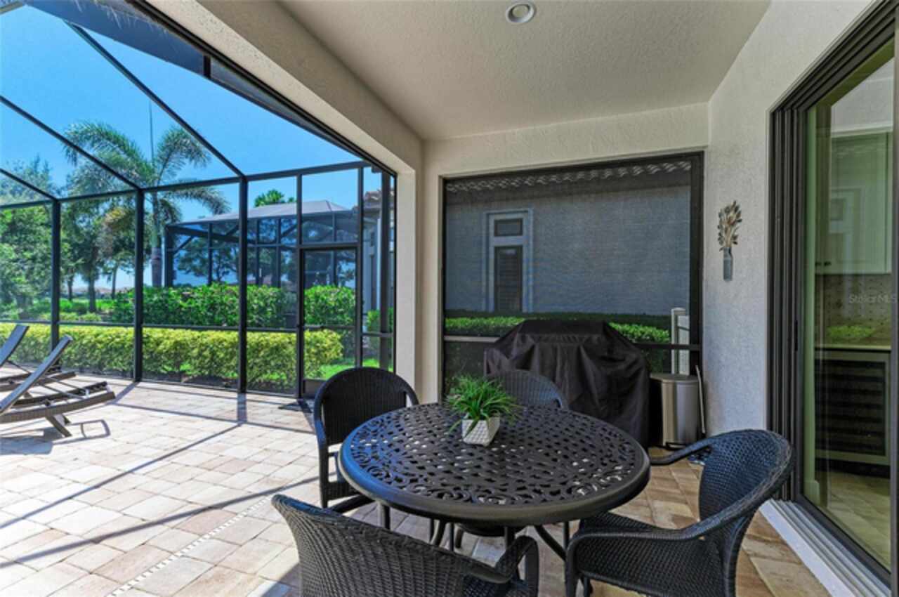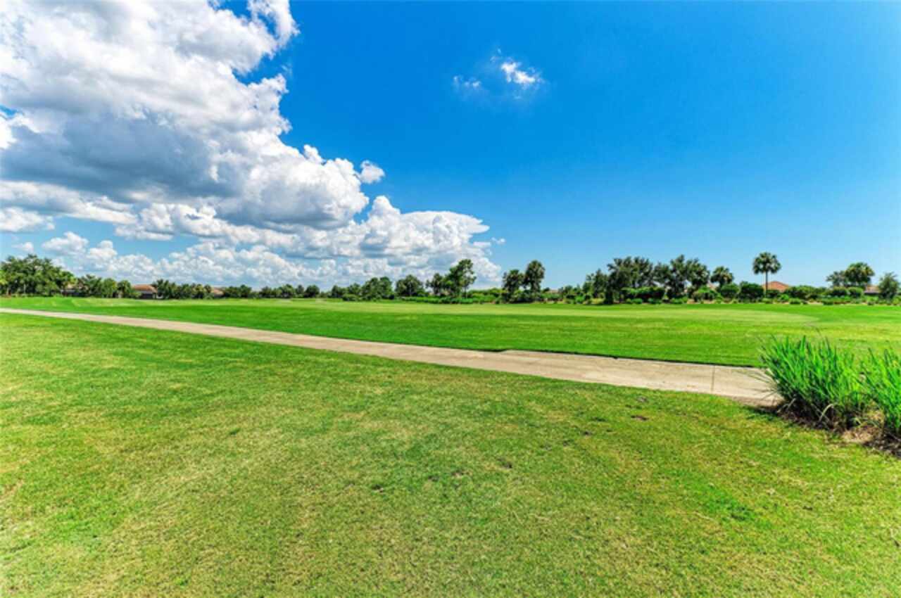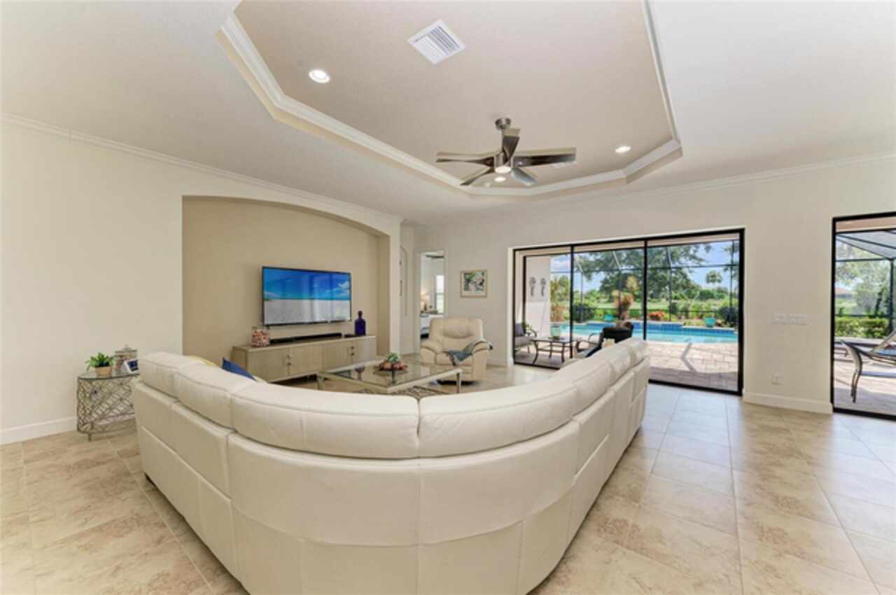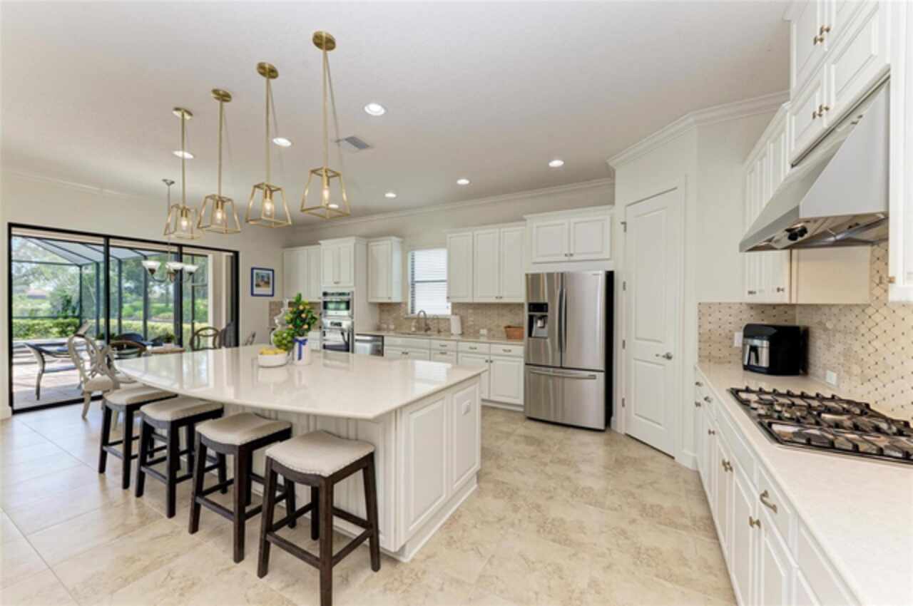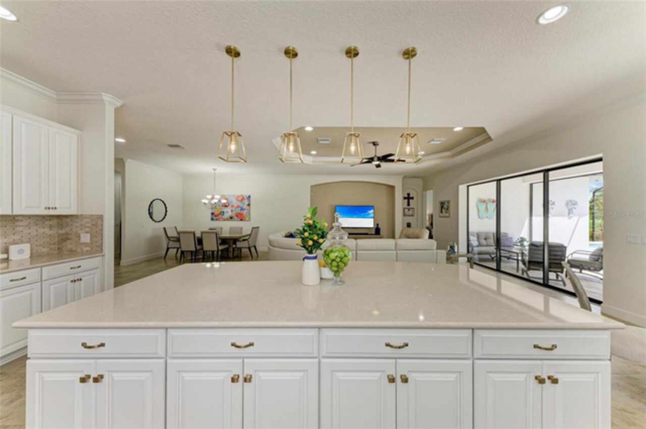 MAJOR PRICE REDUCTION ($300, 000 in SAVINGS) PLUS A REGISTERED GOLF CART INCLUDED ($20k retail value) PLUS PARTIAL FURNITURE PACKAGE – WITH AN ACCEPTABLE CONTRACT BY 12/15/25. Seize this limited time value opportunity to own the LOWEST priced Pallazio pool home on a GOLF-DEEDED LOT with direct views of golf course near hole #1 in Esplanade Golf & Country at Lakewood Ranch! True Play-In, Play-Out Convenience, here you can take advantage of the recent updates including NEW exterior and interior paint, NEW upgraded landscaping, and NEW LED lighting. This highly sought-after floor plan offers breathtaking southern exposure overlooking lush fairways. Enter through the grand double doors into a foyer with adorned columns, a tray ceiling, and soaring ceilings that flow into the expansive open-concept great room. Crown molding and disappearing pocket sliders fill the space with natural light and open to the lanai, showcasing an impressive 40-foot pool perfect for swimming laps or relaxing. The gourmet kitchen features Cambria quartz countertops, a crema Marfil marble backsplash, stainless steel appliances including a natural gas cooktop and built-in oven, a wine refrigerator, and an oversized island with chic pendant lighting, ample storage, and generous workspace. The extended kitchen offers a separate breakfast area opens to the lanai, enhancing the home’s indoor-outdoor flow. The extended primary suite is privately located and offers a spa-like en-suite bath with dual sinks, frameless glass shower, soaking tub, private water closet, and a large walk-in closet. Two guest bedrooms provide comfort and privacy—one with an en-suite bath featuring a frameless glass shower and quartz countertops, and the other with access to a full bath with quartz countertops and a shower/tub combination. A generously sized study/den with double doors offers flexible use and can easily serve as a 4th bedroom. The extended screened lanai includes a large, covered area, expansive paver deck, and sweeping golf course views, with motorized hurricane Kevlar screens for added convenience. The professionally extended driveway accommodates 3-cars, and the epoxy-floored garage includes overhead storage racks. Additional features include a newer washer and dryer in the spacious laundry room with a utility sink, under-cabinet storage, and drop zone. Esplanade’s amenities include an 18-hole championship golf course, tennis and pickleball courts, two fitness centers, two resort-style pools, a full-service spa and salon, on-site dining at the Bahama Bar and Barrel House Bistro, bocce ball, a bark park, and an active social calendar. Lawn maintenance is included in the HOA fees. Located in Lakewood Ranch, near University Town Center, Sarasota Polo Club, farmers’ markets, trails, parks, award-winning beaches, and SRQ and TPA airports, this home offers the best of Florida living. This is a rare, limited-time opportunity to own at an amazing price in a fully built-out, established neighborhood—no new construction, no disruptions, just a beautiful home ready for your enjoyment.