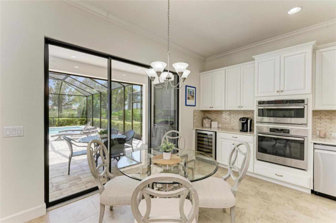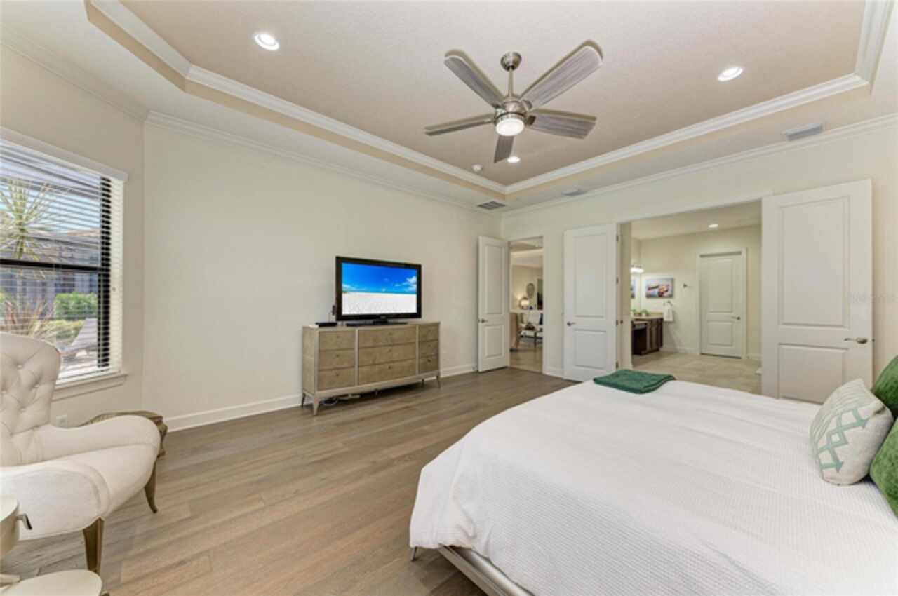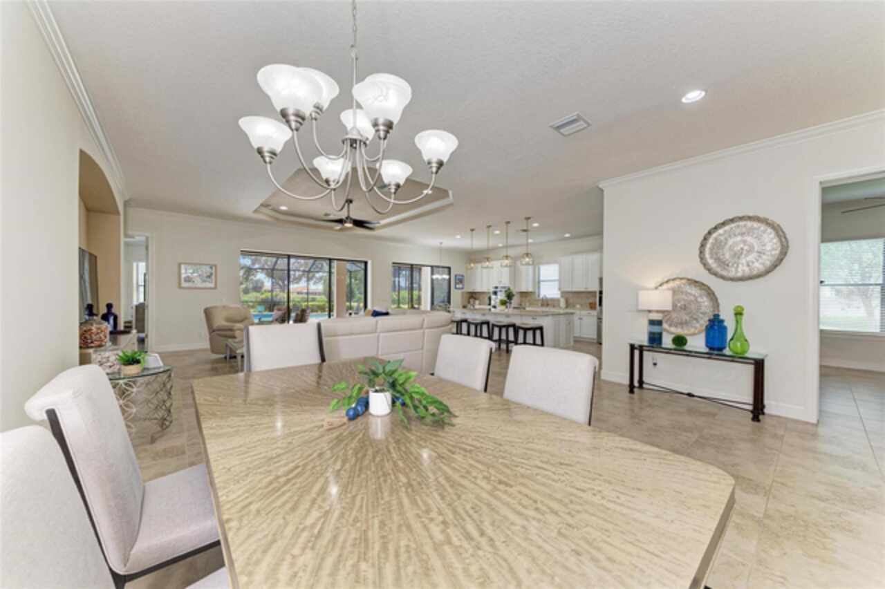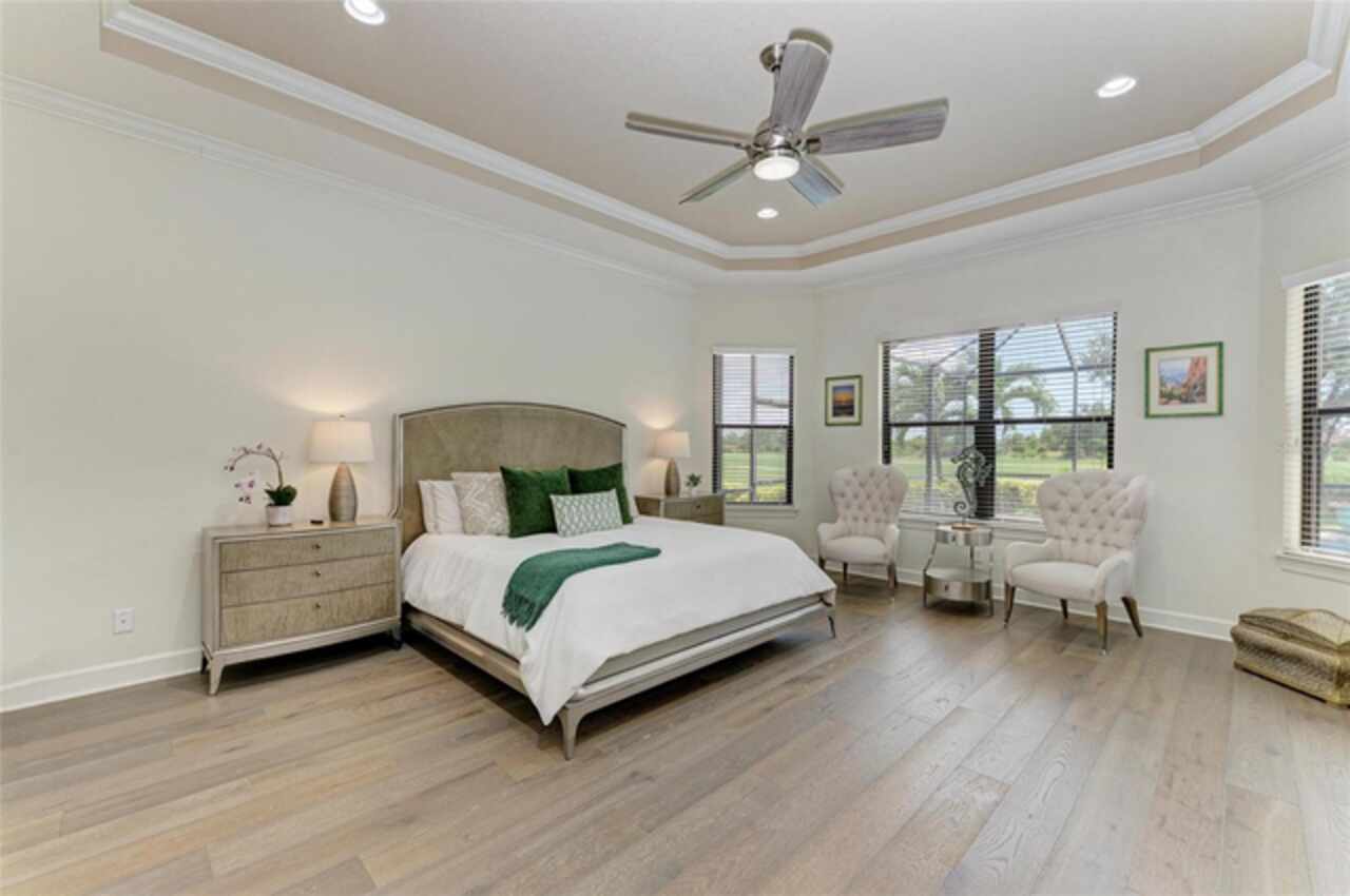MAJOR PRICE REDUCTION ($300, 000 in SAVINGS) PLUS A REGISTERED GOLF CART INCLUDED ($20k retail value) PLUS PARTIAL FURNITURE PACKAGE – WITH AN ACCEPTABLE CONTRACT BY 12/15/25. Seize this limited time value opportunity to own the LOWEST priced Pallazio pool home on a GOLF-DEEDED LOT with direct views of golf course near hole #1 in Esplanade Golf & Country at Lakewood Ranch! True Play-In, Play-Out Convenience, here you can take advantage of the recent updates including NEW exterior and interior paint, NEW upgraded landscaping, and NEW LED lighting. This highly sought-after floor plan offers breathtaking southern exposure overlooking lush fairways. Enter through the grand double doors into a foyer with adorned columns, a tray ceiling, and soaring ceilings that flow into the expansive open-concept great room. Crown molding and disappearing pocket sliders fill the space with natural light and open to the lanai, showcasing an impressive 40-foot pool perfect for swimming laps or relaxing. The gourmet kitchen features Cambria quartz countertops, a crema Marfil marble backsplash, stainless steel appliances including a natural gas cooktop and built-in oven, a wine refrigerator, and an oversized island with chic pendant lighting, ample storage, and generous workspace. The extended kitchen offers a separate breakfast area opens to the lanai, enhancing the home’s indoor-outdoor flow. The extended primary suite is privately located and offers a spa-like en-suite bath with dual sinks, frameless glass shower, soaking tub, private water closet, and a large walk-in closet. Two guest bedrooms provide comfort and privacy—one with an en-suite bath featuring a frameless glass shower and quartz countertops, and the other with access to a full bath with quartz countertops and a shower/tub combination. A generously sized study/den with double doors offers flexible use and can easily serve as a 4th bedroom. The extended screened lanai includes a large, covered area, expansive paver deck, and sweeping golf course views, with motorized hurricane Kevlar screens for added convenience. The professionally extended driveway accommodates 3-cars, and the epoxy-floored garage includes overhead storage racks. Additional features include a newer washer and dryer in the spacious laundry room with a utility sink, under-cabinet storage, and drop zone. Esplanade’s amenities include an 18-hole championship golf course, tennis and pickleball courts, two fitness centers, two resort-style pools, a full-service spa and salon, on-site dining at the Bahama Bar and Barrel House Bistro, bocce ball, a bark park, and an active social calendar. Lawn maintenance is included in the HOA fees. Located in Lakewood Ranch, near University Town Center, Sarasota Polo Club, farmers’ markets, trails, parks, award-winning beaches, and SRQ and TPA airports, this home offers the best of Florida living. This is a rare, limited-time opportunity to own at an amazing price in a fully built-out, established neighborhood—no new construction, no disruptions, just a beautiful home ready for your enjoyment.