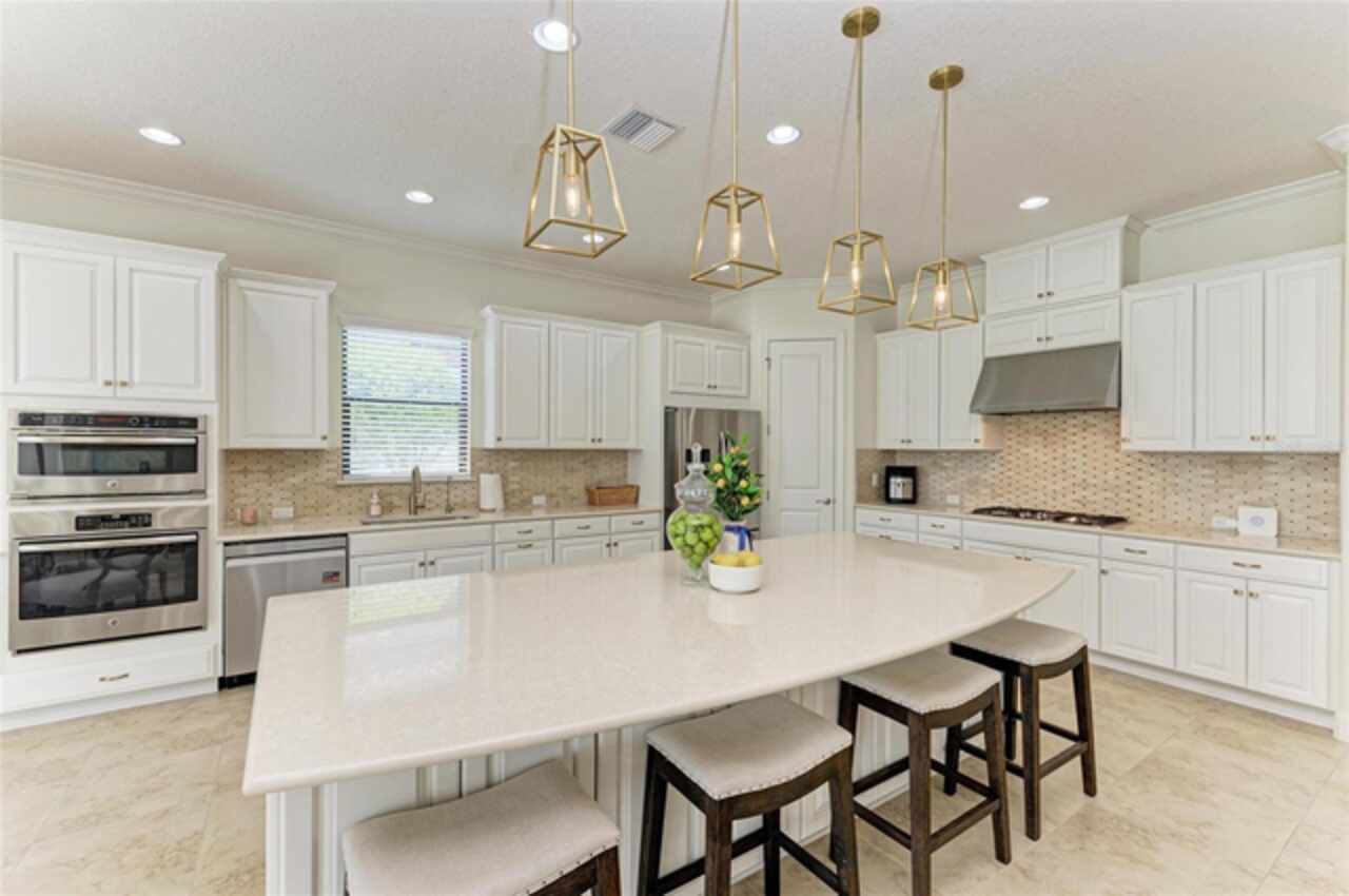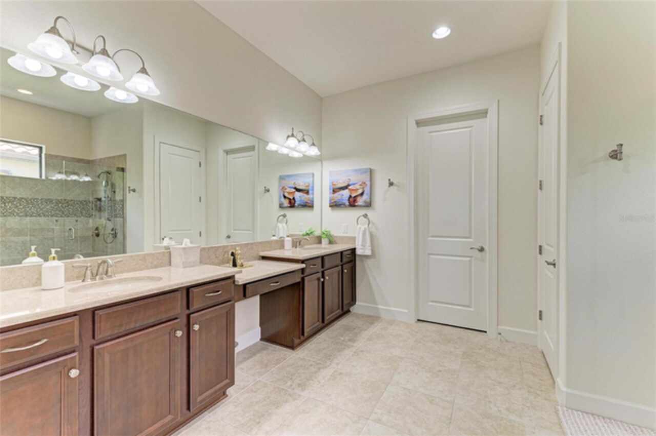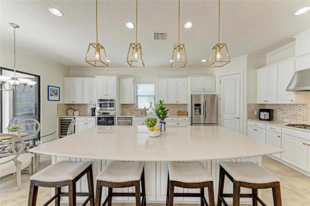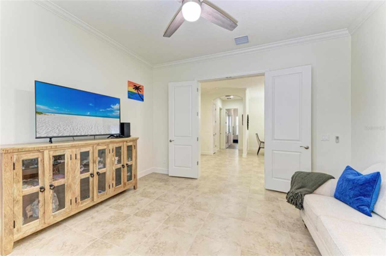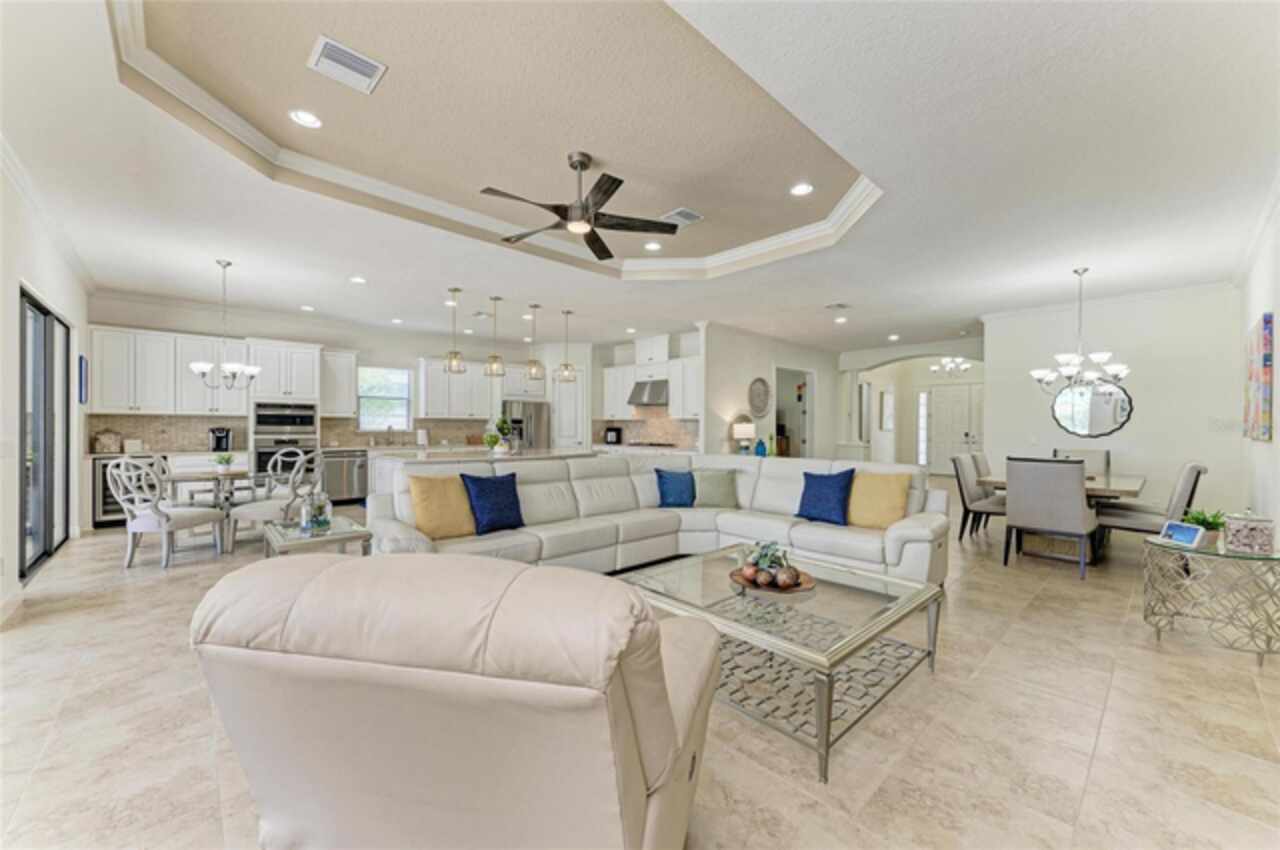 MAJOR PRICE REDUCTION ($300, 000 in SAVINGS) PLUS A REGISTERED GOLF CART INCLUDED ($20k retail value) PLUS PARTIAL FURNITURE PACKAGE – WITH AN ACCEPTABLE CONTRACT BY 12/15/25. Seize this limited time value opportunity to own the LOWEST priced Pallazio pool home on a GOLF-DEEDED LOT with direct views of golf course near hole #1 in Esplanade Golf & Country at Lakewood Ranch! True Play-In, Play-Out Convenience, here you can take advantage of the recent updates including NEW exterior and interior paint, NEW upgraded landscaping, and NEW LED lighting. This highly sought-after floor plan offers breathtaking southern exposure overlooking lush fairways. Enter through the grand double doors into a foyer with adorned columns, a tray ceiling, and soaring ceilings that flow into the expansive open-concept great room. Crown molding and disappearing pocket sliders fill the space with natural light and open to the lanai, showcasing an impressive 40-foot pool perfect for swimming laps or relaxing. The gourmet kitchen features Cambria quartz countertops, a crema Marfil marble backsplash, stainless steel appliances including a natural gas cooktop and built-in oven, a wine refrigerator, and an oversized island with chic pendant lighting, ample storage, and generous workspace. The extended kitchen offers a separate breakfast area opens to the lanai, enhancing the home’s indoor-outdoor flow. The extended primary suite is privately located and offers a spa-like en-suite bath with dual sinks, frameless glass shower, soaking tub, private water closet, and a large walk-in closet. Two guest bedrooms provide comfort and privacy—one with an en-suite bath featuring a frameless glass shower and quartz countertops, and the other with access to a full bath with quartz countertops and a shower/tub combination. A generously sized study/den with double doors offers flexible use and can easily serve as a 4th bedroom. The extended screened lanai includes a large, covered area, expansive paver deck, and sweeping golf course views, with motorized hurricane Kevlar screens for added convenience. The professionally extended driveway accommodates 3-cars, and the epoxy-floored garage includes overhead storage racks. Additional features include a newer washer and dryer in the spacious laundry room with a utility sink, under-cabinet storage, and drop zone. Esplanade’s amenities include an 18-hole championship golf course, tennis and pickleball courts, two fitness centers, two resort-style pools, a full-service spa and salon, on-site dining at the Bahama Bar and Barrel House Bistro, bocce ball, a bark park, and an active social calendar. Lawn maintenance is included in the HOA fees. Located in Lakewood Ranch, near University Town Center, Sarasota Polo Club, farmers’ markets, trails, parks, award-winning beaches, and SRQ and TPA airports, this home offers the best of Florida living. This is a rare, limited-time opportunity to own at an amazing price in a fully built-out, established neighborhood—no new construction, no disruptions, just a beautiful home ready for your enjoyment.