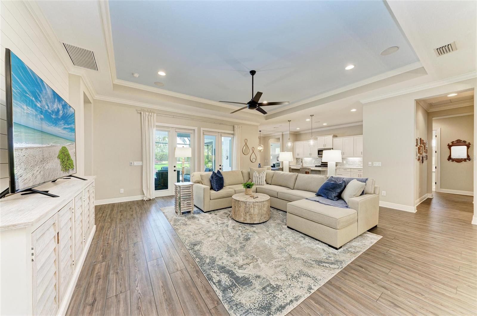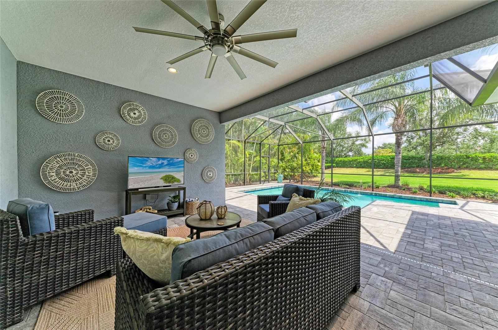 Situated on an oversized lot, with private views, this beautifully upgraded and meticulously maintained Neal built Harmony floor plan offers the perfect blend of luxury, functionality, and resort style living. Located in the maintenance free and privately gated area of Central Park in Lakewood Ranch, the home offers an open floor plan, numerous upgrades, a private back yard - no rear neighbors, heated saltwater pool, and an oversized outdoor living area. The 3-bedroom, 3-bath, 3 car garage, pool home, has a spacious and functional floor plan designed with comfort and style in mind. As you enter the home you’ll be greeted by the open front porch that provides ample space for relaxing and having that casual conversation with the neighbors. Enter the home and begin to enjoy open-concept living! The oversized great room features a tray ceiling with canned lights, ceiling fan, crown molding, ship-lap feature wall, luxury vinyl flooring, and 3 French doors leading to the lanai. Adjacent to the great room is the spacious dining room featuring crown molding, luxury vinyl flooring and updated chandler. To the rear of the great room is the bright, modern kitchen with all new stainless steel appliances, corner pantry, cabinets with roll out shelving, oversized island with new lighting, new kitchen sink and faucet, new tile backsplash with under-counter lighting and luxury vinyl floors. The large primary suite offers a tray ceiling, crown molding, plantation shutters, new carpeting and a ceiling fan plus an renovated spa-like en-suite bath which features new tile floors, new tile 9 ft. shower, corner soaking tub, separate vanities with new lighting and 2 walk-in closets with custom California Closets shelving. The private den/family room combo features 5 ft. double glass doors, luxury vinyl floors, crown molding and a slider that leads you out to your own backyard oasis ideal for relaxing or hosting gatherings year round. The large covered/screened in private lanai with sparkling heated in-ground saltwater pool with new pavers, an outdoor family room w/ceiling fans and gas hook up for the future fire-pit, an outdoor dining area with new ceiling fan, gas and electric hook up for your gas grill or future outdoor kitchen. Back inside the house there’s a convenient pool bath with tile shower, tile floors, and updated vanity, countertop, sink, faucet and lighting. Two additional bedrooms each with crown modeling ceiling fans, plantation shutters, new carpet and custom California closets is served by the 3rd bath featuring tile floors, tile tub/shower combo and new lighting. Convenient laundry room features new tile floors, lighting and laundry sink and cabinetry. This home offers, stylish finishes throughout, a beautiful landscaped lot with irrigation and a 3 car garage. Situated in a family-friendly neighborhood offering parks, playgrounds, walking trails, community pool, fitness center, tennis courts, pickle ball courts and adjacent to top-rated schools, this home blends quality craftsmanship, convenience, and Florida charm. Upgrades: 2024: HVAC, front & rear pavers, 2023: Interior paint, 8 ft solid two panel doors, master bath, California closets, interior lighting, ceiling fans, crown molding, door case molding, ship-lap, stainless steel appliances, kitchen backsplash, laundry room, ceramic flooring, carpeting 2022: exterior paint, luxury vinyl throughout home. OWNER IS A ACTIVE LICENSED AGENT