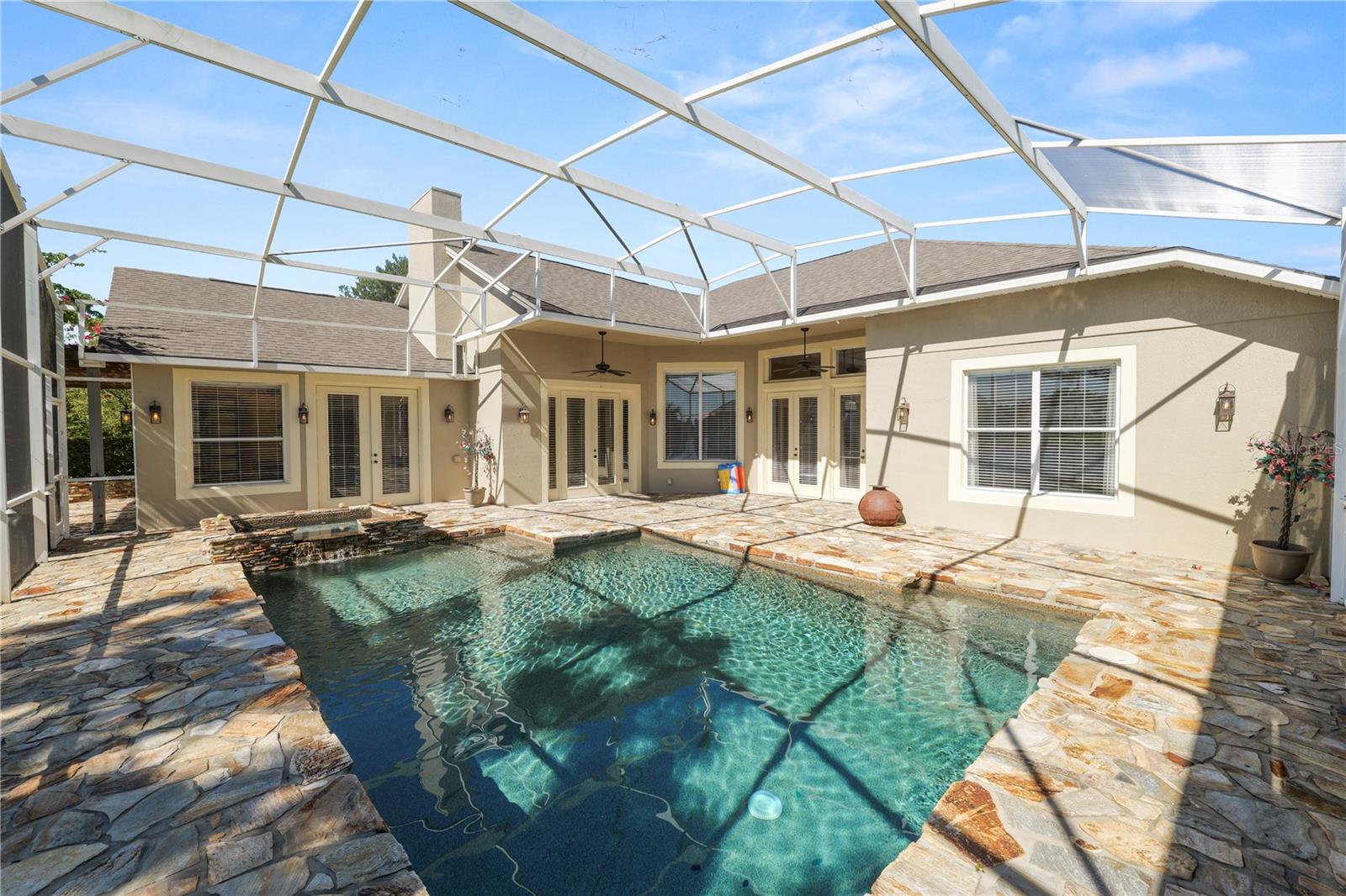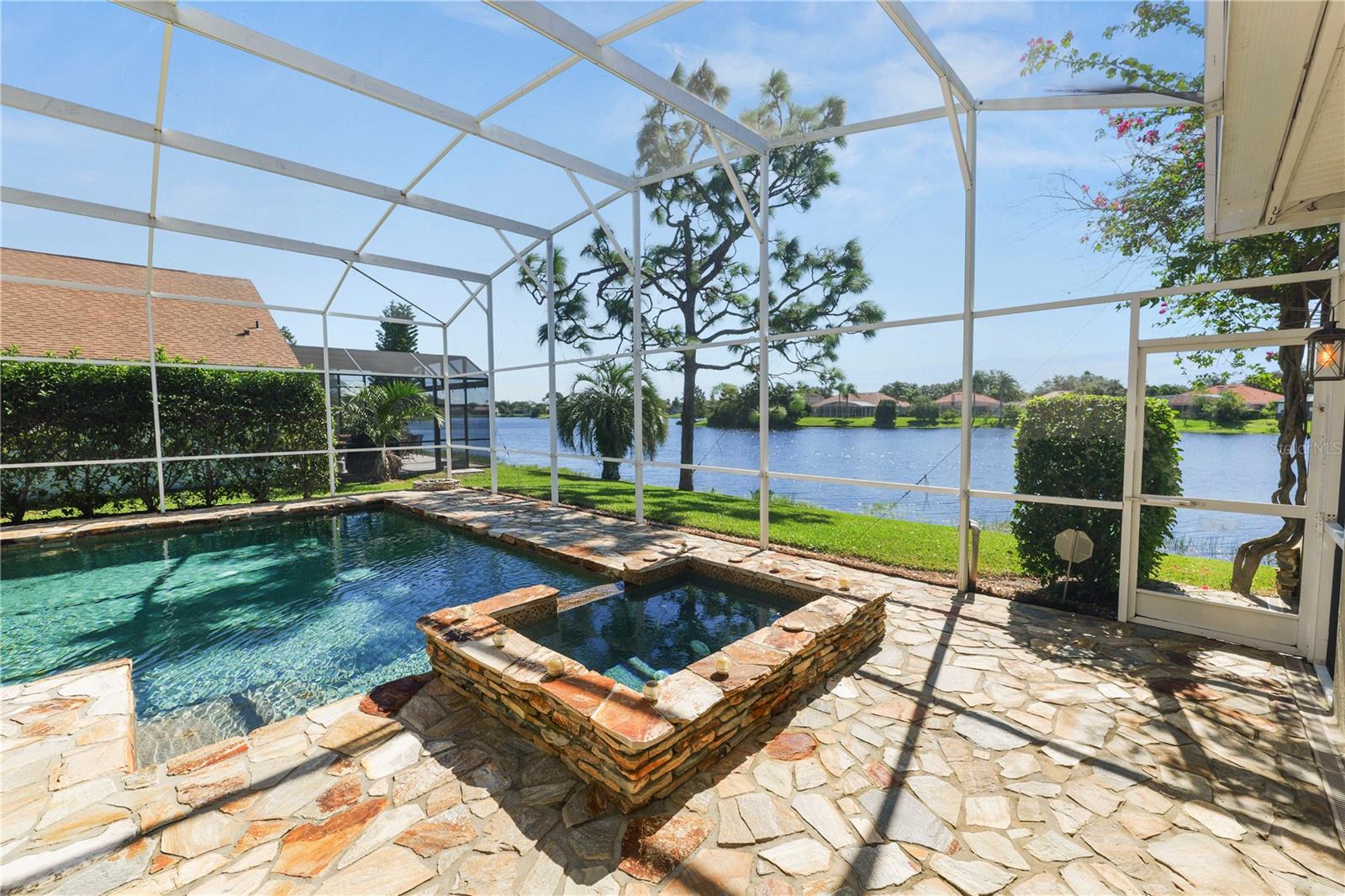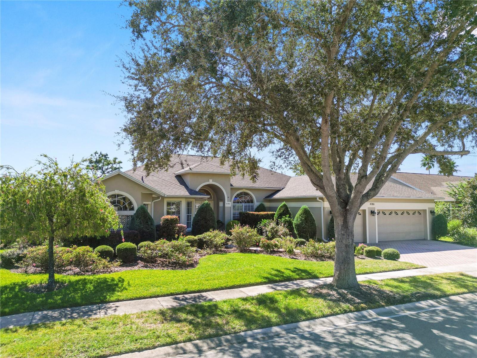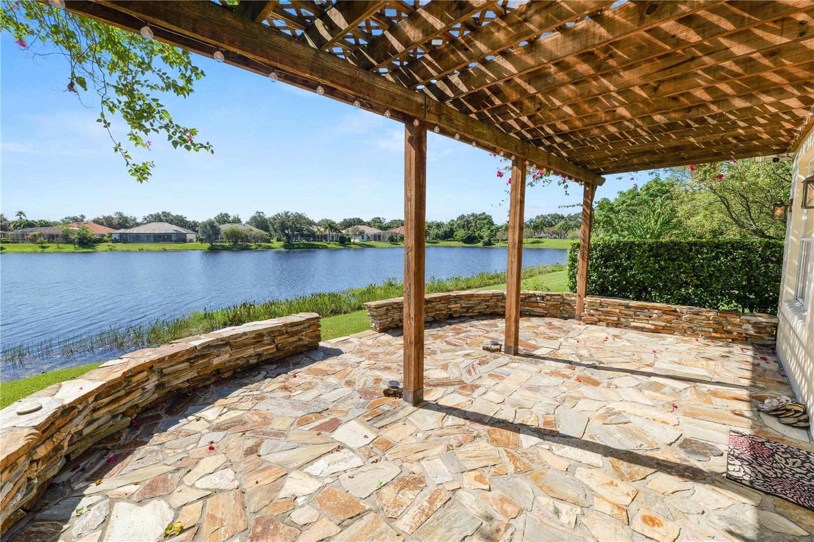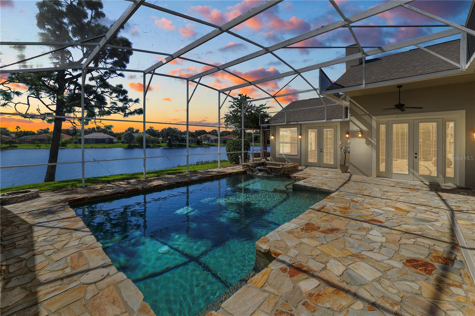 Under contract-accepting backup offers. This lakefront Calabay Cove property has manicured grounds with gorgeous flower gardens in the front and a sparkling pool overlooking the serene waters of Lake Calabay. The 4/5-bedroom home is just as beautiful inside, with tile/wood floors, high ceilings, crown molding and large windows – which let in lots of natural light & showcase the water views. French doors in master bedroom, living room, family room and game room give you easy access to the pool and pergola areas. Just off the foyer, you’ll find the 5th bedroom or use as a dedicated home office, formal living room with French doors accessing the pool area and a formal dining area. At the rear of the floorplan, the family room is open to the kitchen and includes a wood burning fireplace and custom built-ins. The kitchen features shaker cabinetry, granite countertops, pro-style appliances, a center island and a breakfast nook. Just steps away, the backyard oasis includes a covered patio for entertaining, plus a completely screened-in pool & spa surrounded by a stone deck. Outside the enclosure, the pergola-covered patio is lined by another garden and provides a great spot to admire the lake. The back wing of the house has a BONUS recreation/game room with a dry bar and access to the patio and pergola. The spa-like master ensuite includes custom tilework, a double vanity, a soaking tub and a separate shower. Two guest rooms down the hall share an updated Jack & Jill bathroom with all the same high-end finishes found throughout the rest of the home. The laundry room off the 3-car garage also has granite countertops and tons of storage. Calabay Cove is a gated community with easy access to schools, parks, trailheads and highways. Plus, The Loop shopping mall, Publix and numerous dining options are all just 5 minutes from your front door. Less than 20 minutes to the theme parks, 25 minutes to the airport and 1 hr to the beach! Enjoy the most breathtaking sunrise and sunset from the pool and pergola areas. This lovely home's roof was replaced 10/22. Third car garage converted into a workshop with wall-mounted A/C. Pool table in game room remains with the property. Custom designed dinette set with bench also remain.