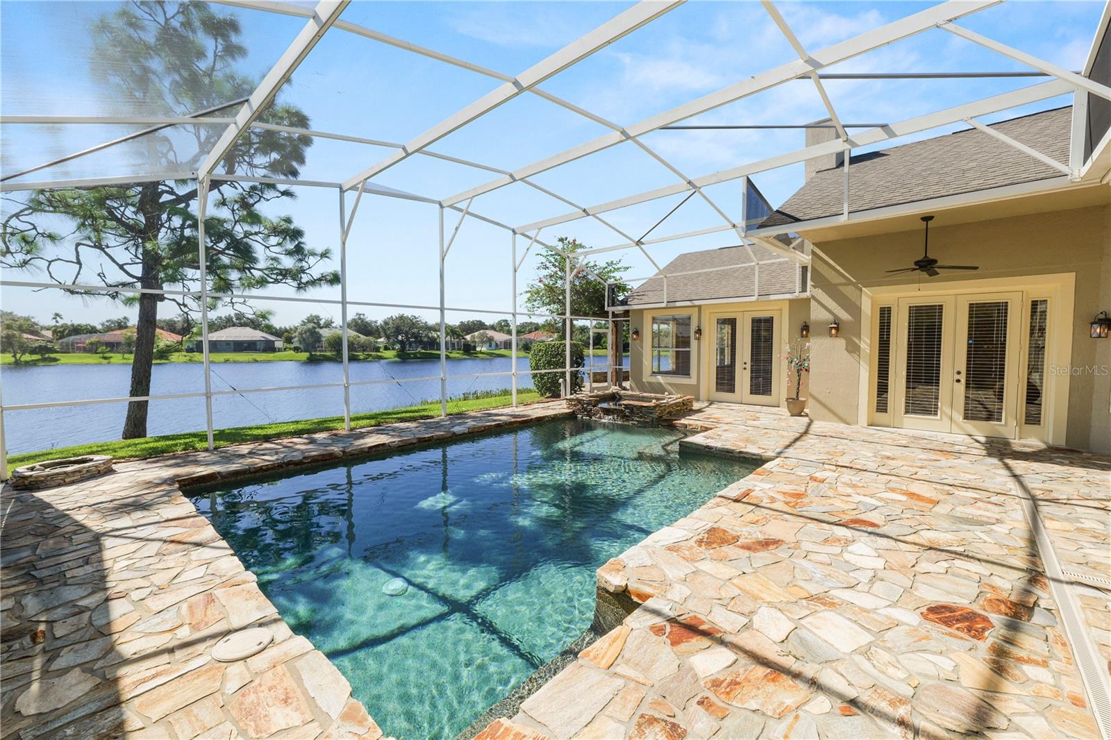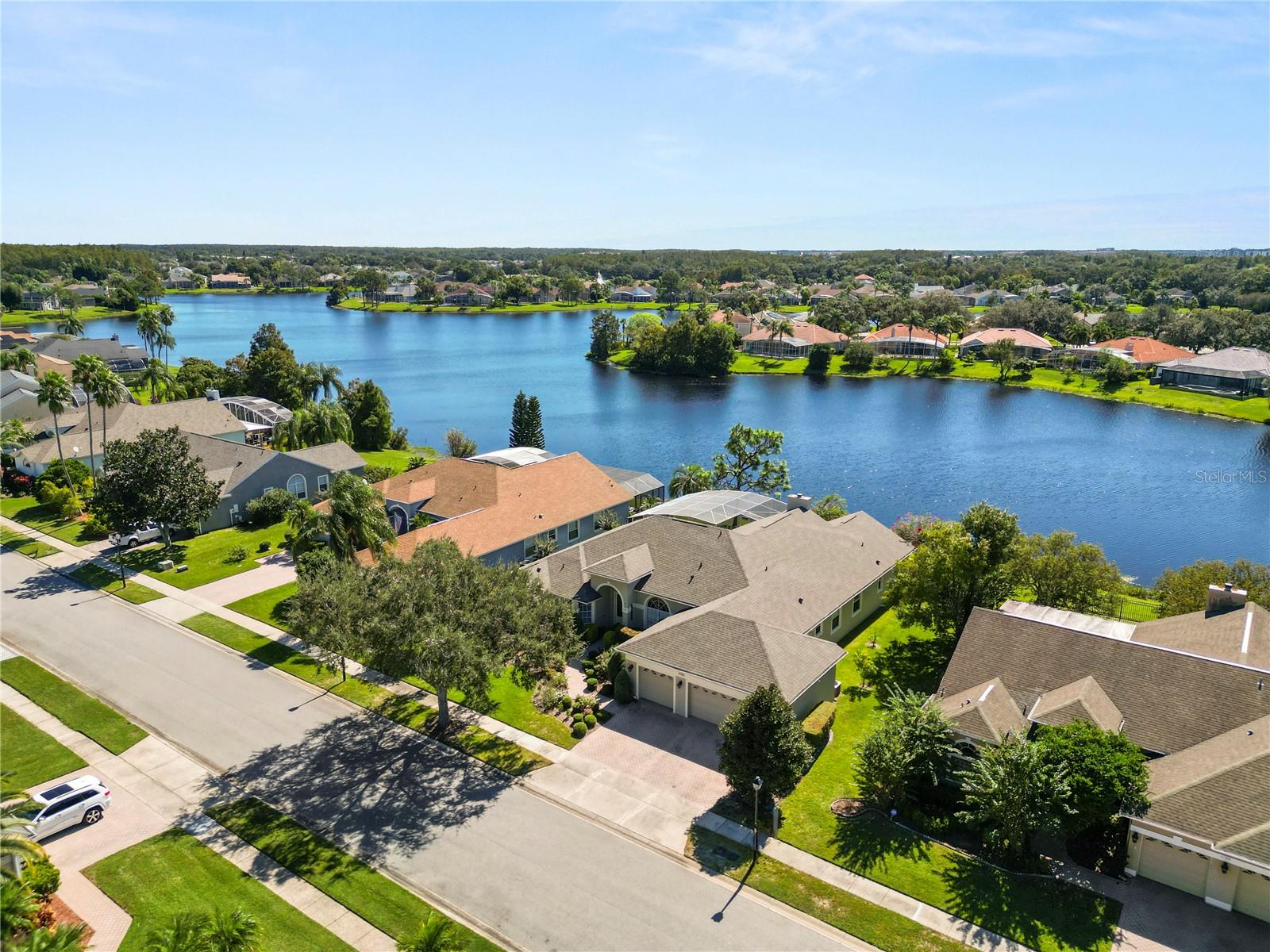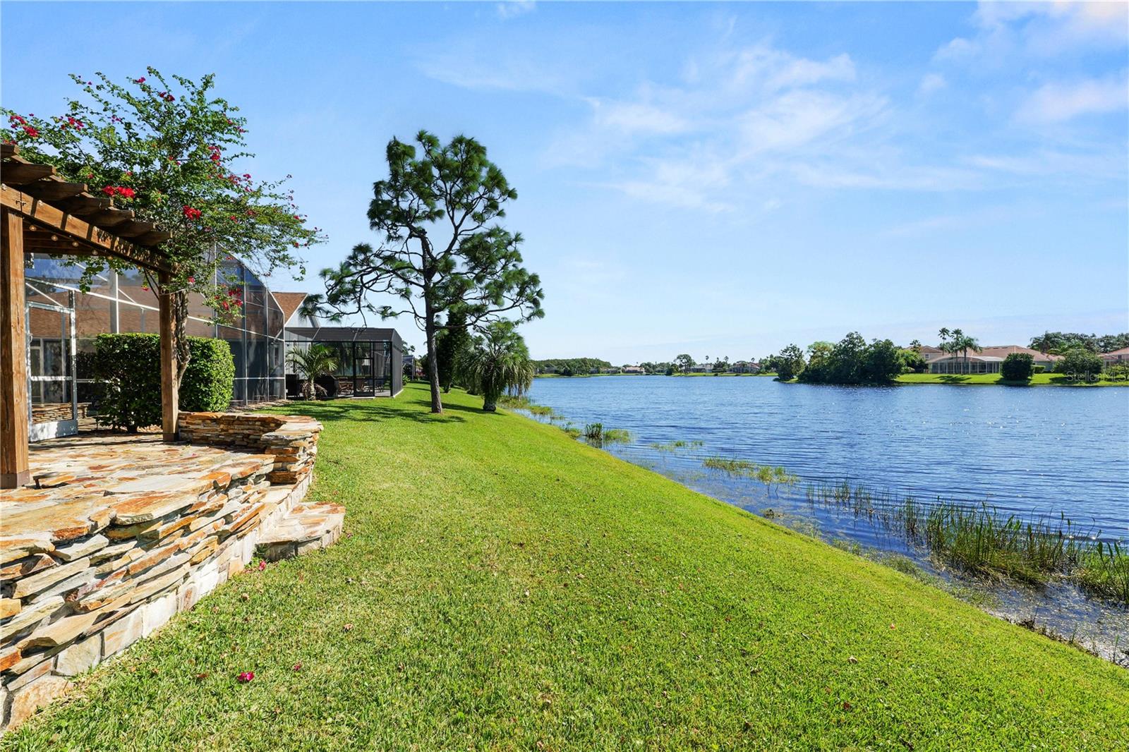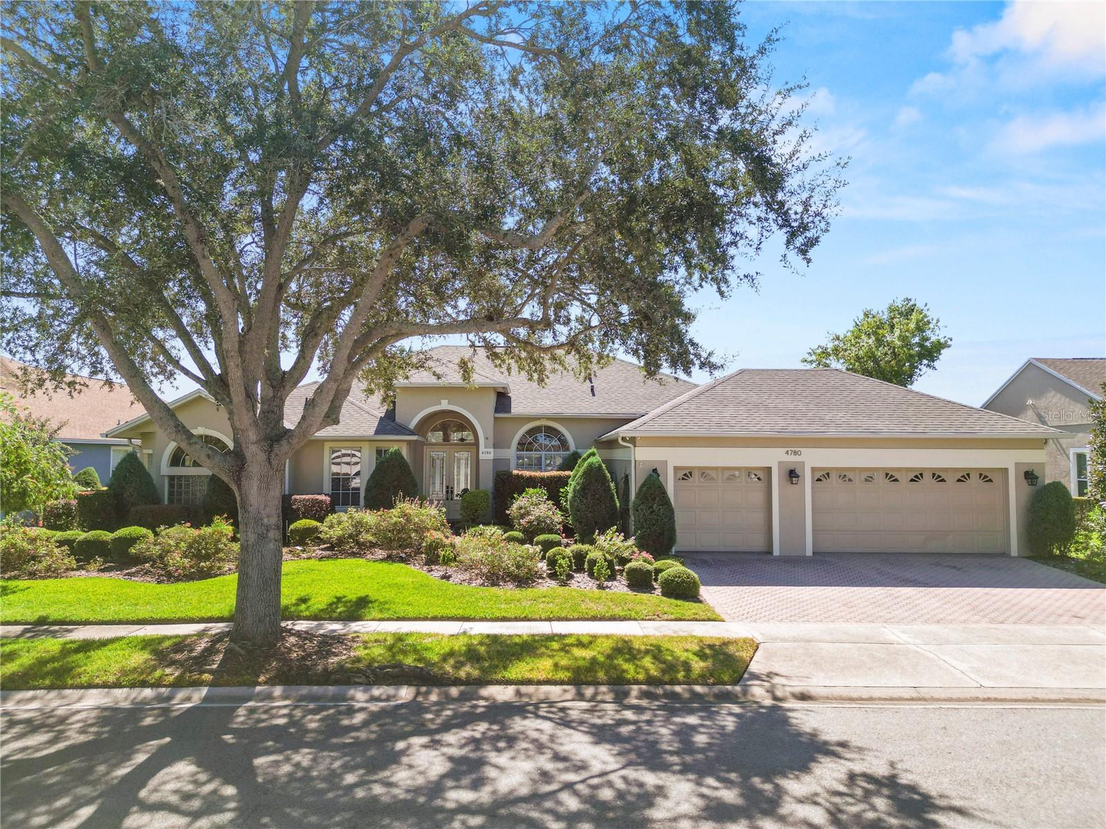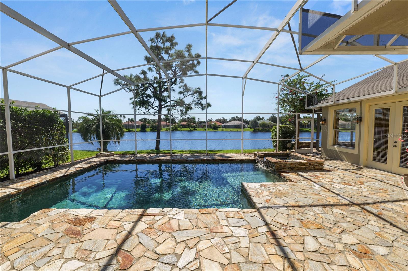 Under contract-accepting backup offers. This lakefront Calabay Cove property has manicured grounds with gorgeous flower gardens in the front and a sparkling pool overlooking the serene waters of Lake Calabay. The 4/5-bedroom home is just as beautiful inside, with tile/wood floors, high ceilings, crown molding and large windows – which let in lots of natural light & showcase the water views. French doors in master bedroom, living room, family room and game room give you easy access to the pool and pergola areas. Just off the foyer, you’ll find the 5th bedroom or use as a dedicated home office, formal living room with French doors accessing the pool area and a formal dining area. At the rear of the floorplan, the family room is open to the kitchen and includes a wood burning fireplace and custom built-ins. The kitchen features shaker cabinetry, granite countertops, pro-style appliances, a center island and a breakfast nook. Just steps away, the backyard oasis includes a covered patio for entertaining, plus a completely screened-in pool & spa surrounded by a stone deck. Outside the enclosure, the pergola-covered patio is lined by another garden and provides a great spot to admire the lake. The back wing of the house has a BONUS recreation/game room with a dry bar and access to the patio and pergola. The spa-like master ensuite includes custom tilework, a double vanity, a soaking tub and a separate shower. Two guest rooms down the hall share an updated Jack & Jill bathroom with all the same high-end finishes found throughout the rest of the home. The laundry room off the 3-car garage also has granite countertops and tons of storage. Calabay Cove is a gated community with easy access to schools, parks, trailheads and highways. Plus, The Loop shopping mall, Publix and numerous dining options are all just 5 minutes from your front door. Less than 20 minutes to the theme parks, 25 minutes to the airport and 1 hr to the beach! Enjoy the most breathtaking sunrise and sunset from the pool and pergola areas. This lovely home's roof was replaced 10/22. Third car garage converted into a workshop with wall-mounted A/C. Pool table in game room remains with the property. Custom designed dinette set with bench also remain.