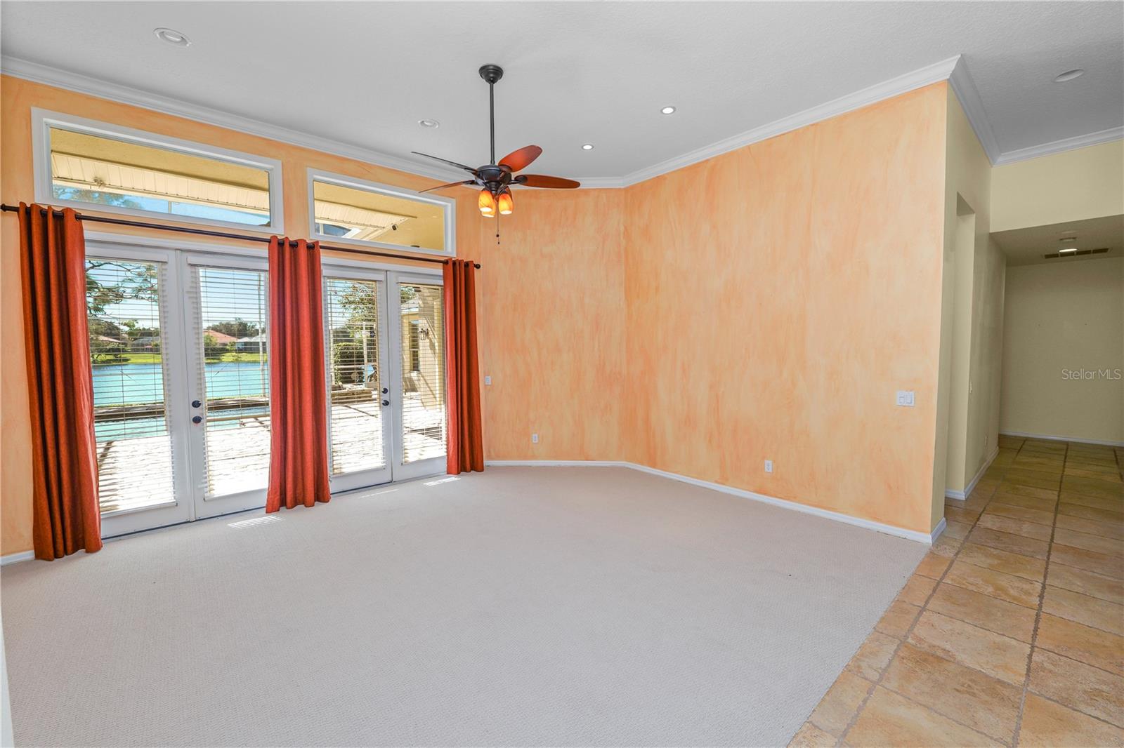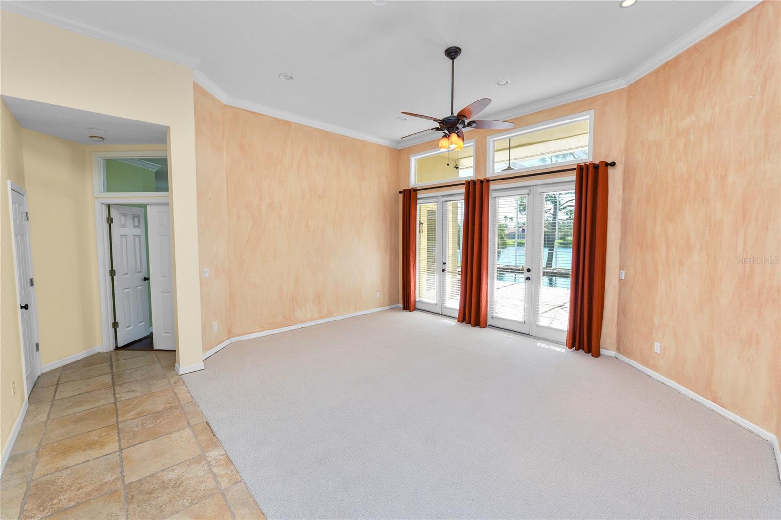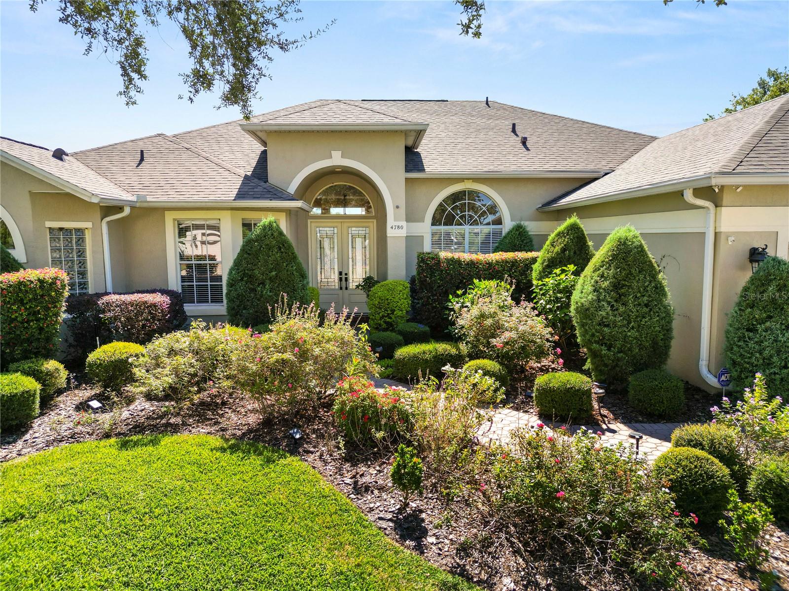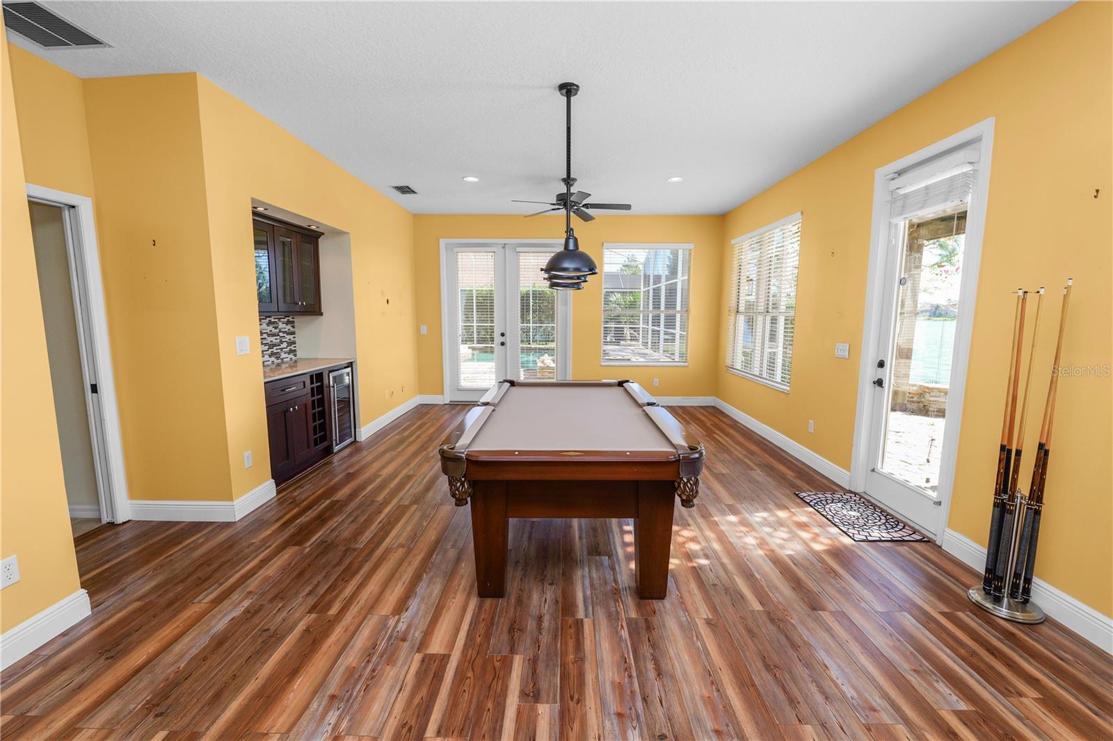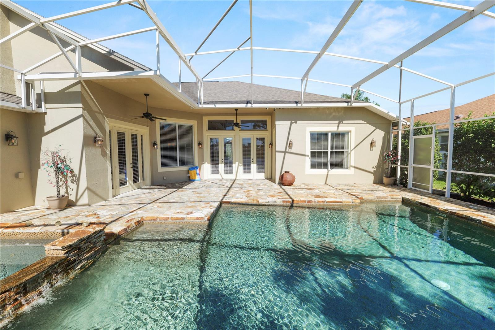 Under contract-accepting backup offers. This lakefront Calabay Cove property has manicured grounds with gorgeous flower gardens in the front and a sparkling pool overlooking the serene waters of Lake Calabay. The 4/5-bedroom home is just as beautiful inside, with tile/wood floors, high ceilings, crown molding and large windows – which let in lots of natural light & showcase the water views. French doors in master bedroom, living room, family room and game room give you easy access to the pool and pergola areas. Just off the foyer, you’ll find the 5th bedroom or use as a dedicated home office, formal living room with French doors accessing the pool area and a formal dining area. At the rear of the floorplan, the family room is open to the kitchen and includes a wood burning fireplace and custom built-ins. The kitchen features shaker cabinetry, granite countertops, pro-style appliances, a center island and a breakfast nook. Just steps away, the backyard oasis includes a covered patio for entertaining, plus a completely screened-in pool & spa surrounded by a stone deck. Outside the enclosure, the pergola-covered patio is lined by another garden and provides a great spot to admire the lake. The back wing of the house has a BONUS recreation/game room with a dry bar and access to the patio and pergola. The spa-like master ensuite includes custom tilework, a double vanity, a soaking tub and a separate shower. Two guest rooms down the hall share an updated Jack & Jill bathroom with all the same high-end finishes found throughout the rest of the home. The laundry room off the 3-car garage also has granite countertops and tons of storage. Calabay Cove is a gated community with easy access to schools, parks, trailheads and highways. Plus, The Loop shopping mall, Publix and numerous dining options are all just 5 minutes from your front door. Less than 20 minutes to the theme parks, 25 minutes to the airport and 1 hr to the beach! Enjoy the most breathtaking sunrise and sunset from the pool and pergola areas. This lovely home's roof was replaced 10/22. Third car garage converted into a workshop with wall-mounted A/C. Pool table in game room remains with the property. Custom designed dinette set with bench also remain.