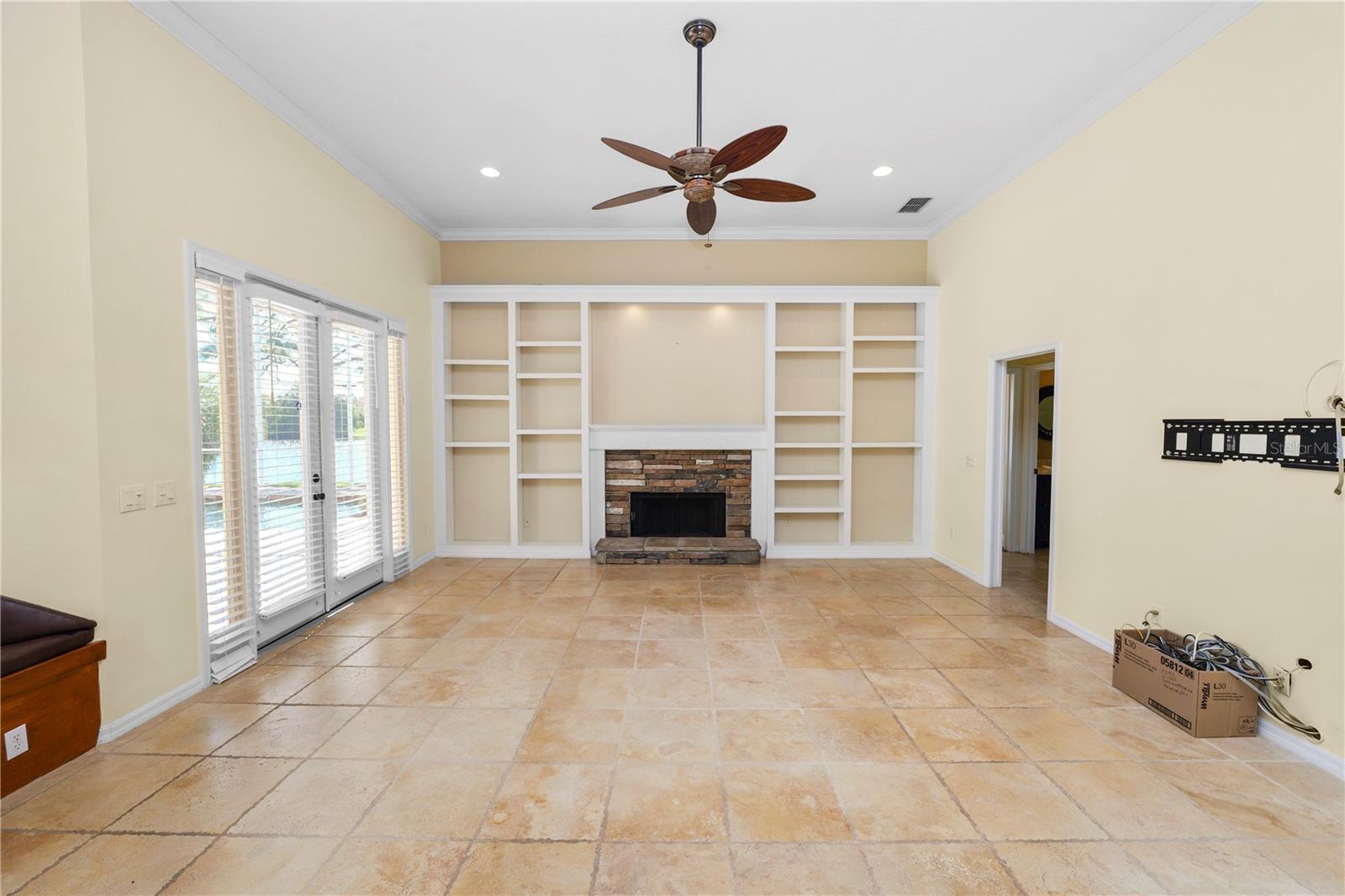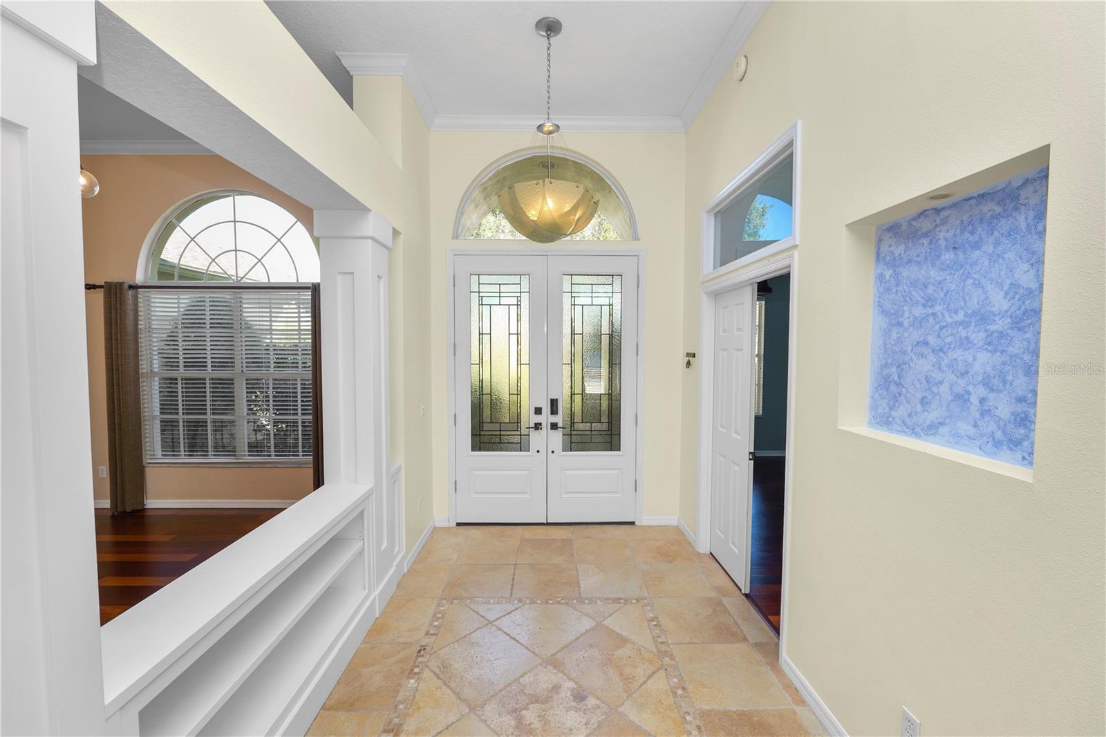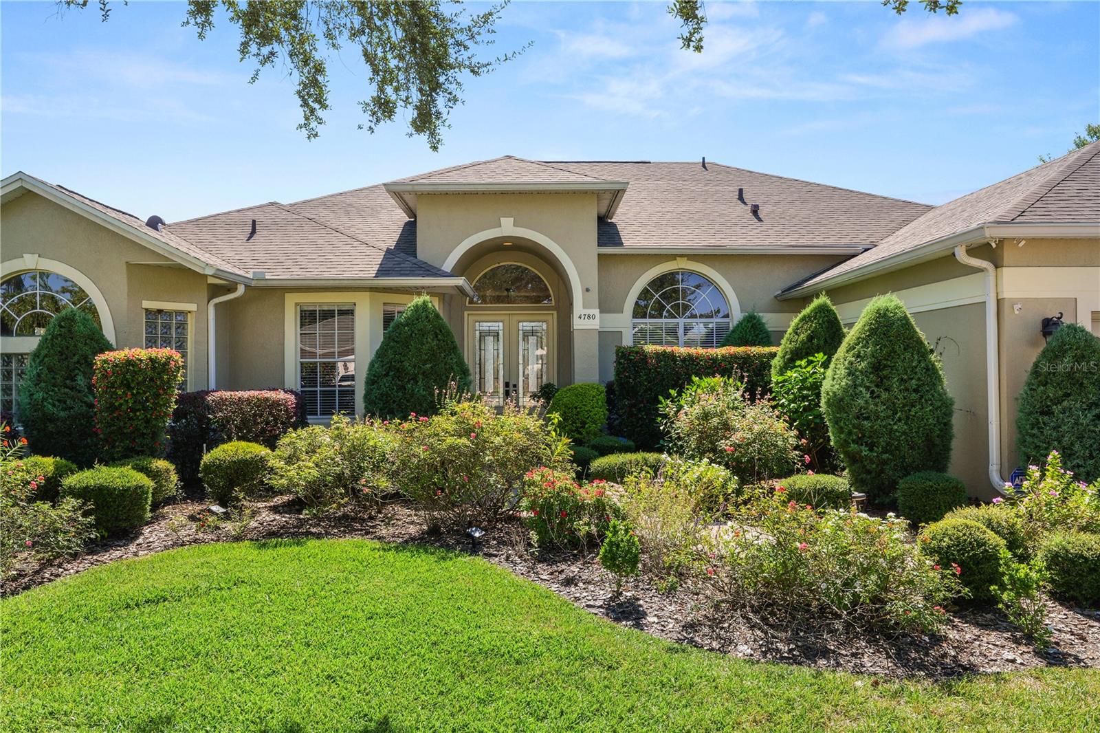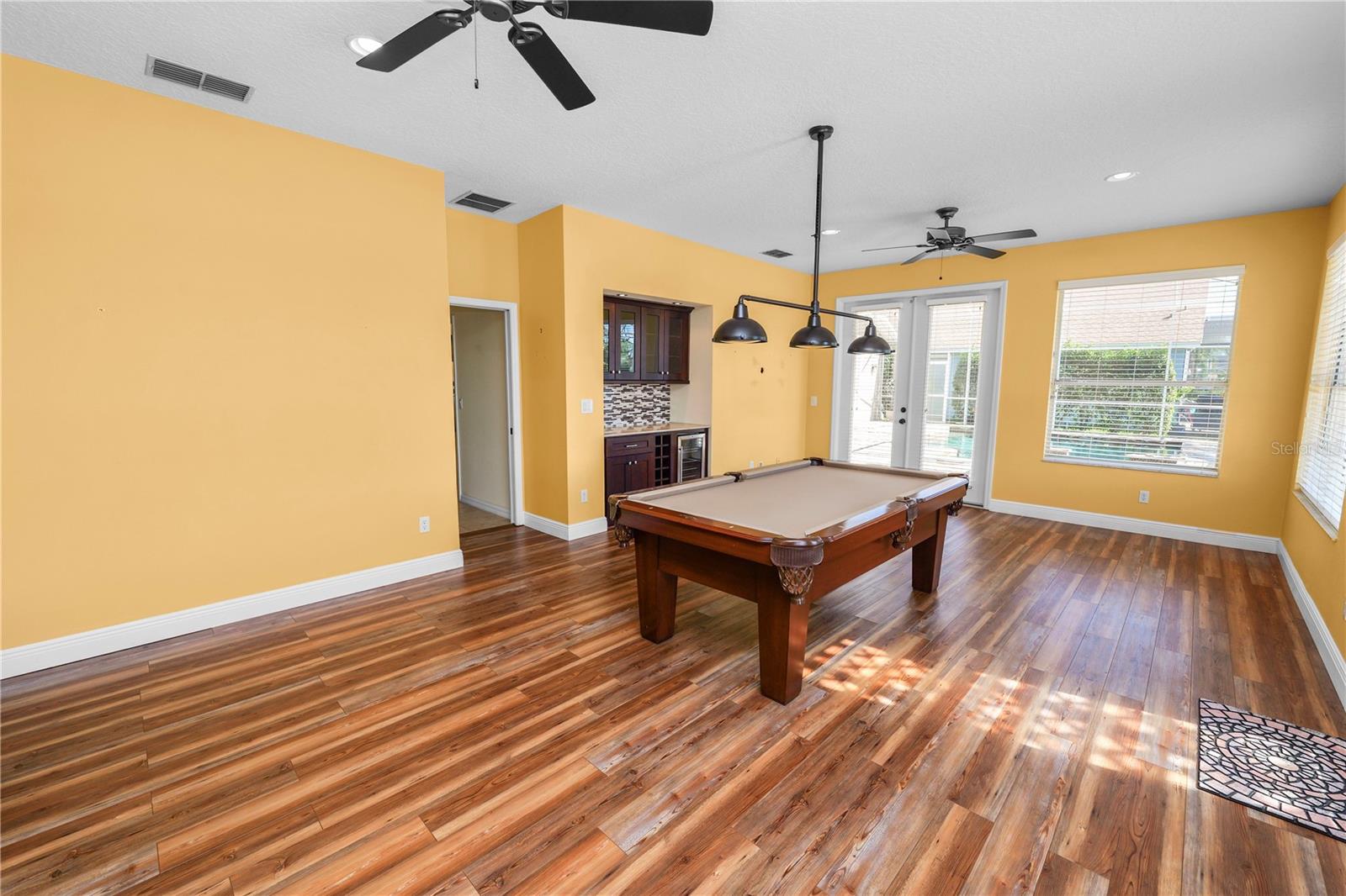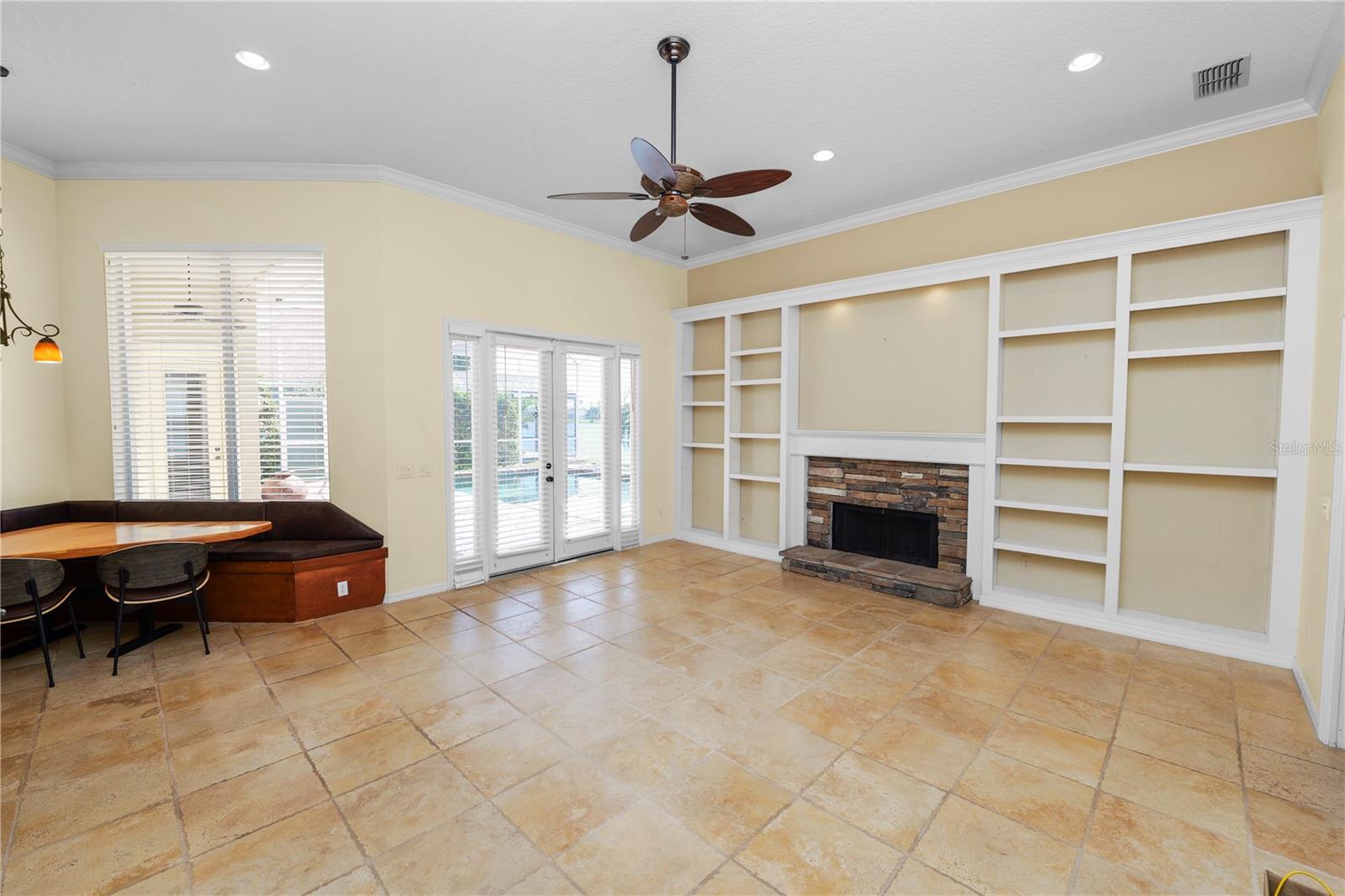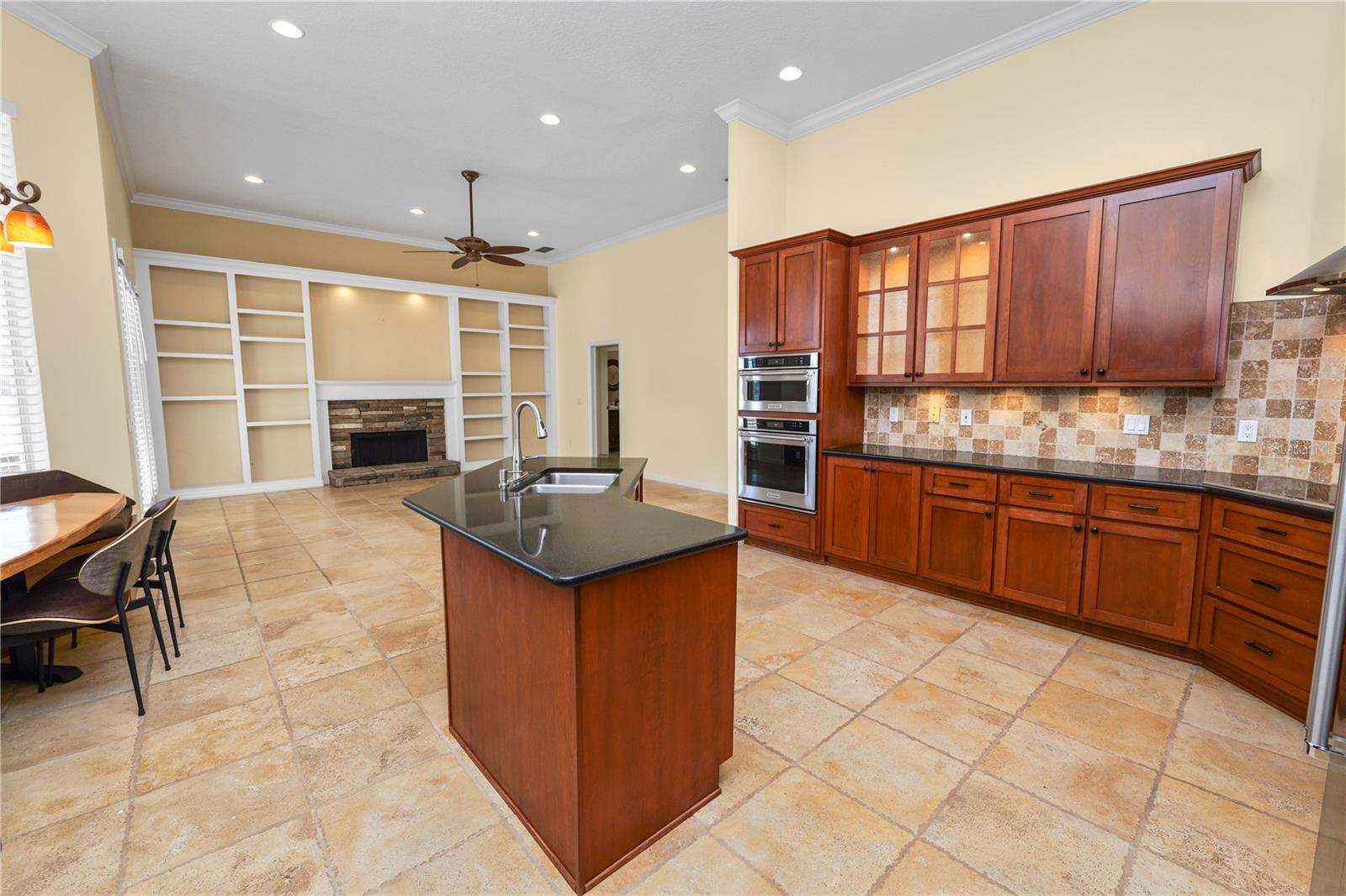 Under contract-accepting backup offers. This lakefront Calabay Cove property has manicured grounds with gorgeous flower gardens in the front and a sparkling pool overlooking the serene waters of Lake Calabay. The 4/5-bedroom home is just as beautiful inside, with tile/wood floors, high ceilings, crown molding and large windows – which let in lots of natural light & showcase the water views. French doors in master bedroom, living room, family room and game room give you easy access to the pool and pergola areas. Just off the foyer, you’ll find the 5th bedroom or use as a dedicated home office, formal living room with French doors accessing the pool area and a formal dining area. At the rear of the floorplan, the family room is open to the kitchen and includes a wood burning fireplace and custom built-ins. The kitchen features shaker cabinetry, granite countertops, pro-style appliances, a center island and a breakfast nook. Just steps away, the backyard oasis includes a covered patio for entertaining, plus a completely screened-in pool & spa surrounded by a stone deck. Outside the enclosure, the pergola-covered patio is lined by another garden and provides a great spot to admire the lake. The back wing of the house has a BONUS recreation/game room with a dry bar and access to the patio and pergola. The spa-like master ensuite includes custom tilework, a double vanity, a soaking tub and a separate shower. Two guest rooms down the hall share an updated Jack & Jill bathroom with all the same high-end finishes found throughout the rest of the home. The laundry room off the 3-car garage also has granite countertops and tons of storage. Calabay Cove is a gated community with easy access to schools, parks, trailheads and highways. Plus, The Loop shopping mall, Publix and numerous dining options are all just 5 minutes from your front door. Less than 20 minutes to the theme parks, 25 minutes to the airport and 1 hr to the beach! Enjoy the most breathtaking sunrise and sunset from the pool and pergola areas. This lovely home's roof was replaced 10/22. Third car garage converted into a workshop with wall-mounted A/C. Pool table in game room remains with the property. Custom designed dinette set with bench also remain.