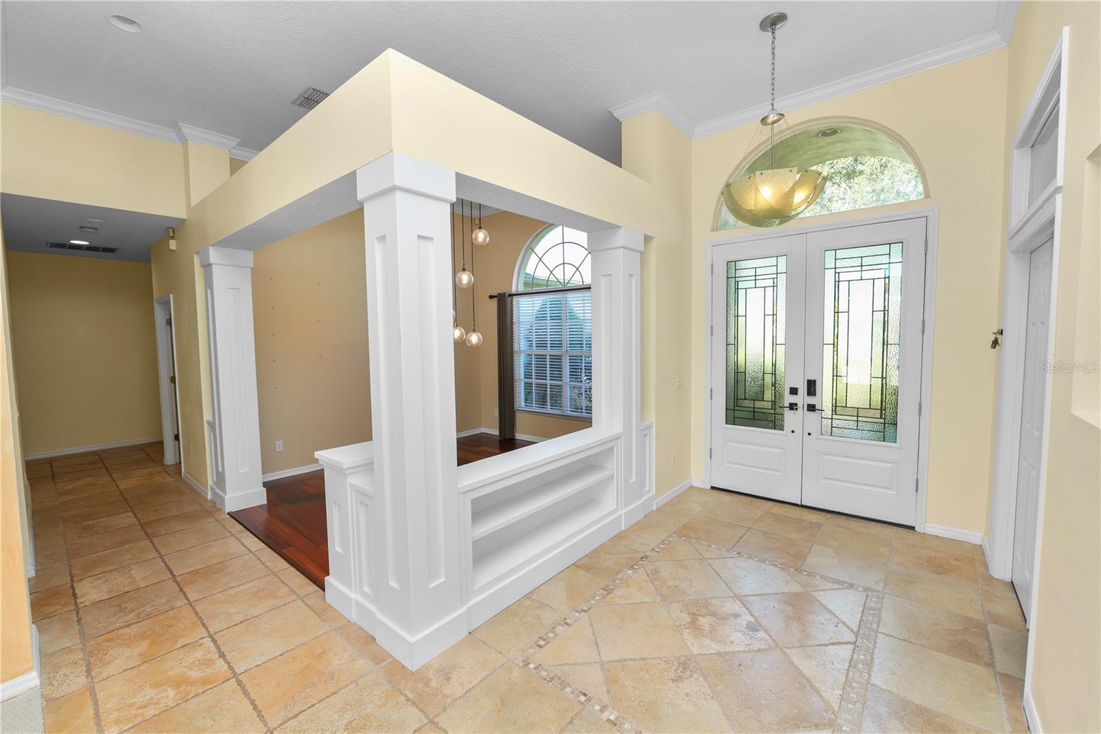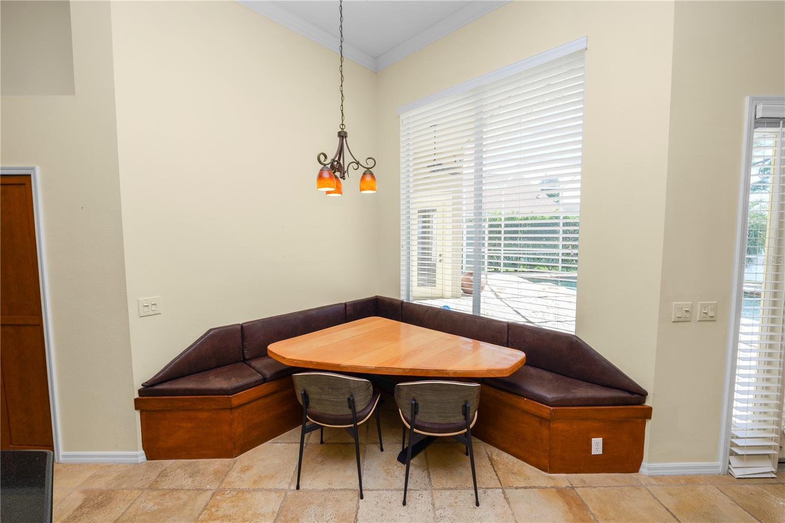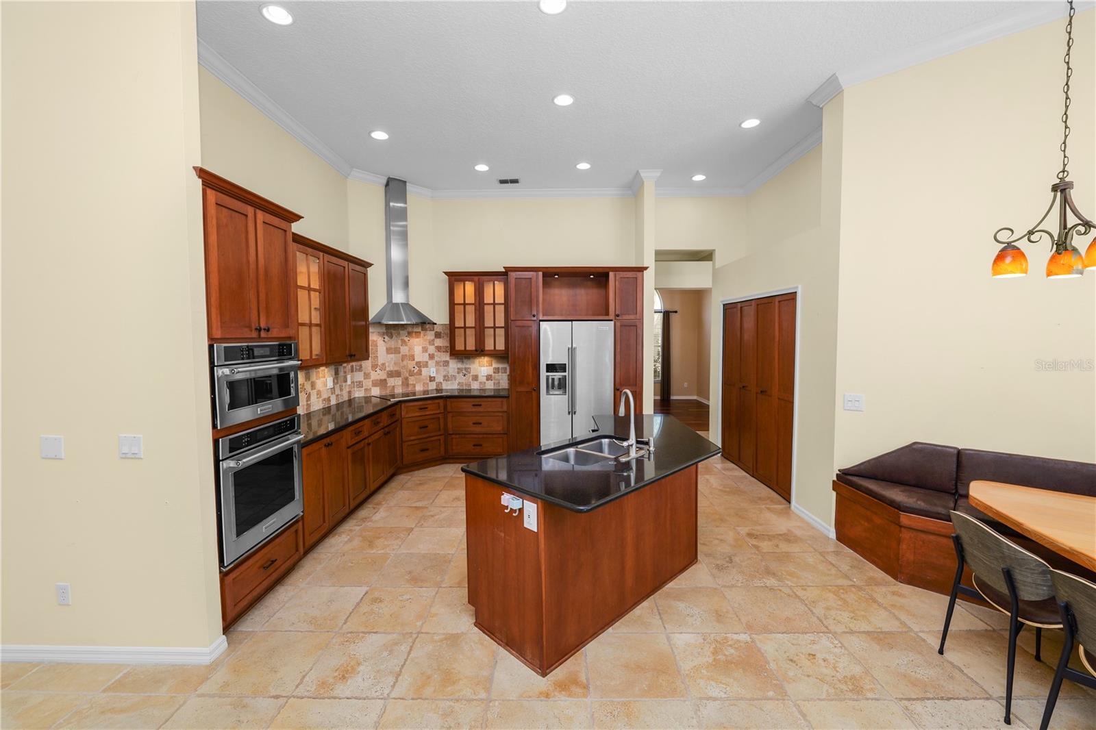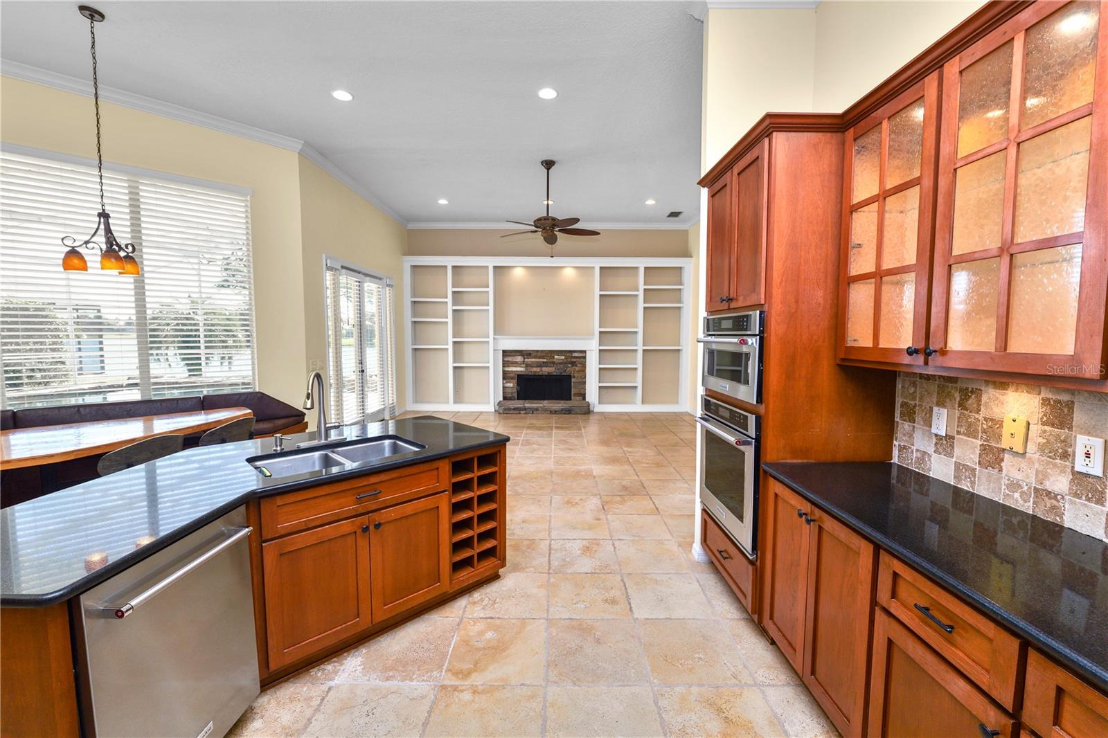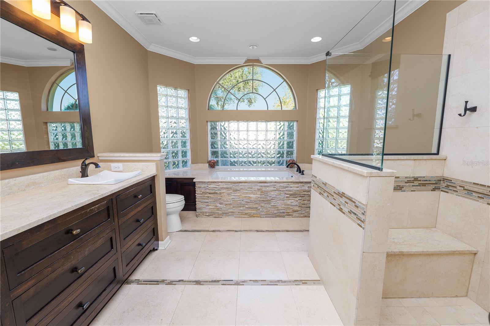 Under contract-accepting backup offers. This lakefront Calabay Cove property has manicured grounds with gorgeous flower gardens in the front and a sparkling pool overlooking the serene waters of Lake Calabay. The 4/5-bedroom home is just as beautiful inside, with tile/wood floors, high ceilings, crown molding and large windows – which let in lots of natural light & showcase the water views. French doors in master bedroom, living room, family room and game room give you easy access to the pool and pergola areas. Just off the foyer, you’ll find the 5th bedroom or use as a dedicated home office, formal living room with French doors accessing the pool area and a formal dining area. At the rear of the floorplan, the family room is open to the kitchen and includes a wood burning fireplace and custom built-ins. The kitchen features shaker cabinetry, granite countertops, pro-style appliances, a center island and a breakfast nook. Just steps away, the backyard oasis includes a covered patio for entertaining, plus a completely screened-in pool & spa surrounded by a stone deck. Outside the enclosure, the pergola-covered patio is lined by another garden and provides a great spot to admire the lake. The back wing of the house has a BONUS recreation/game room with a dry bar and access to the patio and pergola. The spa-like master ensuite includes custom tilework, a double vanity, a soaking tub and a separate shower. Two guest rooms down the hall share an updated Jack & Jill bathroom with all the same high-end finishes found throughout the rest of the home. The laundry room off the 3-car garage also has granite countertops and tons of storage. Calabay Cove is a gated community with easy access to schools, parks, trailheads and highways. Plus, The Loop shopping mall, Publix and numerous dining options are all just 5 minutes from your front door. Less than 20 minutes to the theme parks, 25 minutes to the airport and 1 hr to the beach! Enjoy the most breathtaking sunrise and sunset from the pool and pergola areas. This lovely home's roof was replaced 10/22. Third car garage converted into a workshop with wall-mounted A/C. Pool table in game room remains with the property. Custom designed dinette set with bench also remain.