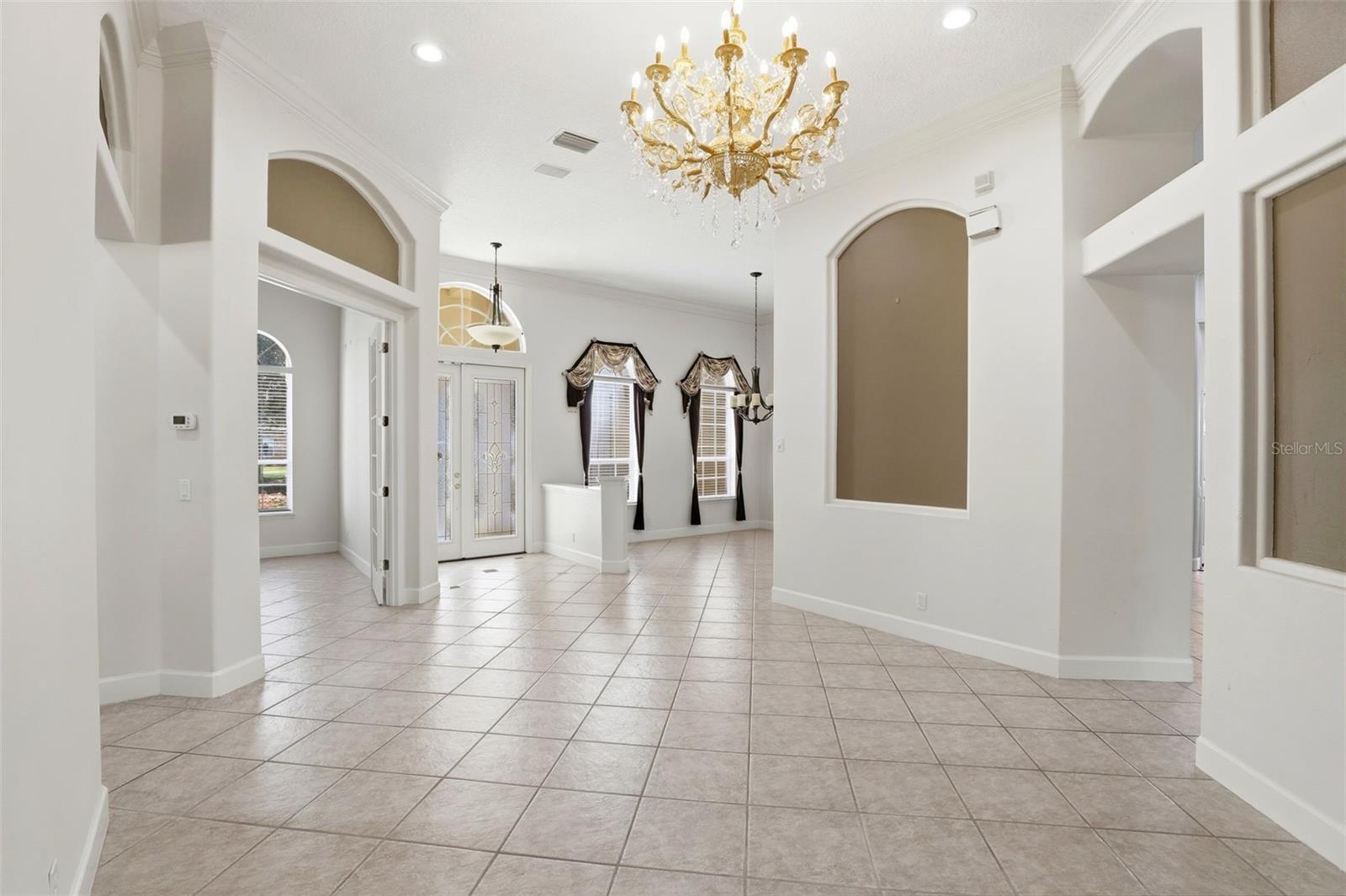 Ceiling Fans(s), Crown Molding, Eat-in Kitchen, High Ceilings, Kitchen/Family Room Combo, L Dining, Open Floorplan, Primary Bedroom Main Floor, Solid Surface Counters, Solid Wood Cabinets, Stone Counters, Thermostat, Walk-In Closet(s), Window Treatments