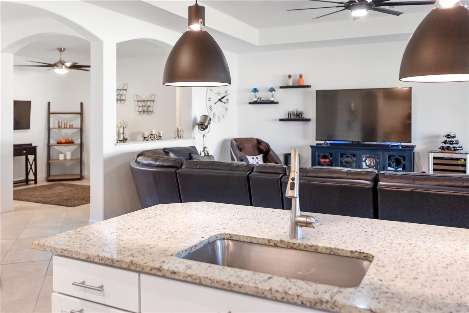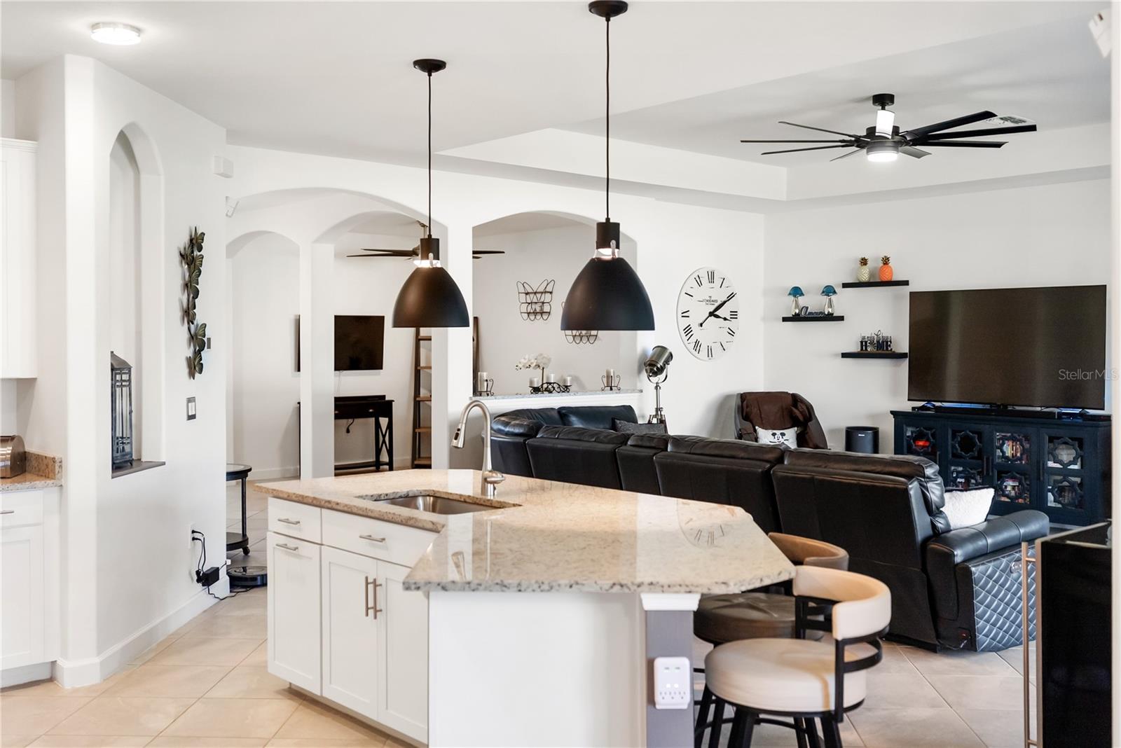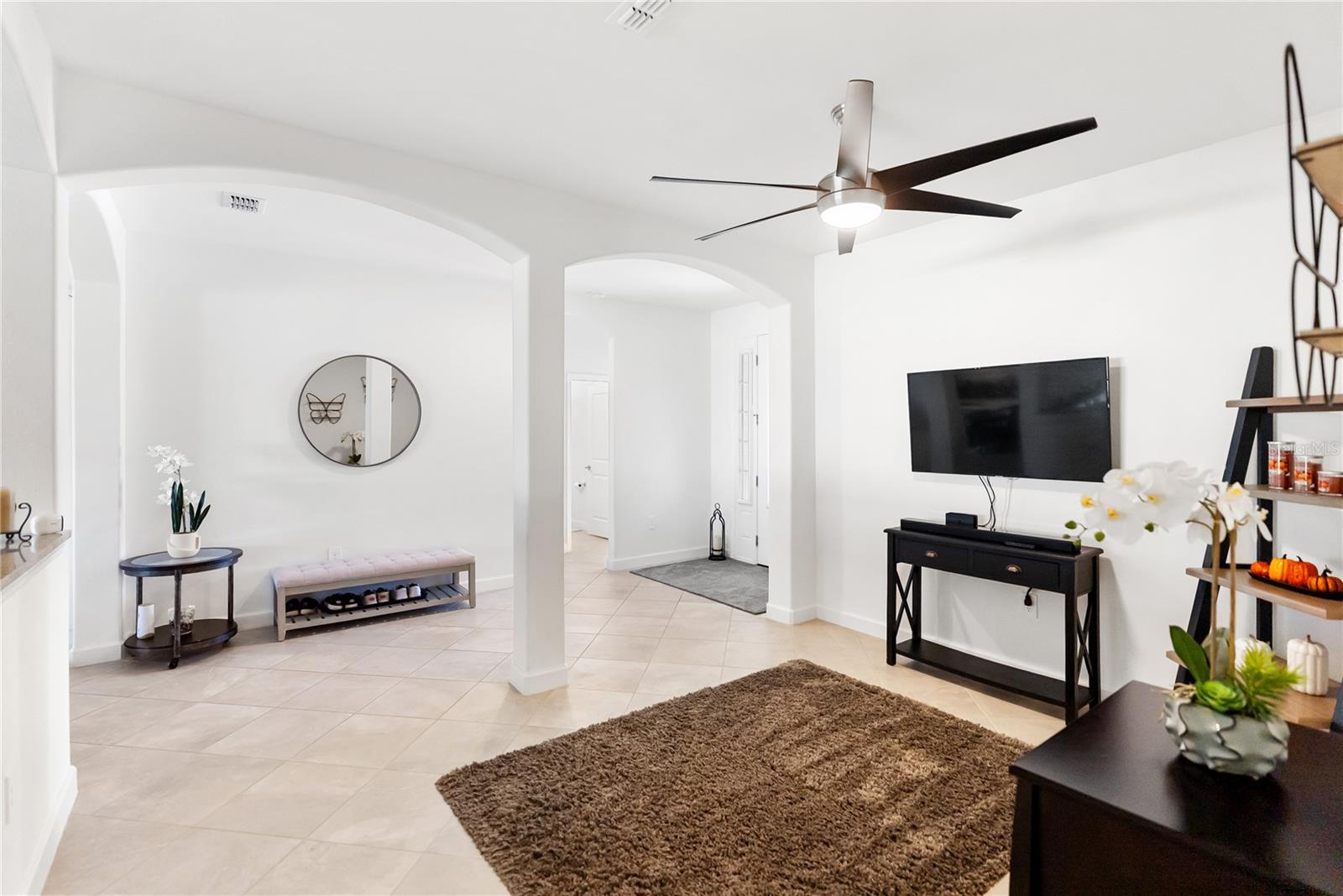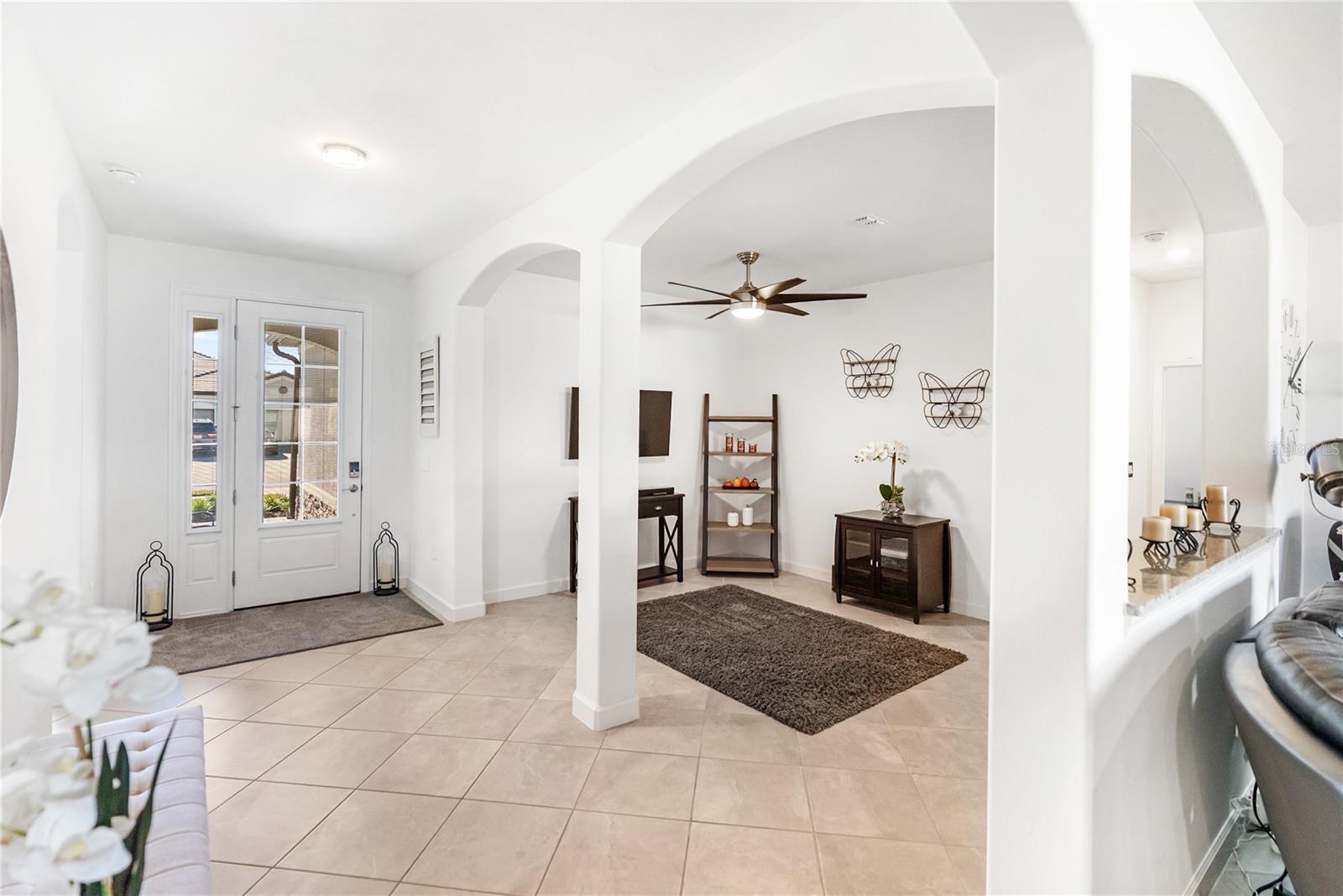 Ceiling Fans(s), Eat-in Kitchen, High Ceilings, Open Floorplan, Primary Bedroom Main Floor, Solid Surface Counters, Stone Counters, Thermostat, Walk-In Closet(s), Window Treatments