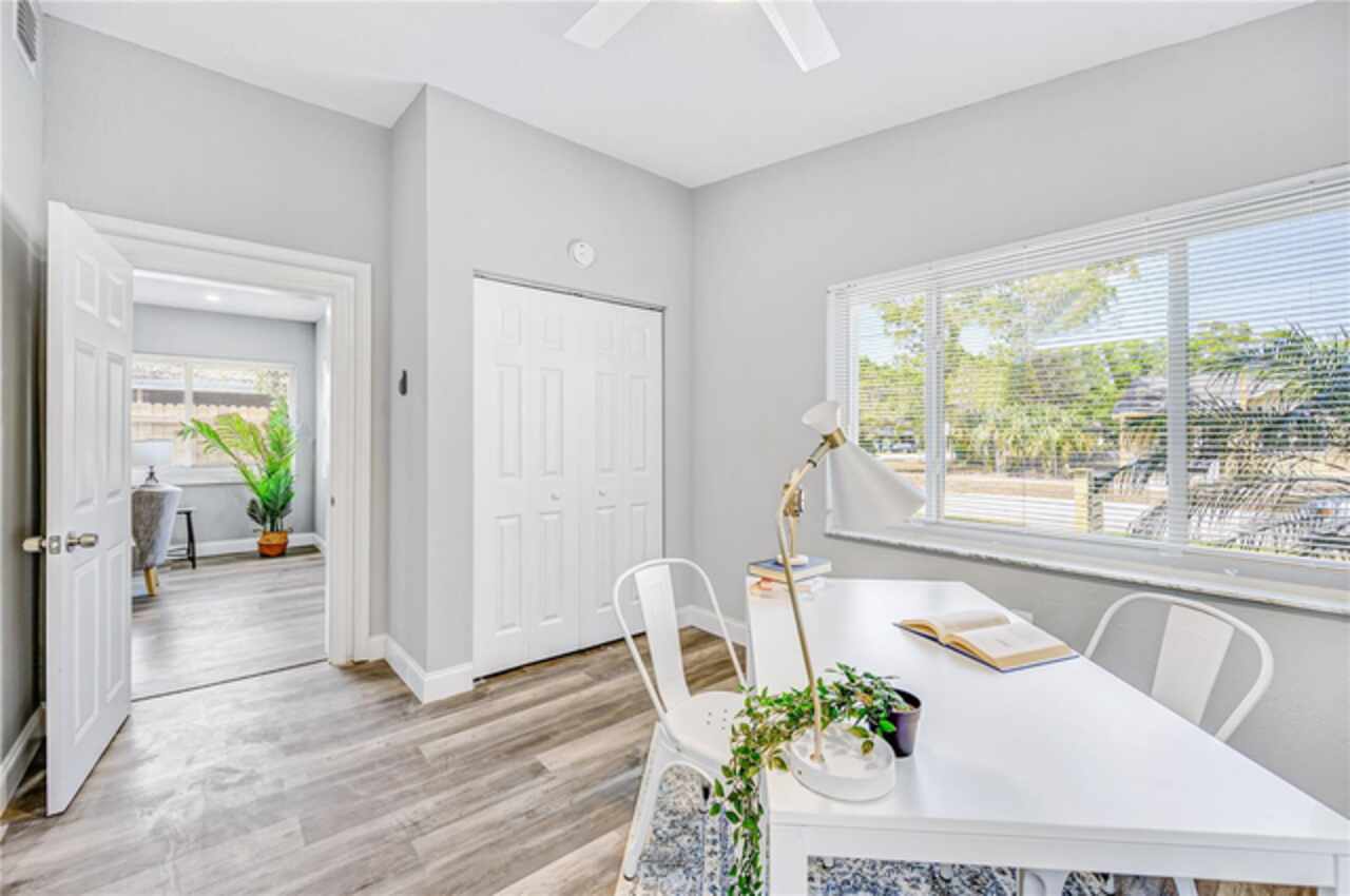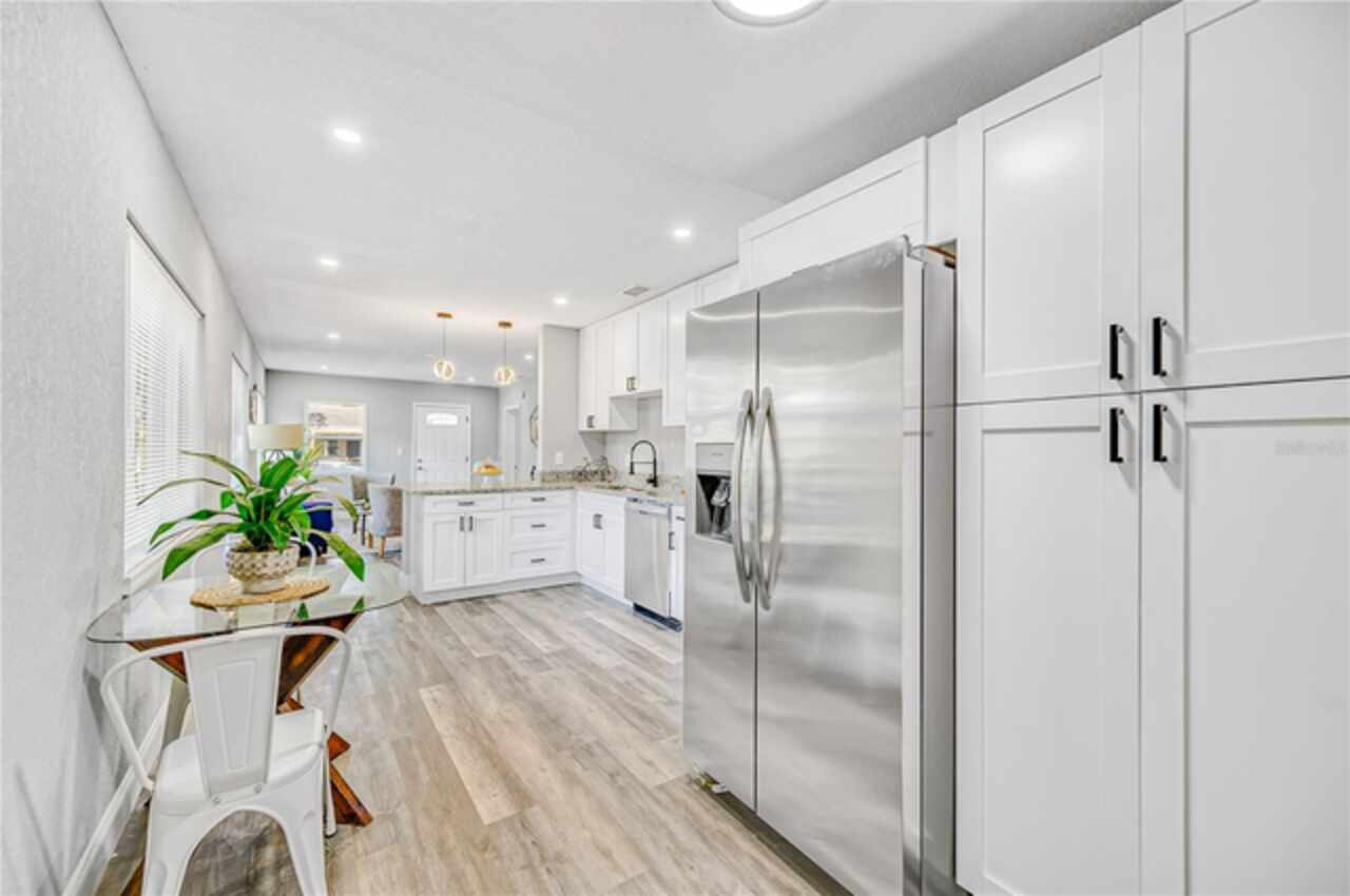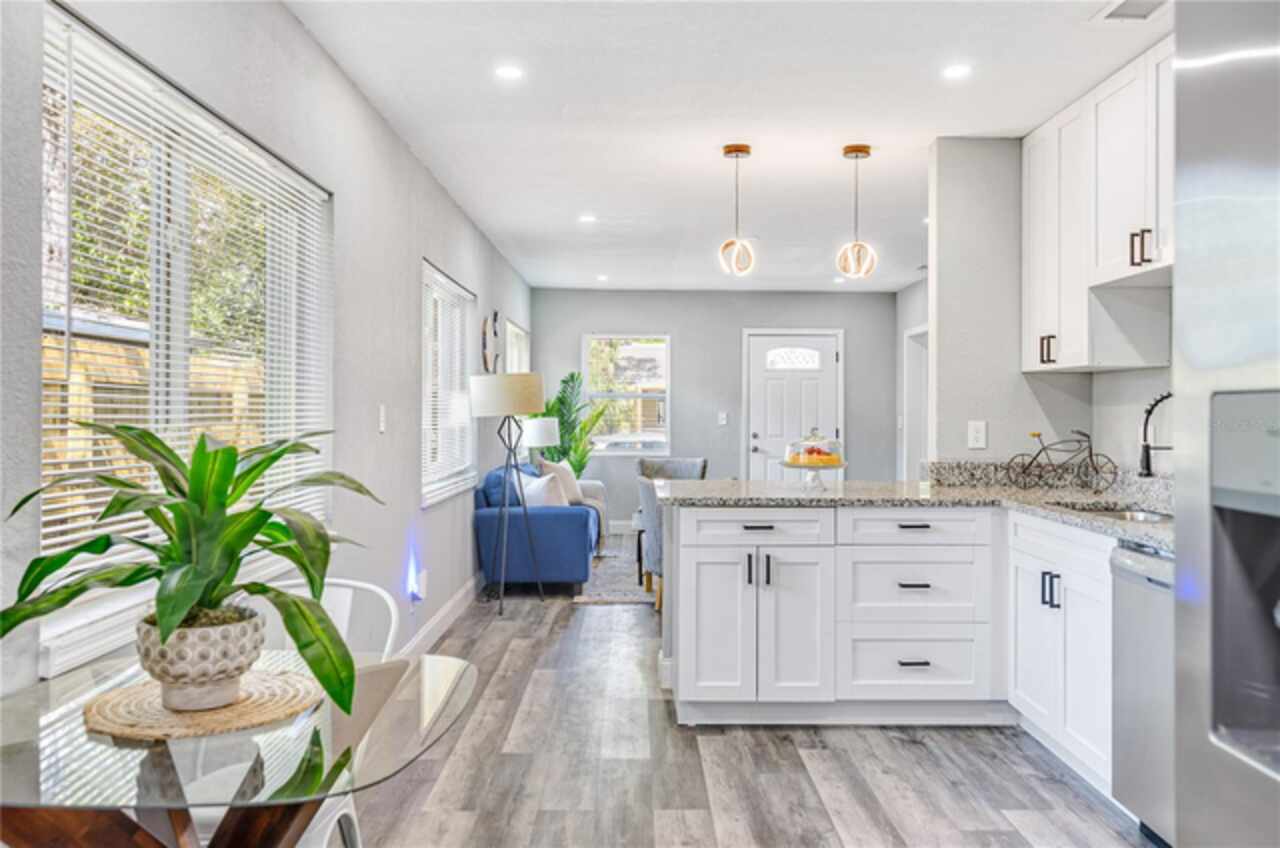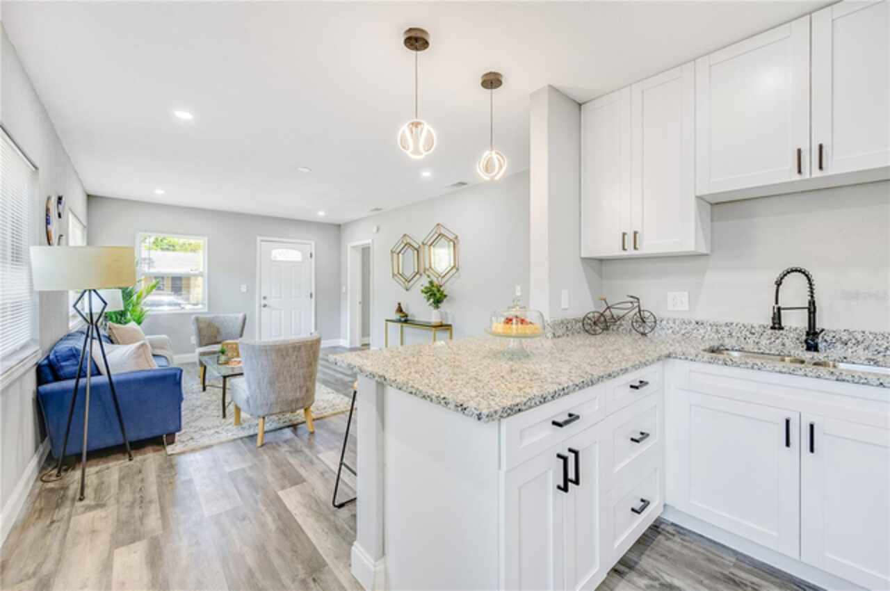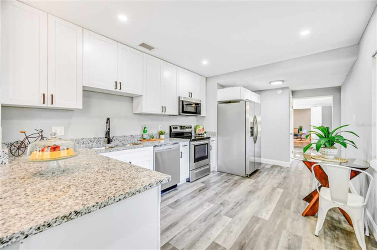 Step inside this beautiful renovated NO FLOOD ZONE home, and get ready to be amazed! This recently renovated 4 bedroom, 3 bath home boast a desirable floor plan that provides privacy and comfort for the entire household. With a newer roof, gutters, luxury waterproof vinyl flooring, gorgeous granite countertops, and stainless steel appliances, this home feels like new from the moment you walk in. The primary suite is bright, spacious, and thoughtfully designed with a large closet and a beautifully updated bathroom. As you explore further, you’ll discover additional renovated space beyond the breezeway that could serve as the perfect private in-law suite or related living area, offering flexibility for family or guests. Home showcases a mid-century modern style exterior. You’ll also enjoy plenty of off-street parking and convenient garage space, making daily living a breeze. Nestled in a desirable location, you’re just minutes from local parks like Azalea Park, Bear Creek Park, and Leslee Lake Park, offering green spaces, walking trails, and playgrounds. Plus, you’re close to shopping, dining, entertainment and marinas. Less than 15 minutes to both Downtown St Pete and Treasure Island and St Pete Beach. Beautiful home in a great central location! Buyer to verity all dimensions and measurements.
