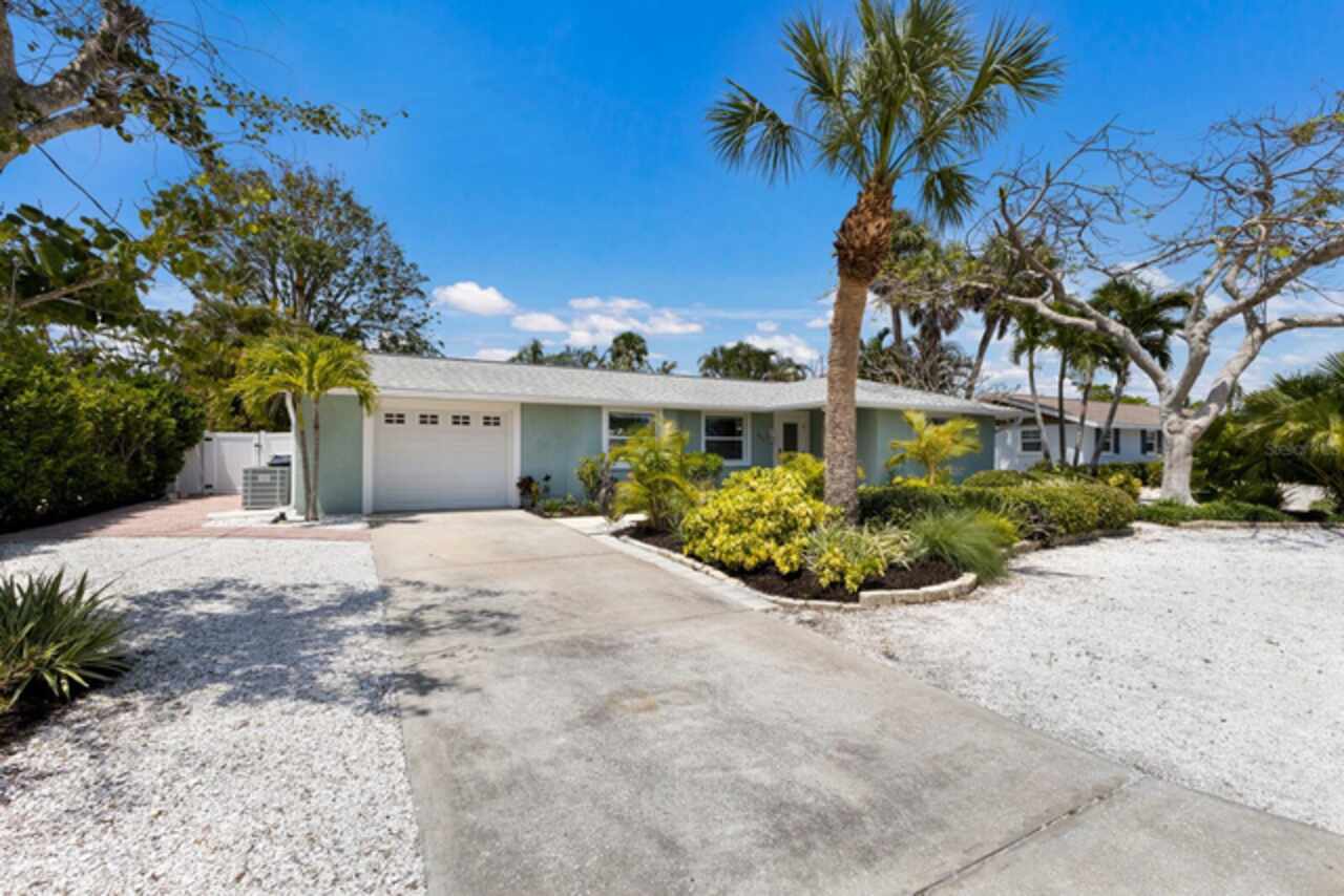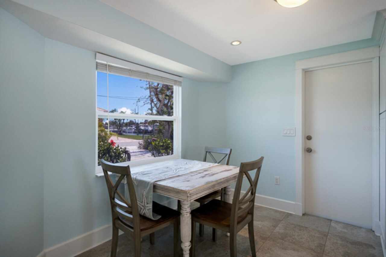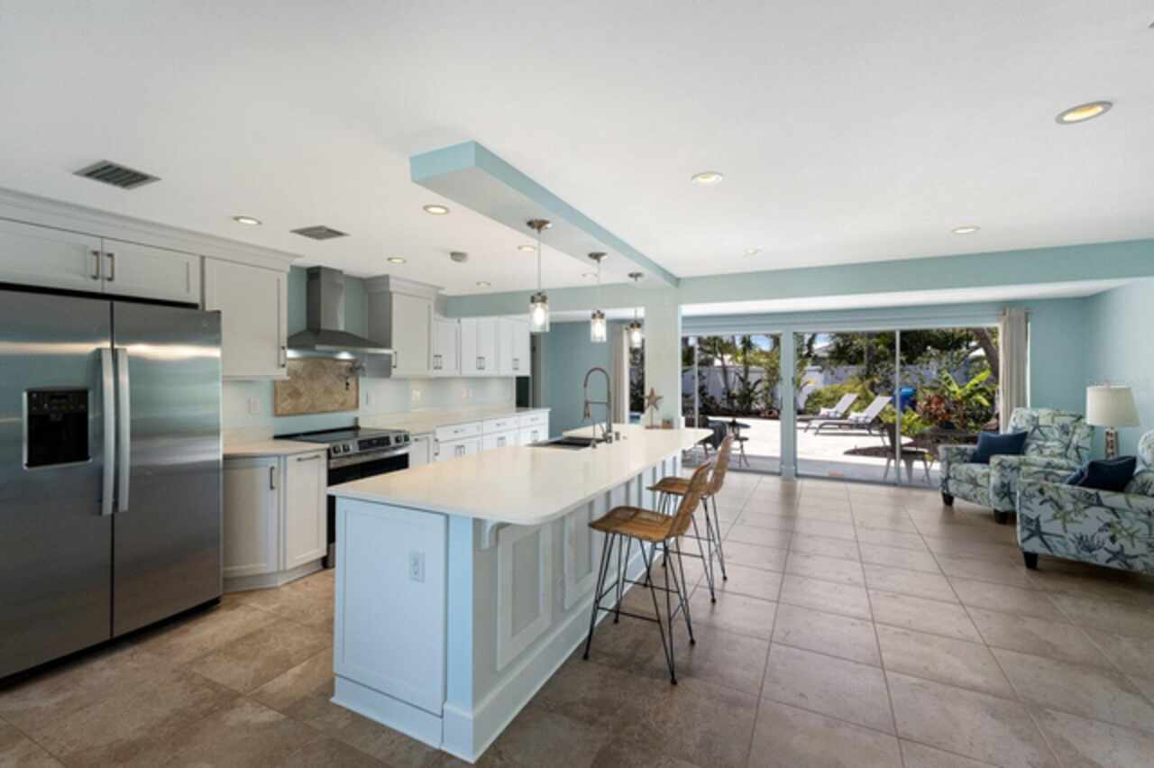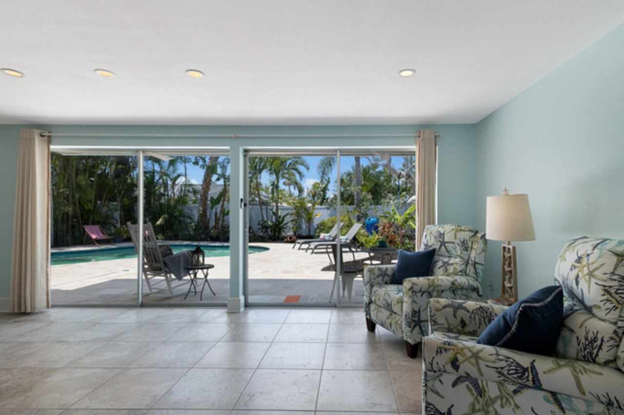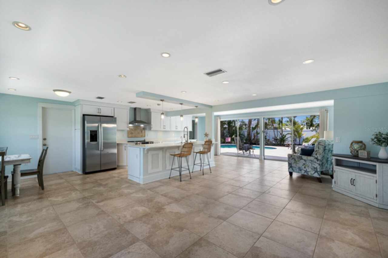 This easy living 3 bedroom, 2 bath home combines comfort and accessibility, offering a tranquil retreat in the heart of Holmes Beach with a beautifully updated interior and a lush, private backyard oasis. Wrapped in mature tropical landscaping, the outdoor space is ideal for unwinding, featuring a heated pool, an outdoor shower, a cozy firepit area, and plenty of shaded spots perfect for afternoon siestas. Inside, the open concept layout enhances the flow between living and dining areas, with pocket sliders that open fully to a spacious rear porch creating a seamless connection to the outdoors and making entertaining a breeze. The completely remodeled kitchen is a true highlight, showcasing crisp white cabinetry, sleek countertops, and stainless steel appliances, blending everyday functionality with modern flair. A generous island with seating and chic pendant lighting adds to the inviting atmosphere. Just off the kitchen, a flexible nook provides a perfect spot for casual meals or a tucked away workspace. The primary suite offers a peaceful escape, complete with a large ensuite bath featuring a walk-in shower, double vanity, and accessible design. Additional features include a one-car garage with a freshly coated floor. Located just a short golf cart ride from the beach, shopping, and dining, this move in ready home delivers easygoing island living with an elevated touch.