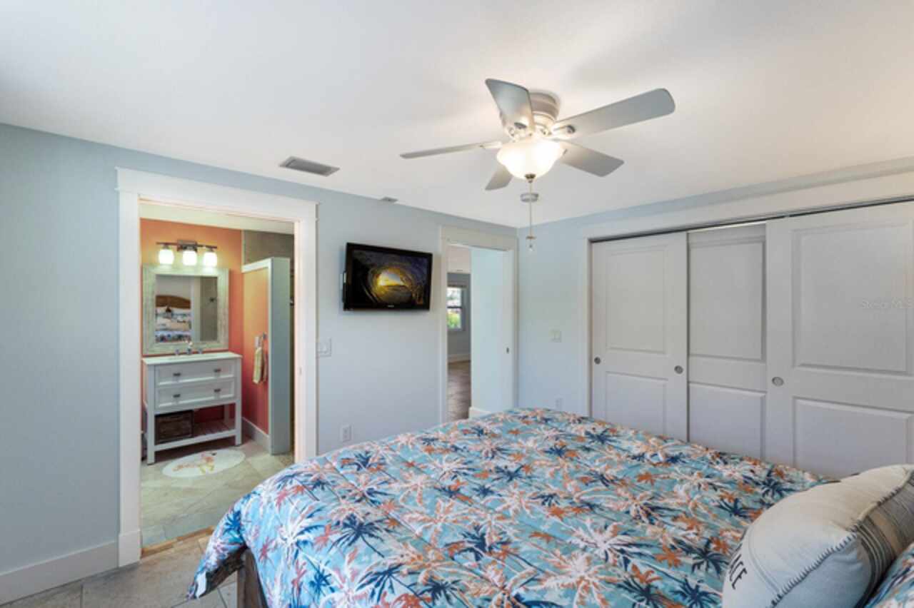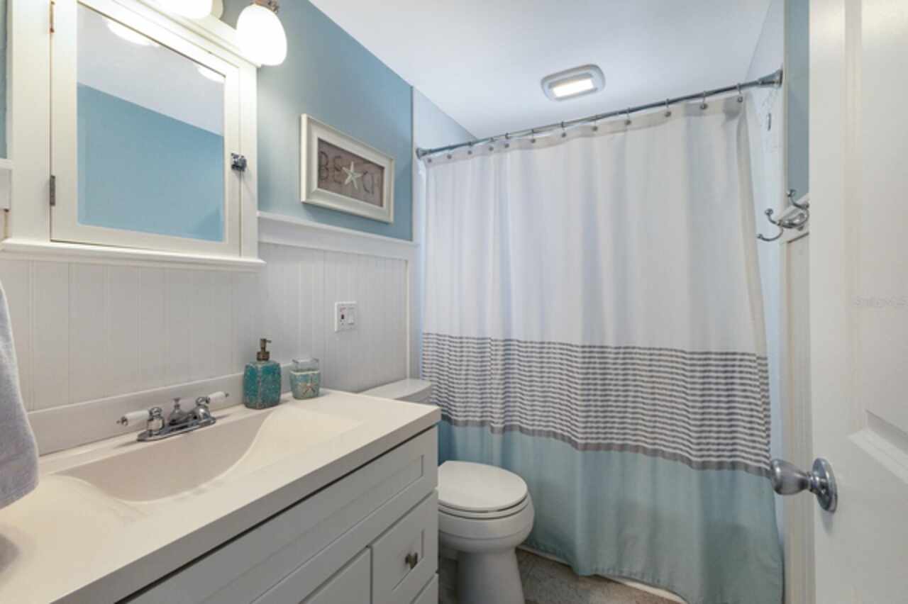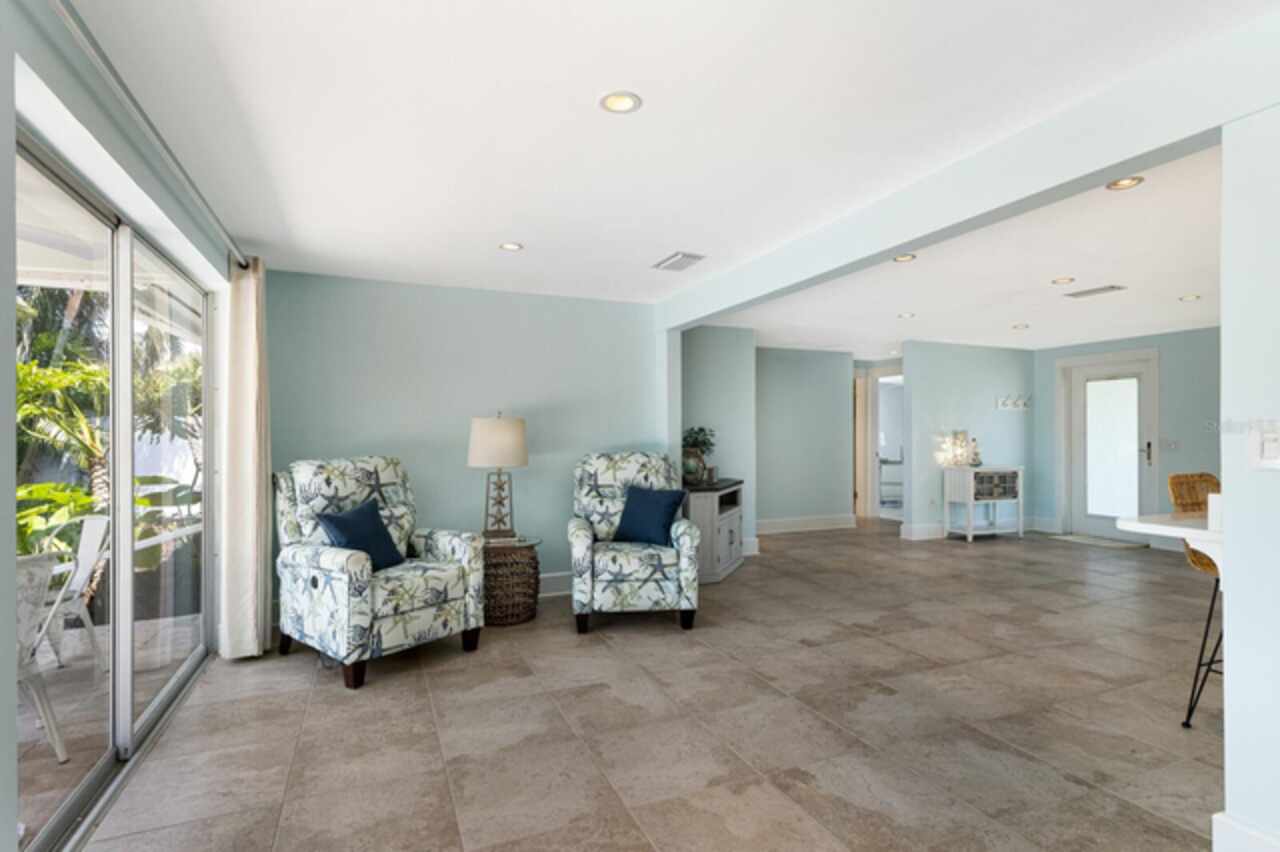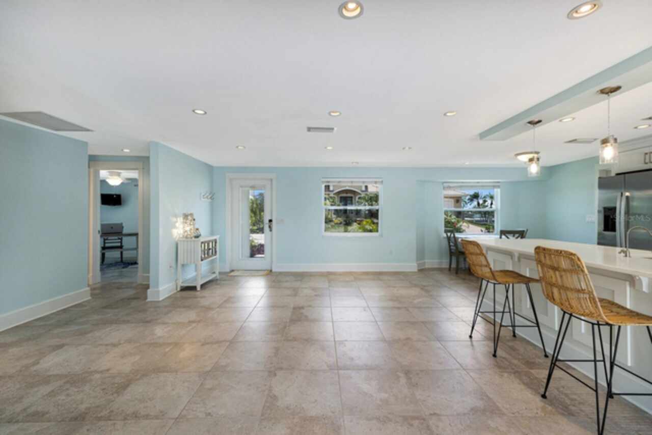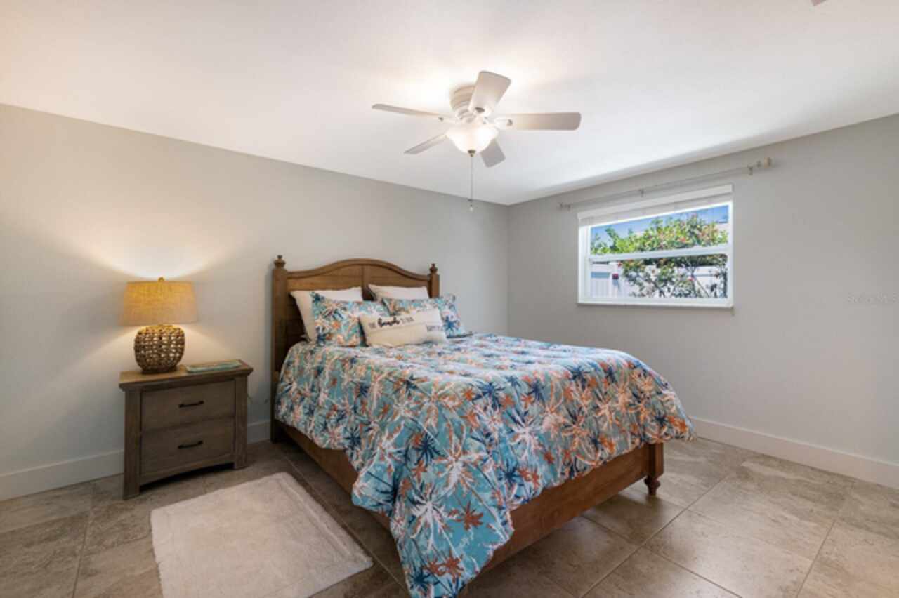 This easy living 3 bedroom, 2 bath home combines comfort and accessibility, offering a tranquil retreat in the heart of Holmes Beach with a beautifully updated interior and a lush, private backyard oasis. Wrapped in mature tropical landscaping, the outdoor space is ideal for unwinding, featuring a heated pool, an outdoor shower, a cozy firepit area, and plenty of shaded spots perfect for afternoon siestas. Inside, the open concept layout enhances the flow between living and dining areas, with pocket sliders that open fully to a spacious rear porch creating a seamless connection to the outdoors and making entertaining a breeze. The completely remodeled kitchen is a true highlight, showcasing crisp white cabinetry, sleek countertops, and stainless steel appliances, blending everyday functionality with modern flair. A generous island with seating and chic pendant lighting adds to the inviting atmosphere. Just off the kitchen, a flexible nook provides a perfect spot for casual meals or a tucked away workspace. The primary suite offers a peaceful escape, complete with a large ensuite bath featuring a walk-in shower, double vanity, and accessible design. Additional features include a one-car garage with a freshly coated floor. Located just a short golf cart ride from the beach, shopping, and dining, this move in ready home delivers easygoing island living with an elevated touch.