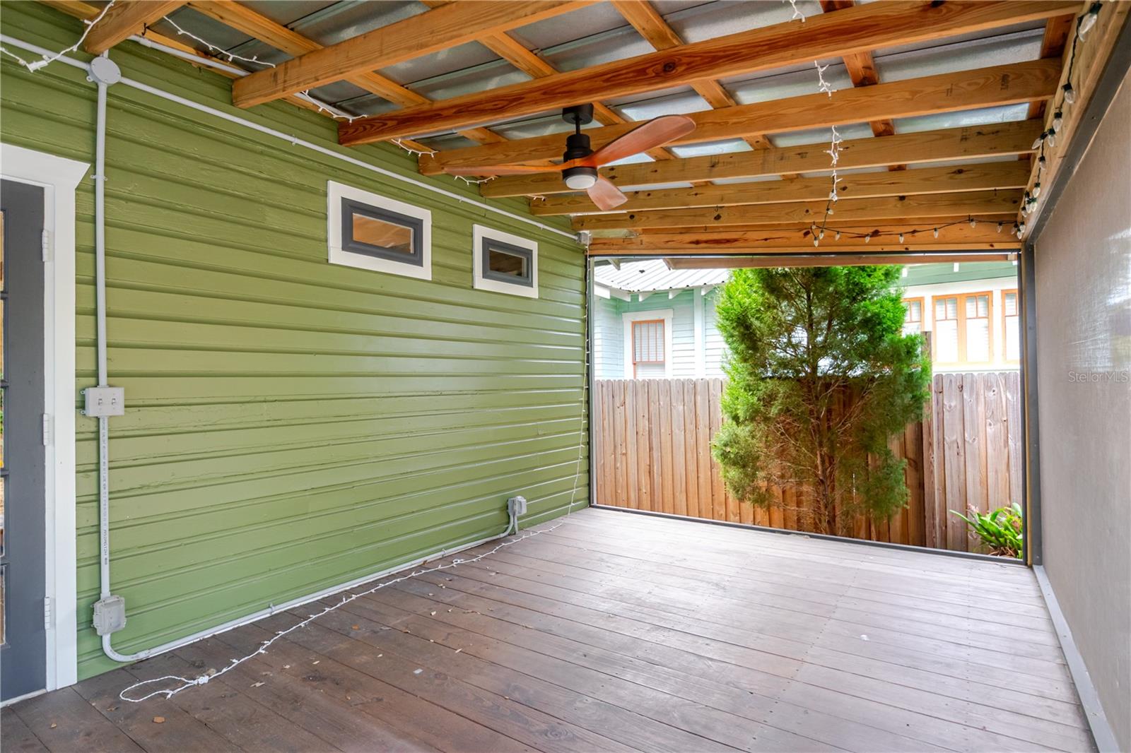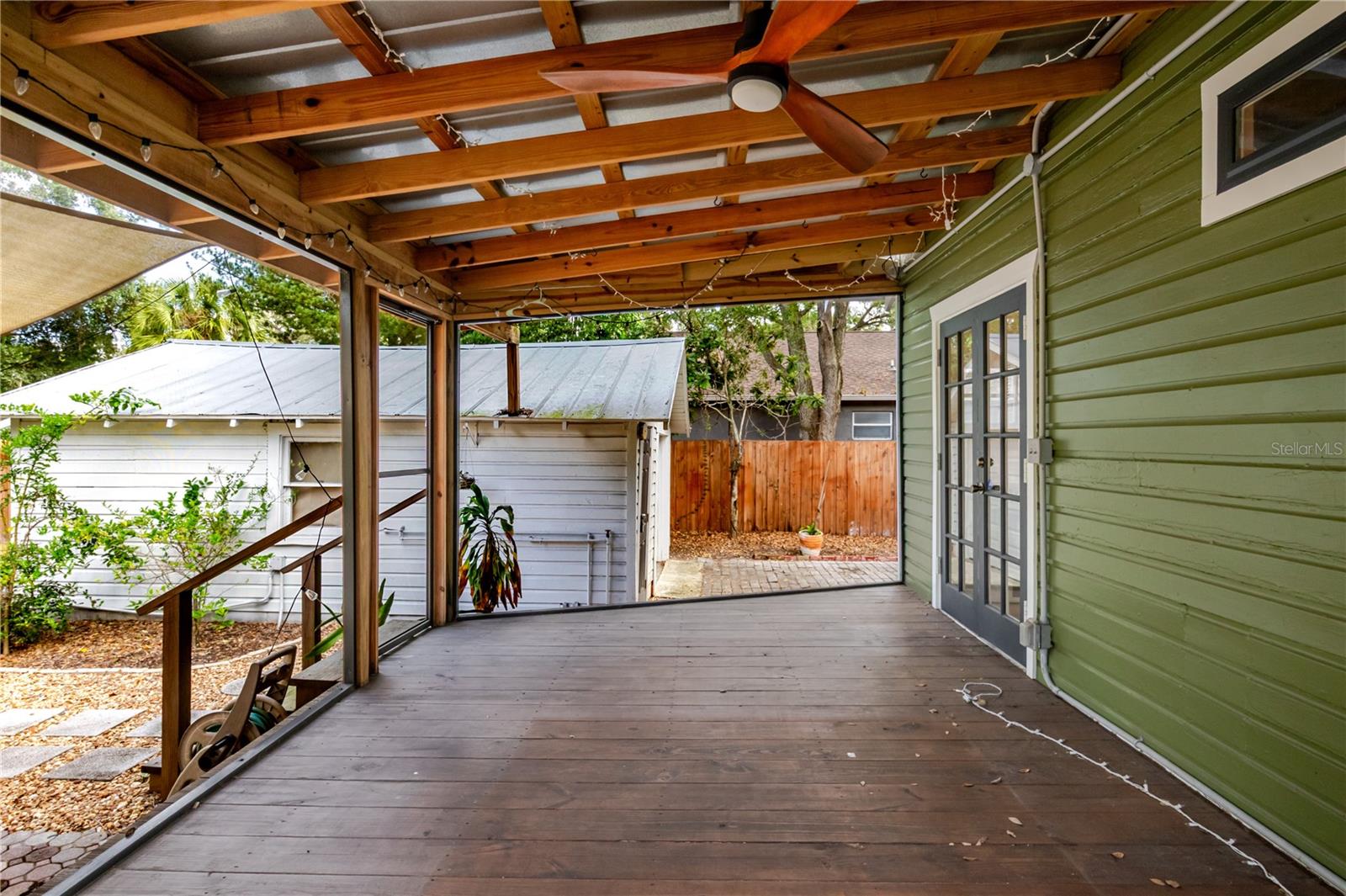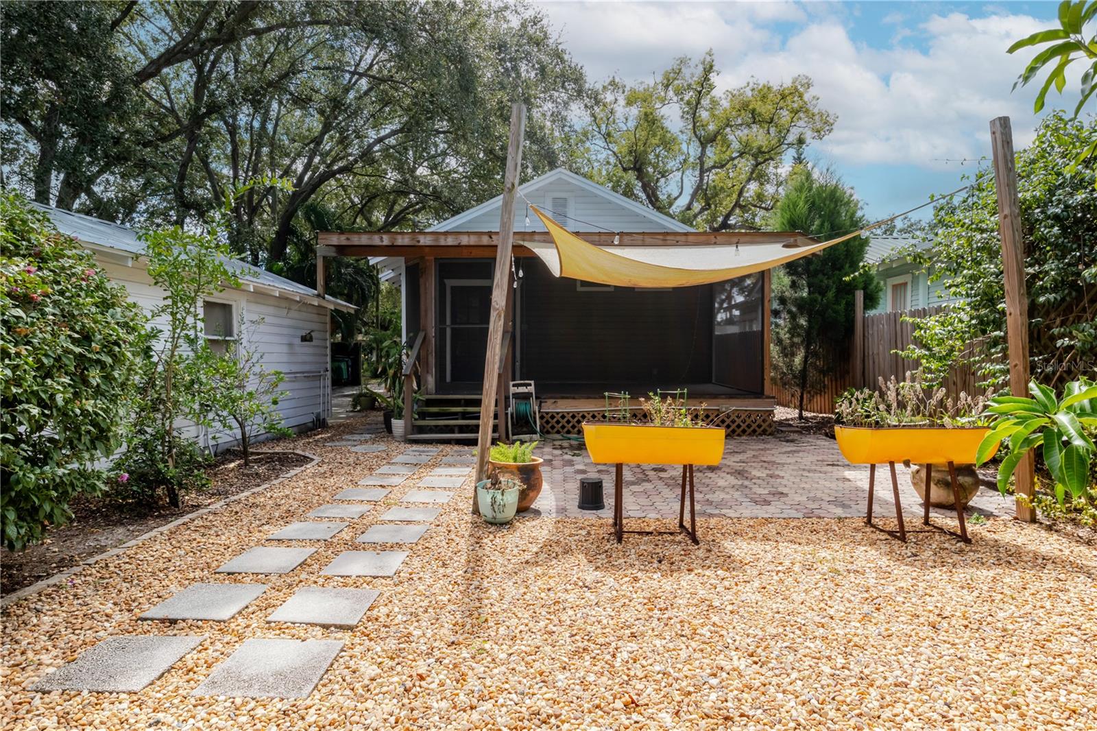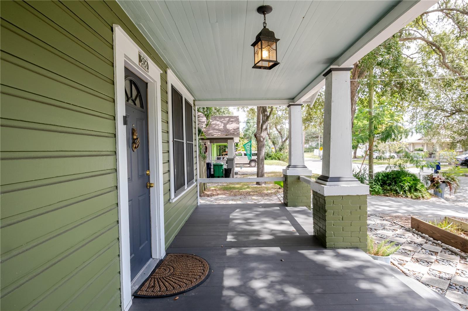 Fall in love with this beautifully restored 1920s Seminole Heights bungalow! A wide, welcoming front porch invites relaxed evenings and friendly conversation along one of the neighborhood’s most picturesque cobblestone streets. Inside, this 2-bedroom, 2-bath charmer blends timeless character with thoughtful updates, offering a move-in-ready home filled with natural light and warmth. Last year, the home underwent an extensive restoration true to its historic roots. The original novelty wood siding was uncovered beneath layers of aluminum, carefully repaired, sanded, and freshly painted in an authentic historic color palette. Every window was restored—re-roped, fitted with new brass hardware, and complemented by custom exterior screens and clear storm panels for durability. The front porch was fully rebuilt, with reinforced beams and premium 3-inch KDAT tongue-and-groove decking designed to last for decades. Rafter tails were artfully exposed and even featured on a historic homes website, underscoring the craftsmanship and attention to detail throughout. Recent updates enhance both comfort and peace of mind, including a new roof (2020), refinished and painted kitchen cabinets (2023), and fresh landscaping and fencing (2024). The detached 320-square-foot garage offers abundant storage and flexible use for hobbies or a workshop. The wide-open living spaces, showcase gorgeous original hardwood floors and mid-century style light fixtures. They flow seamlessly into a large kitchen, featuring a pull-out pantry and French doors leading to the back porch, giving an indoor/outdoor feel. The spacious screened back porch provides the perfect place to relax year-round—whether you’re enjoying morning coffee, evening breezes, or hosting friends while overlooking the lush backyard. The master bedroom features a private bathroom, with a custom shower and additional closet. Both bathrooms have their own 1920’s flare with period tile. The fully fenced backyard offers plenty of room to garden, entertain, or unwind beneath mature shade trees, and includes multiple fruit-bearing trees—bananas, papayas, and mangos—creating a private tropical retreat right at home. Other edible plants include a kaffir lime tree, lemon tree, hibiscus plant, and lemongrass. Located in the heart of Seminole Heights, you’ll be walking distance from beloved local favorites— DI Coffee, The C House, Rooster & Till, Valhalla Resale, Gulf Coast Sourdough, among other fantastic cocktail bars and breweries—all with quick access to I-275 for easy commuting across Tampa Bay. Walk or bike to riverfront parks or the Seminole Garden Center or take a quick stroll to the Farmer’s Market and other holiday events held at the Seminole Heights UMC. Come experience the charm, history, and community that make this one of Tampa’s most sought-after and character-filled neighborhoods.