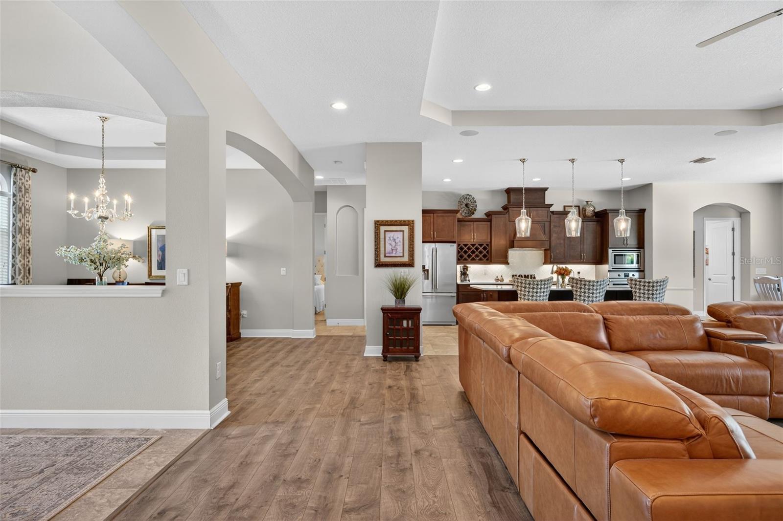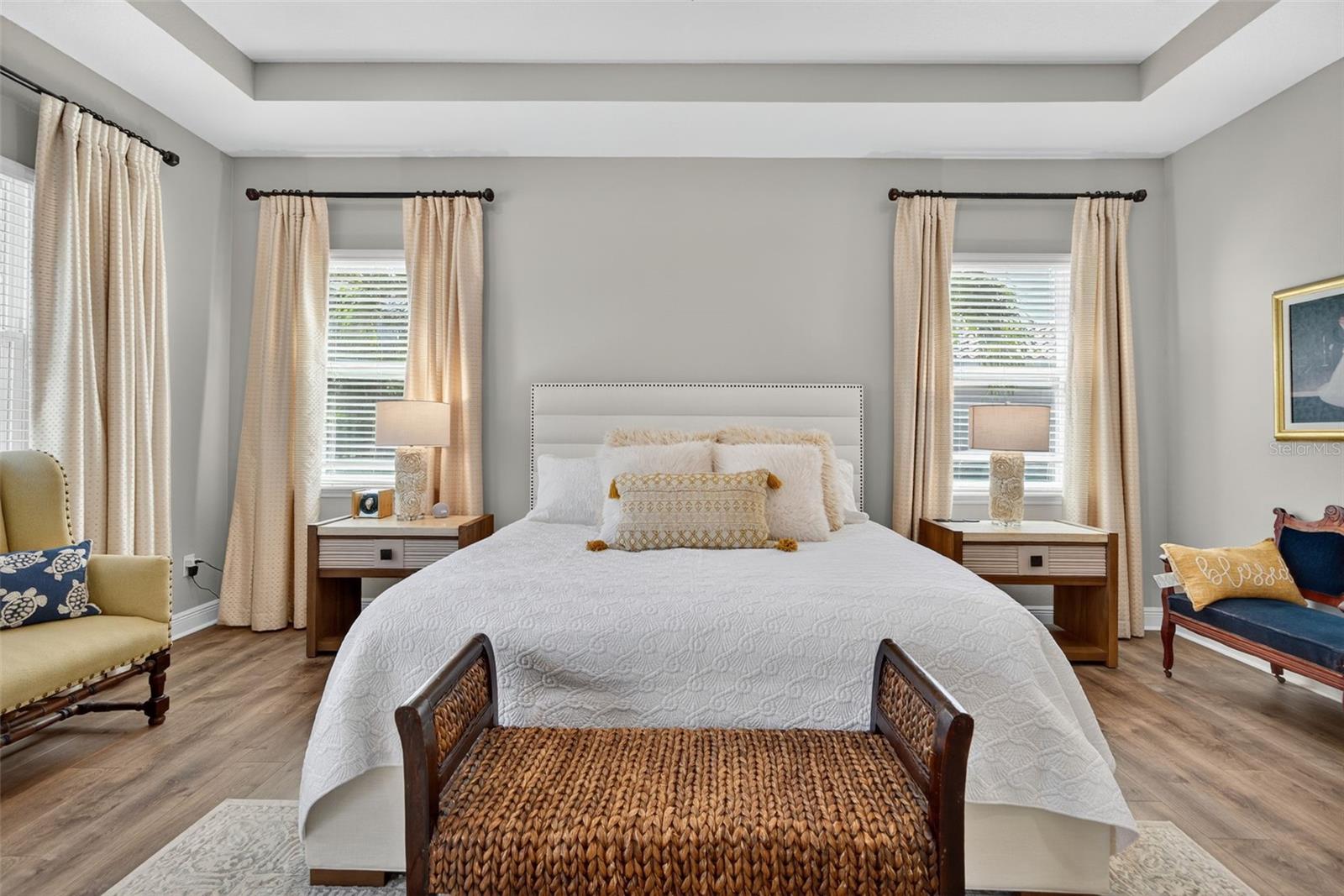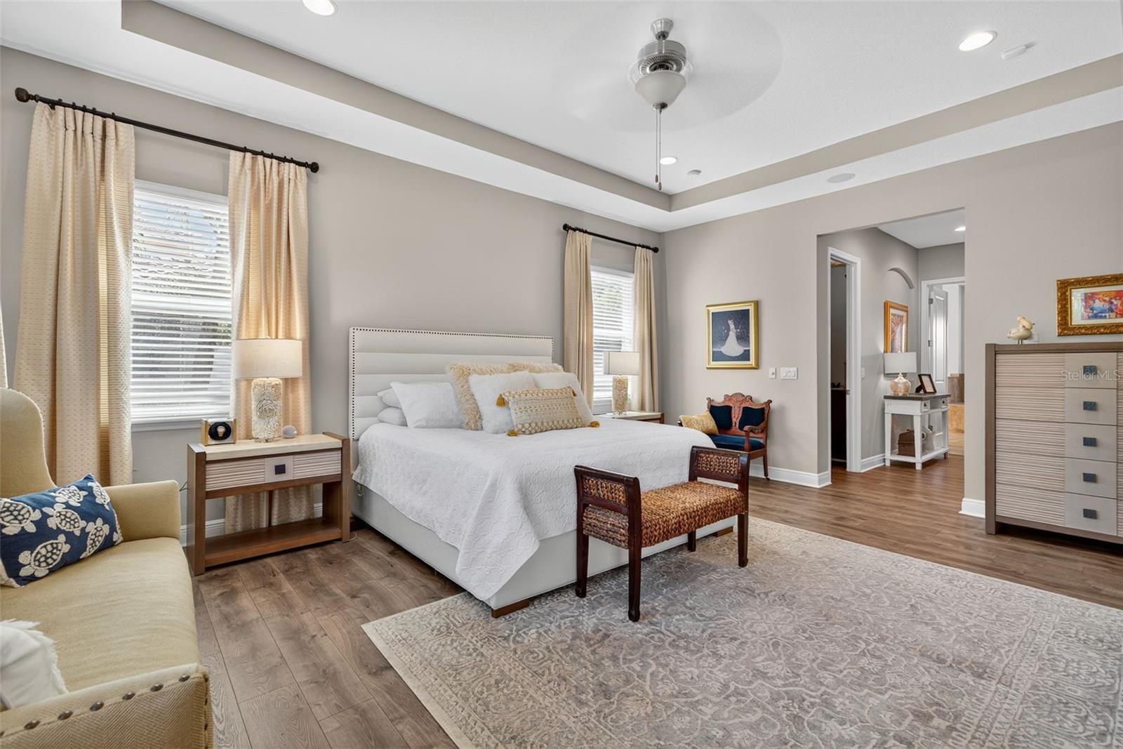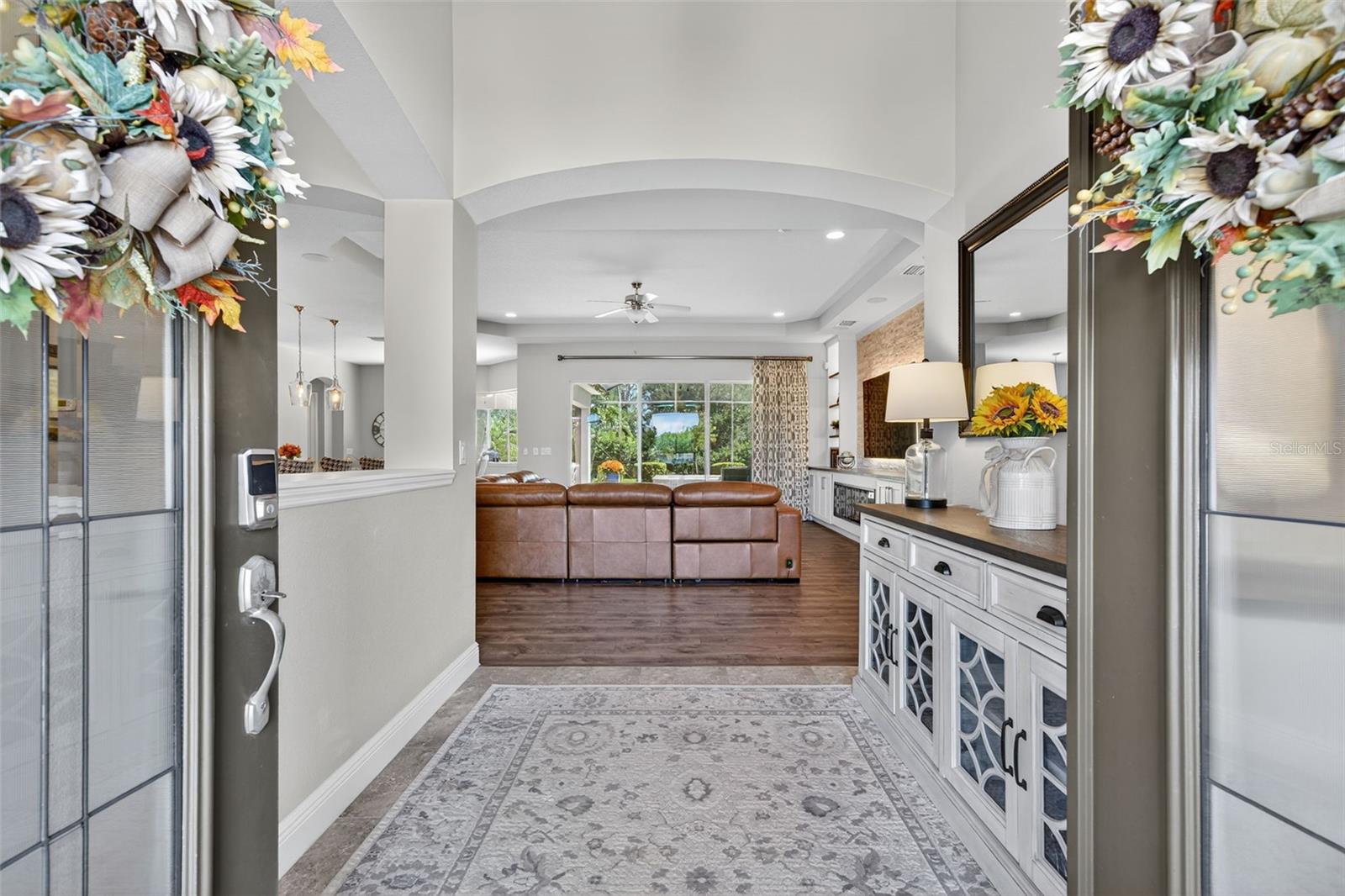 Built-in Features, Ceiling Fans(s), Central Vaccum, Eat-in Kitchen, High Ceilings, Kitchen/Family Room Combo, Open Floorplan, Primary Bedroom Main Floor, Solid Wood Cabinets, Split Bedroom, Stone Counters, Tray Ceiling(s), Walk-In Closet(s), Window Treatments