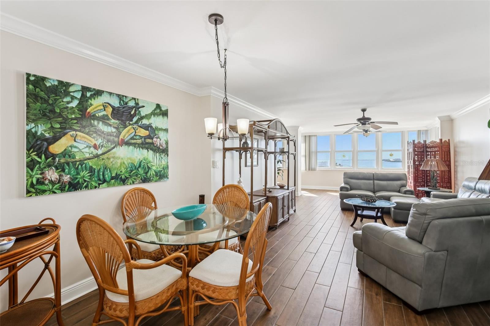 Ceiling Fans(s), Crown Molding, Eat-in Kitchen, High Ceilings, Living Room/Dining Room Combo, Open Floorplan, Primary Bedroom Main Floor, Solid Surface Counters, Thermostat, Walk-In Closet(s), Window Treatments
