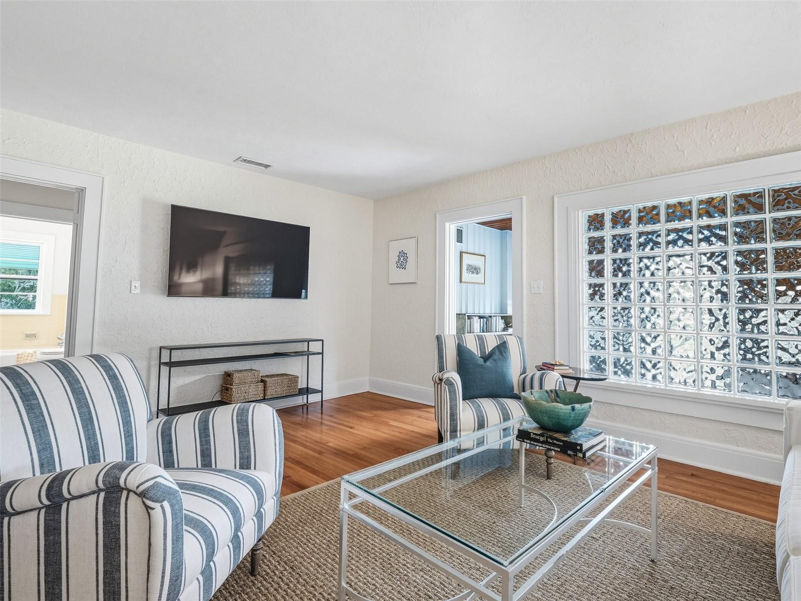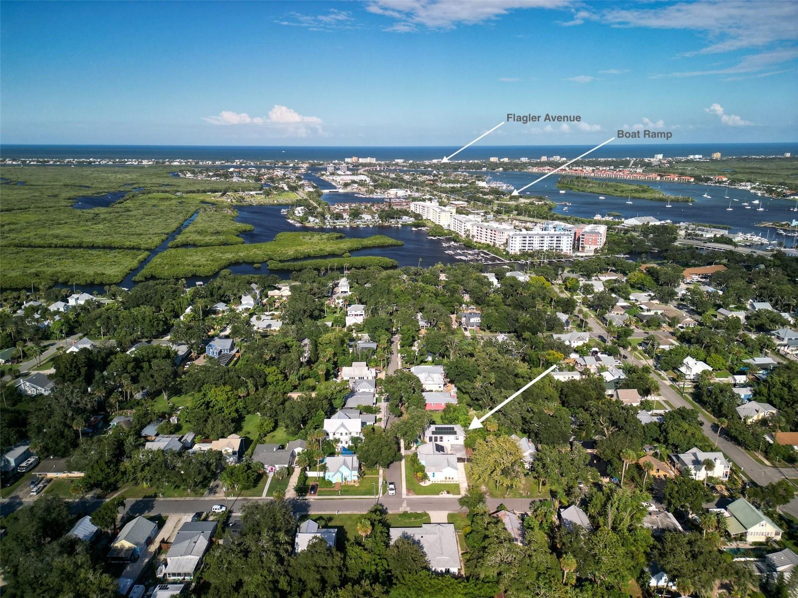 Downtown New Smyrna Beach gem featuring 3 bedrooms, 3.5 baths a private pool and guest quarters. Don’t miss the opportunity to own this truly unique property, ideally situated on a charming corner lot just half a mile from vibrant Canal Street shops, restaurants, and events. Step onto the sunny front porch and into the original 1939 home, where vintage charm meets thoughtful modern updates. The main residence features 2 bedrooms and 2 full baths, with pristine wood flooring in the living room, dining room, and bedrooms. A bright and functional kitchen flows into a spacious family room and utility area, all overlooking the lush, secluded backyard. Tucked away behind tropical landscaping and privacy fencing, the backyard is a private oasis—perfect for entertaining or enjoying quiet solitude. The recently completed 968 square foot guest house includes a private bedroom and bath en-suite, soaring ceilings, a convenient kitchenette, a half bath, and an expansive screen-enclosed lanai with automated shutters. It offers ideal space for in-laws, a home office, or your personal retreat. Enjoy a resort-like lifestyle with expansive travertine decking and a recently built 28.5 x 9.3 pool and separate spa (both utilizing a state-of-the-art UV sanitizing system). An outdoor shower makes cleanup easy after a day at the beach or nearby boat launch just 1 mile away! Flagler Avenue is only 1.5 miles from your door and the beach another half mile further. The home’s sustainability features are equally impressive. The fully paid-for solar system installed in 2022 powers 100 percent of the electric bill. The owner pays a nominal $8.25 monthly base utility rate and receives rebate checks from NSBUC. Well for irrigation. Additional upgrades include -- Two new HVAC systems (2023), Two new tankless gas water heaters (2023). Roofs replaced in 2017 (main house) and 2022 (guest house). There are separate heat pumps for both the pool and spa and the spa is electric heated. Please exclude the dining room light fixture. . This one-of-a-kind property blends comfort, efficiency, and versatility in a prime location. Whether you're hosting guests, working from home, or simply relaxing in your private paradise, this home is ready to welcome you.