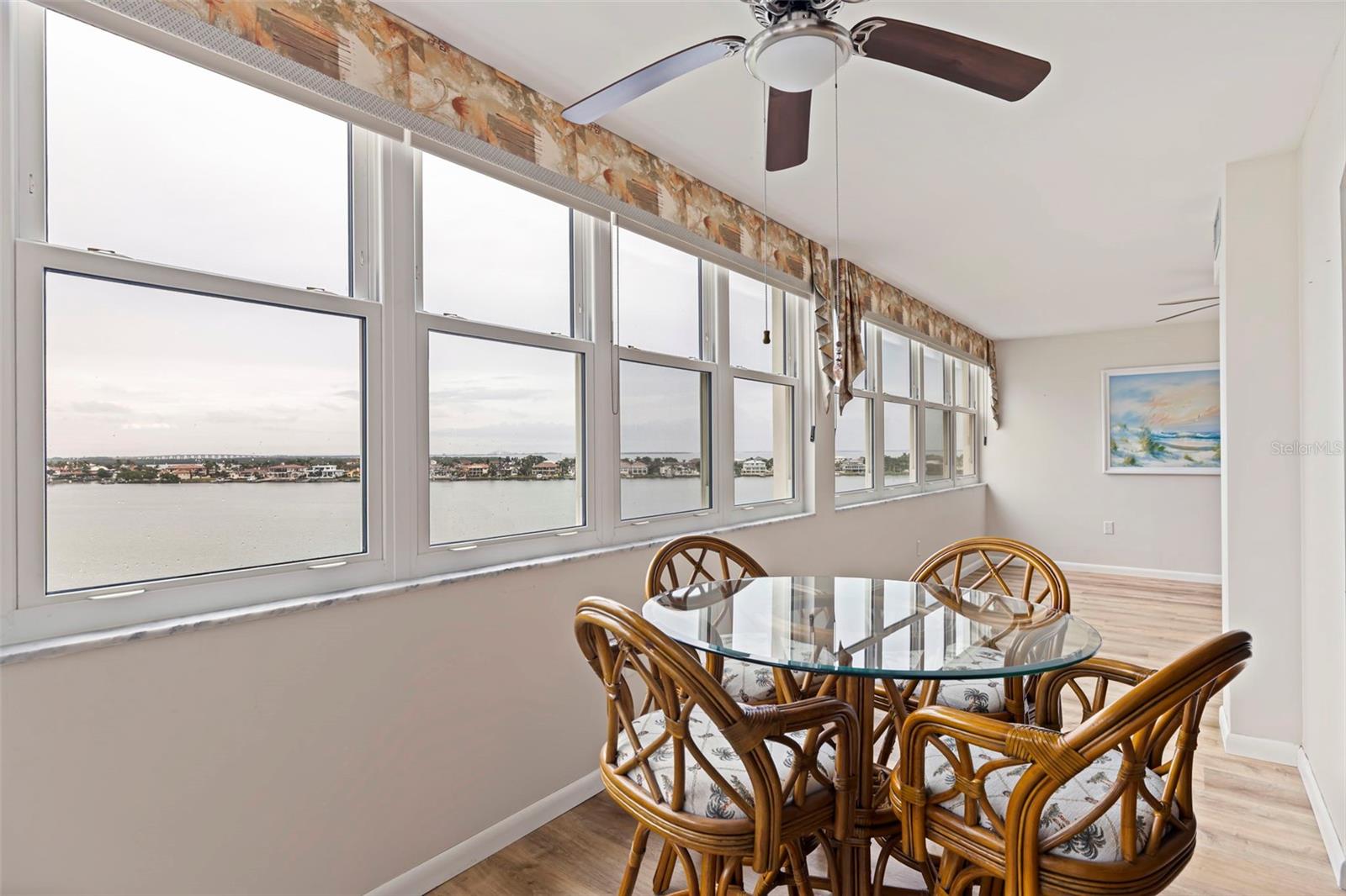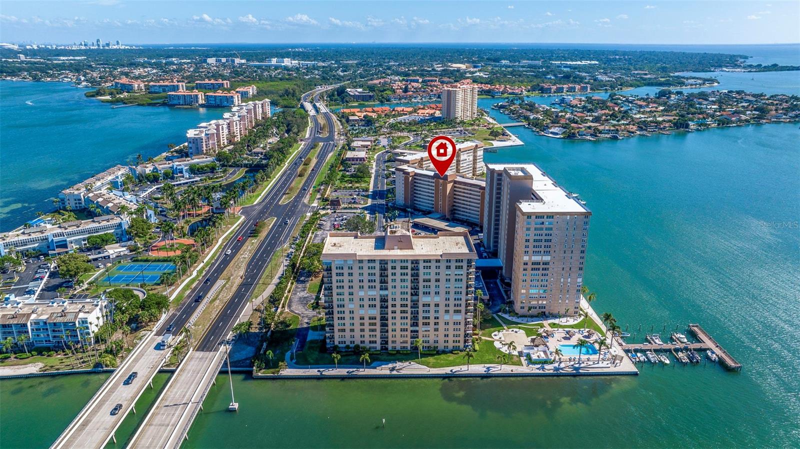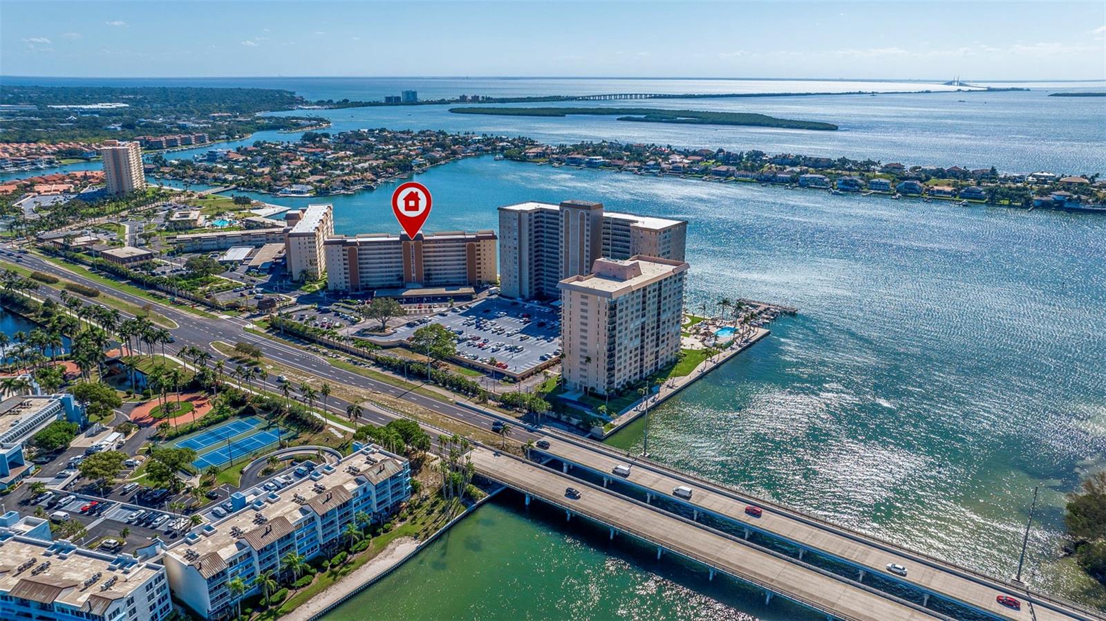 This spacious 2-bedroom, 2-bathroom condo spans 1, 605 square feet and is perched on the 8th floor, offering stunning open water views of Boca Ciega Bay and the famous Skyway Bridge at a distance with its stunning nightly colors. It is located in the Bayway Isles Point Brittany neighborhood of St. Petersburg, Florida, a serene and well-maintained 55+waterfront enclave known for its laid-back lifestyle, and its resort style amenities. The condo features a large living room/dining room with crown molding, wood laminate flooring, is perfect for entertaining, and has a bright wrap-around Florida room that can be used as a den, office, or sunroom. The unit has been recently updated with new features such as fresh paint, new high-impact windows, new flooring and new water heater. The kitchen with tile flooring is well equipped, with modern appliances and solid wood cabinets. Split bedroom layout. Massive primary suite (25 x 14) with large walk-in closet and wood laminate flooring, en suite bathroom with walk-in shower, ceramic tile floor. Carpeted guest bedroom also with a large walk-in closet. Guest bathroom with new cabinets, sink and countertop. The community boasts 4 heated pools, spa, fitness center, tennis courts, EV charging station, Kayak storage/launch area is being rebuilt (soon to come) fishing pier, first come first served boat slips. Recreation area with a multitude of activities. Minutes from St. Pete Beach and Fort de Soto Park. 15 minutes to downtown St. Petersburg for dining, arts, and shopping. Easy access to I-275, making Tampa and the airport reachable in about 30 minutes or so. Making this residence your full-time home or winter residence, you will enjoy what Point Brittany is well known for. Milestone inspections have been completed. All Assessments have been paid. Enjoy Florida living at its best!