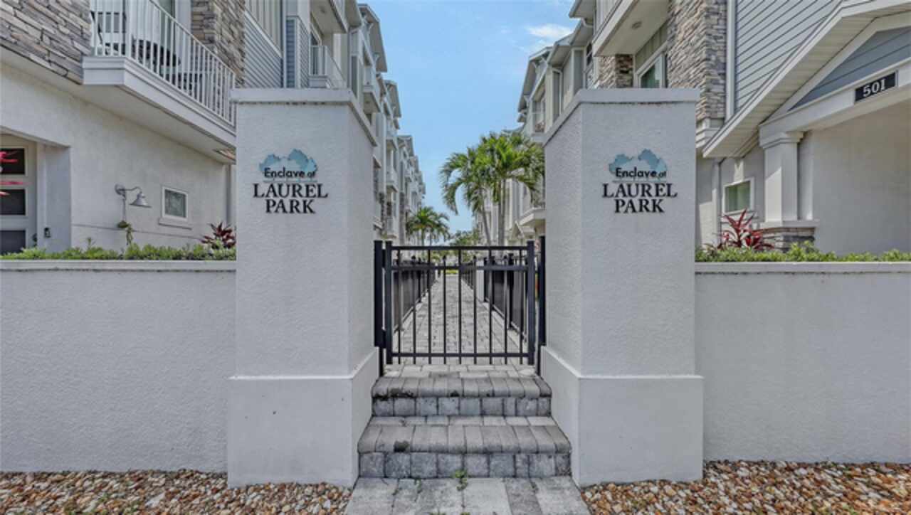 It really is all about the location. The best value in Sarasota's iconic Laurel Park historic district for a single-family residence, bar none. Fee simple ownership, NOT a condominium. Fully adorned in tasteful taupe and grey urban chic, this beautiful multi-level urban townhome absolutely has everything; high end engineered hardwood flooring in the living areas, three spacious bedrooms all with en suite designer baths and walk-in closets, a den/office, an elevator servicing all floors, an upstairs dry bar with beverage cooler, three large interior storage closets, and a two car garage. The large well-designed chef's kitchen includes quartz countertops, solid wood cabinets, induction cook top, stainless steel appliances and a large center island featuring a breakfast bar. At over 2400 square feet of living space, the large open concept living area is sure to impress. Impact rated windows and sliding glass doors offer energy efficiency, sound dampening, safety and peace of mind. This well maintained, gently lived-in six years new townhome is perfectly situated in one of Sarasota's most sought-after neighborhoods and is convenient to all Sarasota has to offer; downtown shopping and restaurants, Lido Beach, Siesta Beach, Bayfront Park, Laurel Park, Southside Village, and nearby Payne Park. Maintenance free living in the heart of downtown. A lot to like!