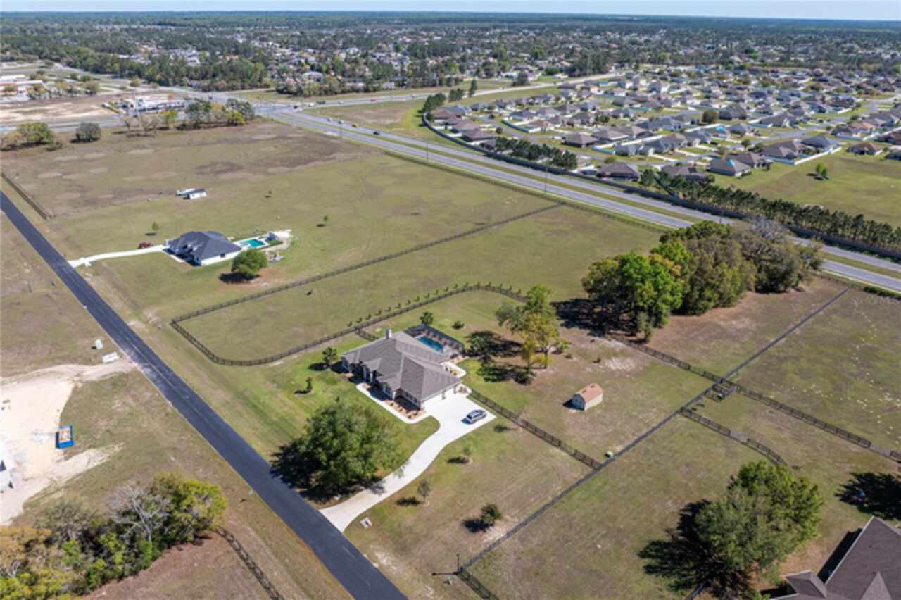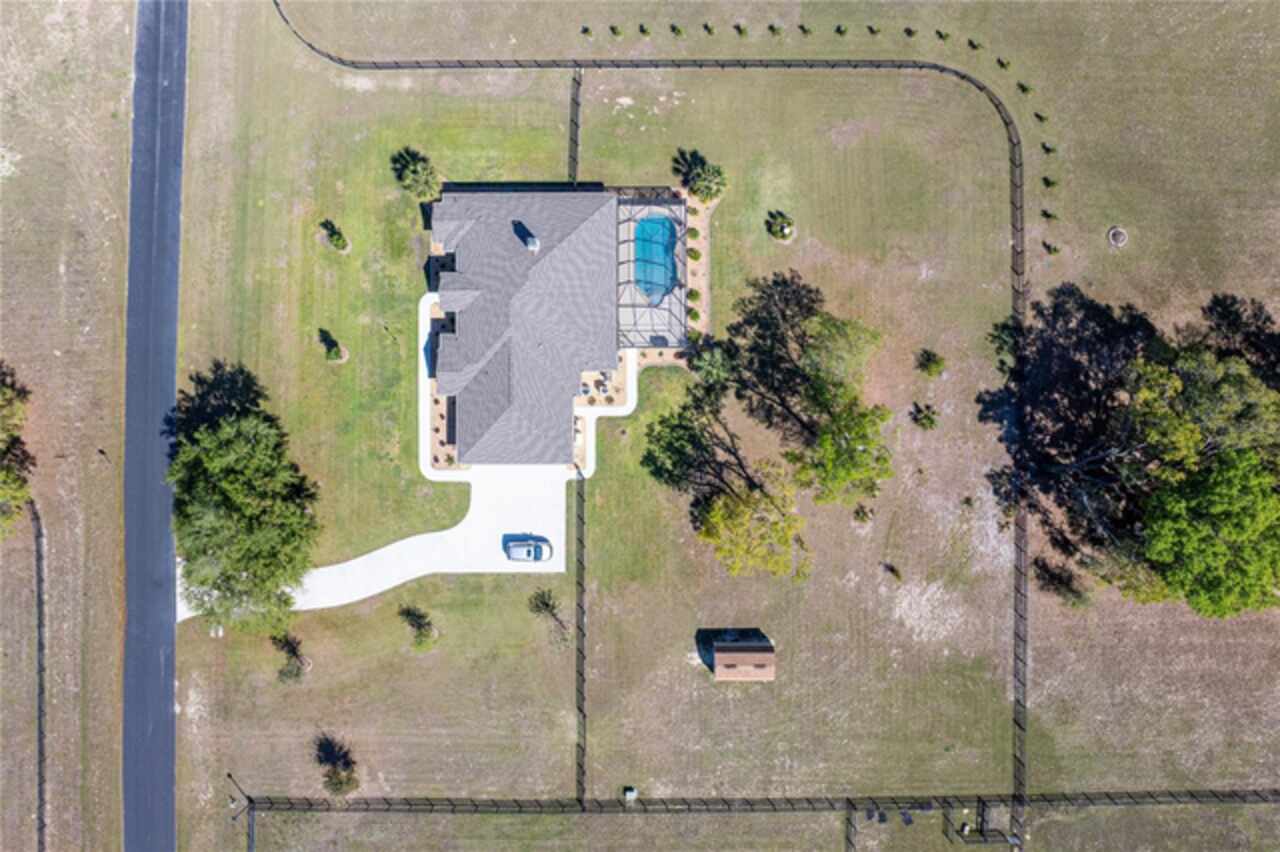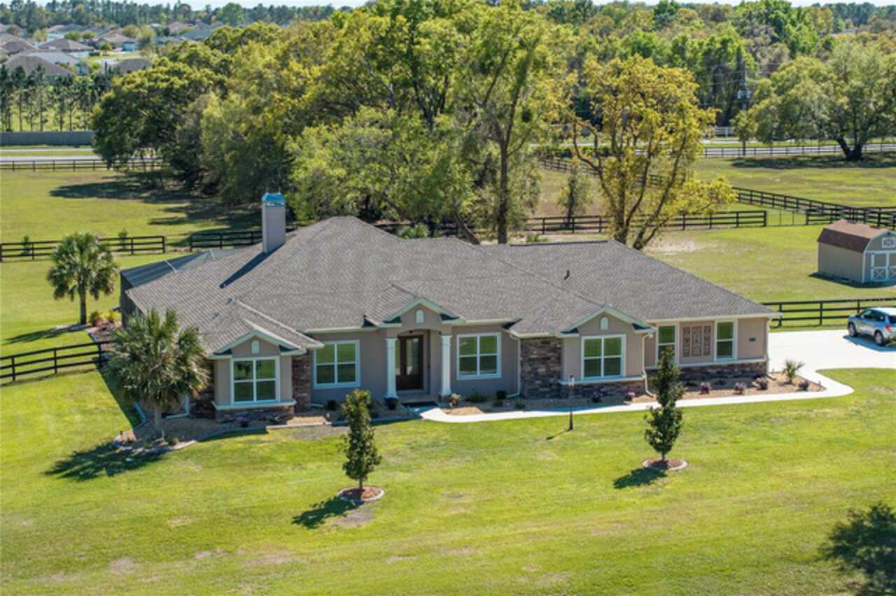 Welcome to Bradford Farms Equestrian community! – 5.32 +/- acre equestrian estate in a gated equine community. This luxurious 4-bedroom, 3-bathroom home offers an open floor plan with stunning views of the screened-in outdoor pool and Central Florida countryside. The residence is bright and inviting, with an office and triple split-bedroom layout, cathedral ceilings, and a cozy fireplace. For culinary enthusiasts, the eat-in kitchen is a dream come true, featuring a large eat-in kitchen with Cherry cabinets, granite countertops, a large island with seating, Bosch 800 Series appliances, a 5-Burner gas cooktop, a built-in wine rack, accent lighting, and a walk-in pantry. The great room has an 11’ pop ceiling, built-in features, a gas fireplace, built-ins, plus French doors leading to the lanai and pool area. The primary suite boasts two walk-in closets and a luxurious en-suite bathroom with dual vanities, a walk-in shower, and a soaking tub. Spacious laundry room with a laundry sink, granite countertops, and built-in cabinets. The expansive back patio is ideal for hosting gatherings, with a generous covered area that provides ample seating, creating a warm and inviting atmosphere for entertaining, whether during the day or evening. To enhance your experience, a heated saltwater pool adds an extra layer of enjoyment to your outdoor space. 3-Bay heated and cooled garage. 12’ x 20’ cook barn-style outbuilding for the use of your choice. The property has some pet-fenced areas and two fenced paddocks. Additionally, the property includes a whole-house generator, 2 On Demand LP water heaters, and a Lightning arrestor system. It is located close to shopping, medical facilities, and restaurants. Equestrian enthusiasts will enjoy the nearby Florida Greenway trail system. Experience luxury living and equestrian excellence in this exceptional estate!