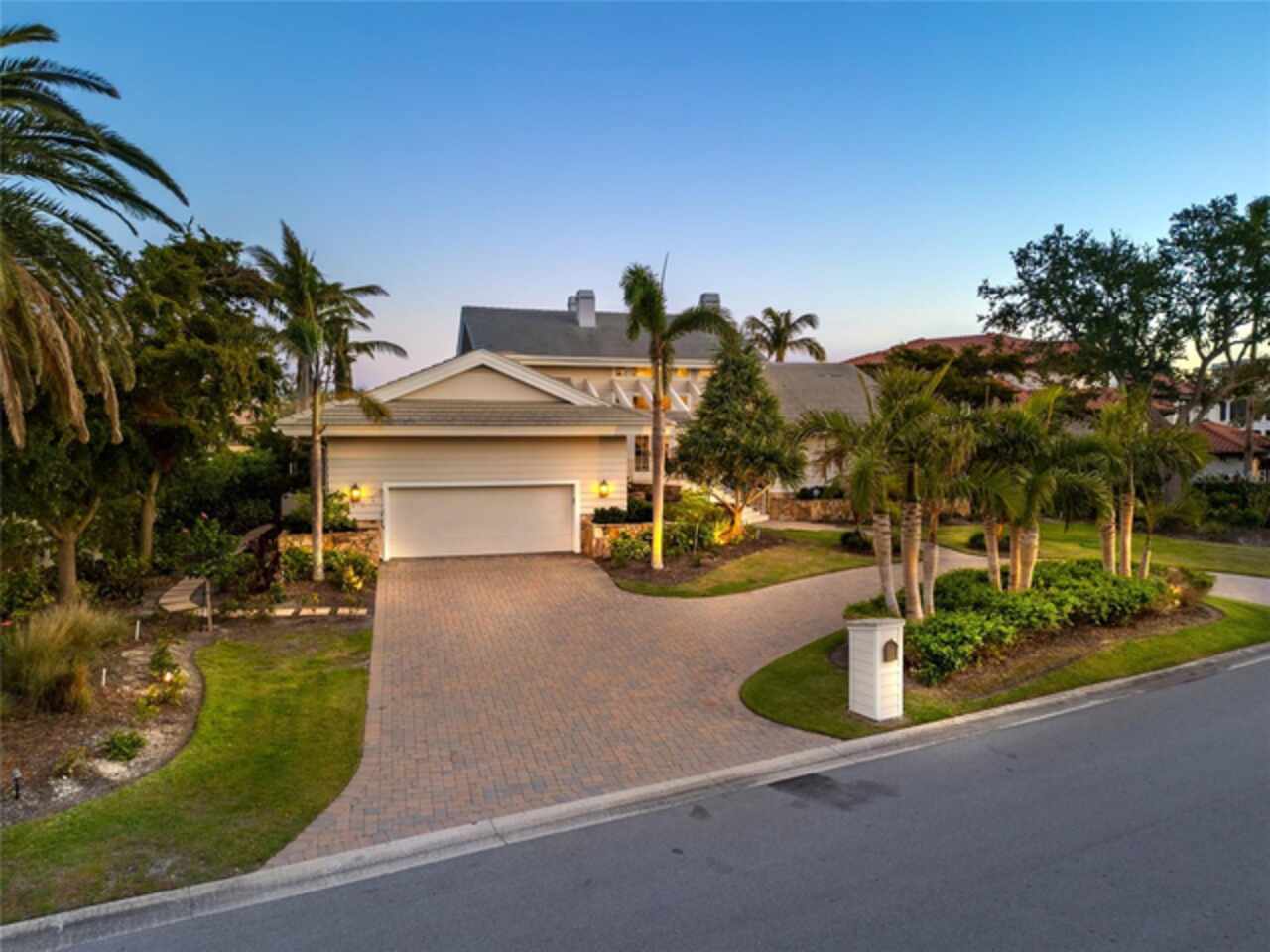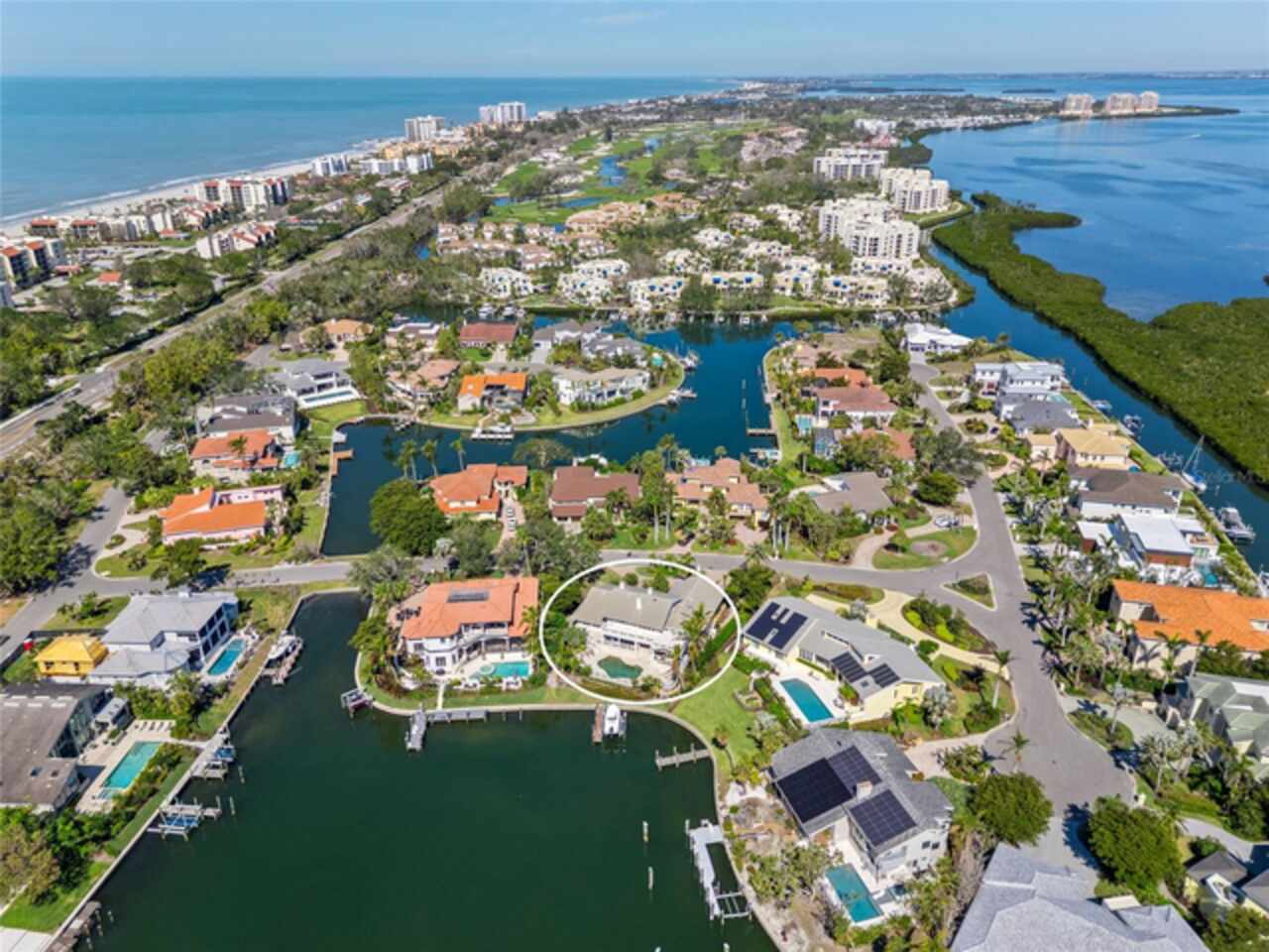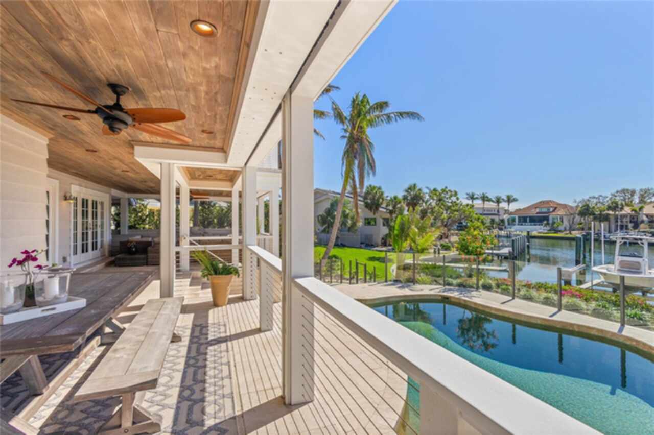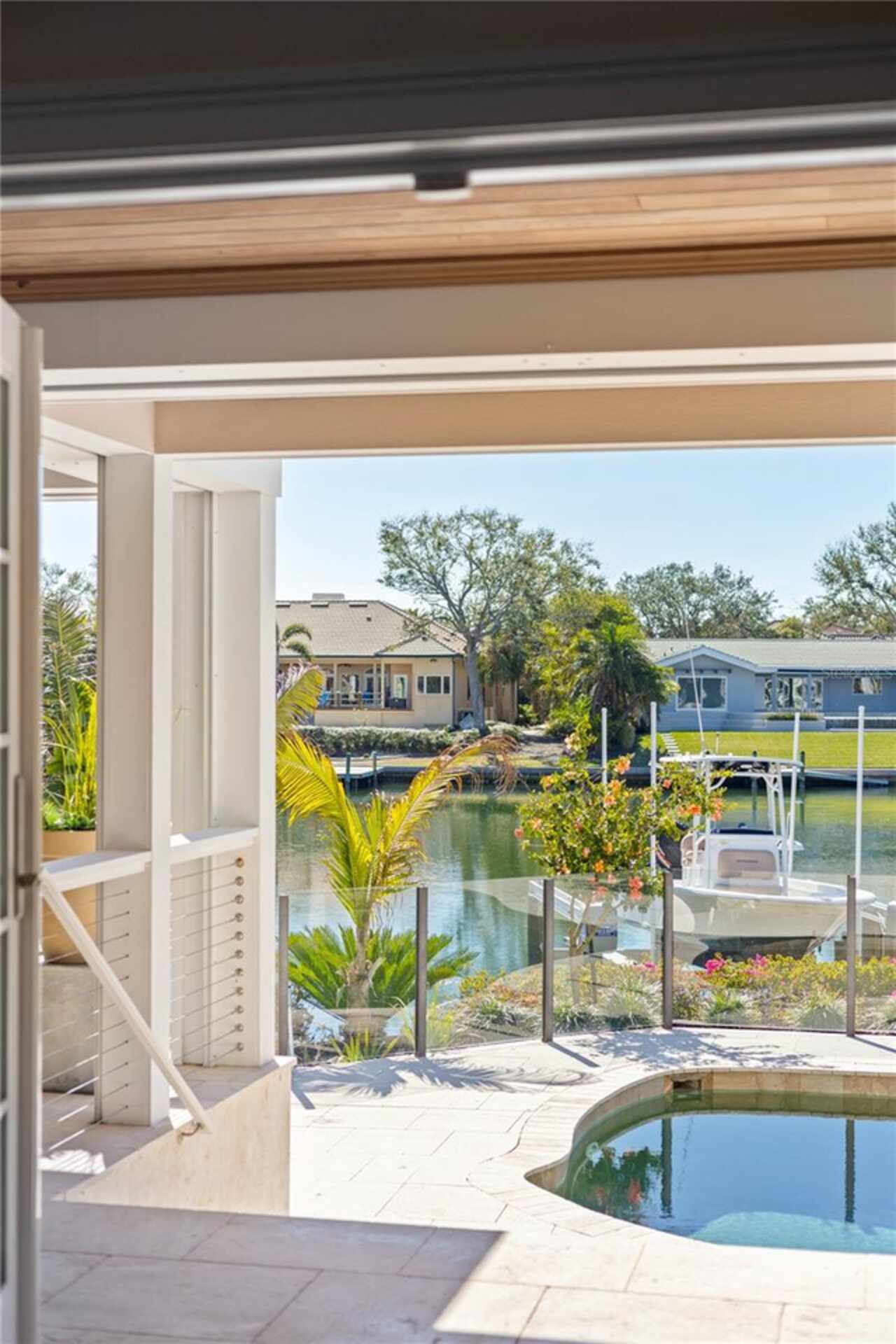 This exquisite two-story waterfront home located in the coveted Harbor section of Bay Isles has been meticulously renovated to embody modern elegance and luxurious coastal living. Surrounded by lush tropical landscaping, the home welcomes you through an elegant French door entrance into the grand foyer, where soaring ceilings, gleaming travertine flooring, and a striking wrought iron floating staircase with rich, dark wood steps set the tone for the refined elegance that unfolds throughout the home. The lower level boasts a bright and airy open space with hardwood floors throughout, creating a welcoming atmosphere that effortlessly combines sophistication with the timeless beauty of natural materials. The spacious family room is anchored by a stunning fireplace with decorative columns and an elegant mantel, complemented by French doors leading to the expansive waterfront lanai, reinforcing the home's seamless connection to its stunning natural surroundings. A culinary enthusiast’s dream, the generously sized kitchen features a large island with a waterfall granite countertop, custom cabinetry, ample storage space, and high-end stainless steel appliances, including a six-burner gas range and double ovens. Adjacent to the kitchen, the dining area and great room spaces flow seamlessly into each other. The great room is both grand and inviting, showcasing a dramatic wood-clad cathedral ceiling that adds warmth and character. A second stone fireplace enhances the ambiance, while three sets of French doors that open onto the lanai offer an effortless transition between indoor and outdoor living. Also on this level are two generous guest suites, each with a full bath, one with direct lanai access, and a den with full bath. Upstairs, the primary suite is a true retreat. Floor-to-ceiling windows illuminate the space, and French doors open to a spacious private balcony, offering captivating water views that create a peaceful escape. A cozy fireplace adds to the intimate atmosphere, while the spa-inspired en-suite bath indulges with marble flooring, soaking tub, dual vanities, frameless glass walk-in shower, and water closet, all overlooking the serene waterway. The outdoor living space is equally spectacular, designed for both relaxation and entertaining. The expansive lanai features multiple covered areas with a rich wood-clad ceiling and retractable screens, a sun-drenched open-air section, and a stunning saltwater pool with travertine decking framed by verdant tropical landscaping. Just beyond the pool, a private dock with a boat lift sits on a deep-water basin and wide canal with no bridges to Sarasota Bay, offering quick and direct access for boating enthusiasts. Bay Isles Beach Club membership is included. This extraordinary home seamlessly blends elegance, comfort, and the unparalleled beauty of waterfront living, creating a sanctuary that is as functional as it is breathtaking.