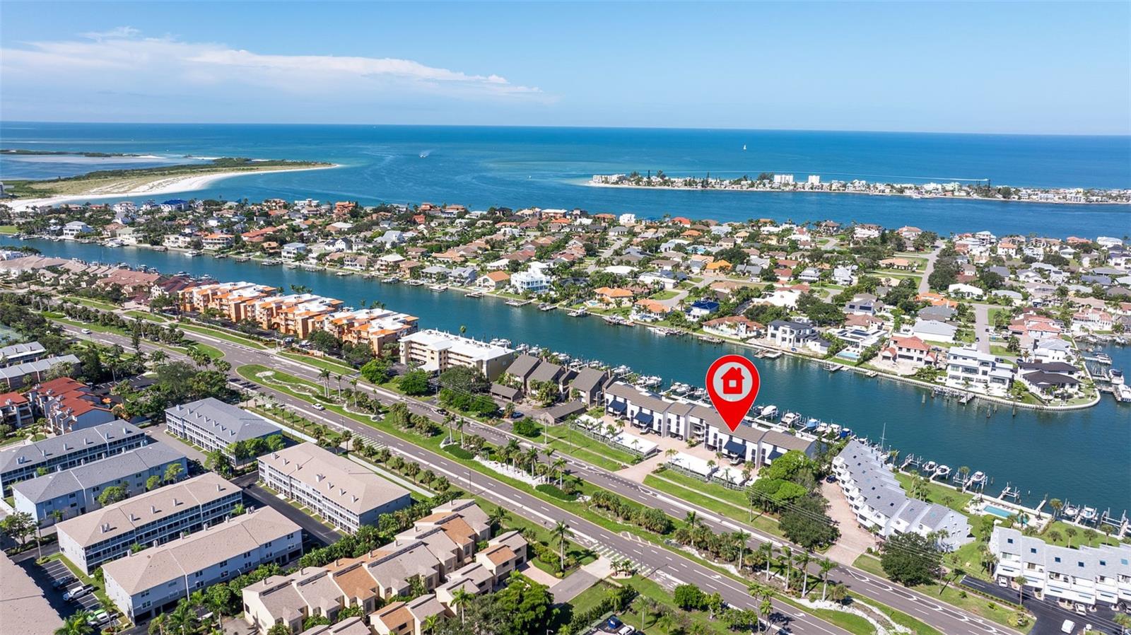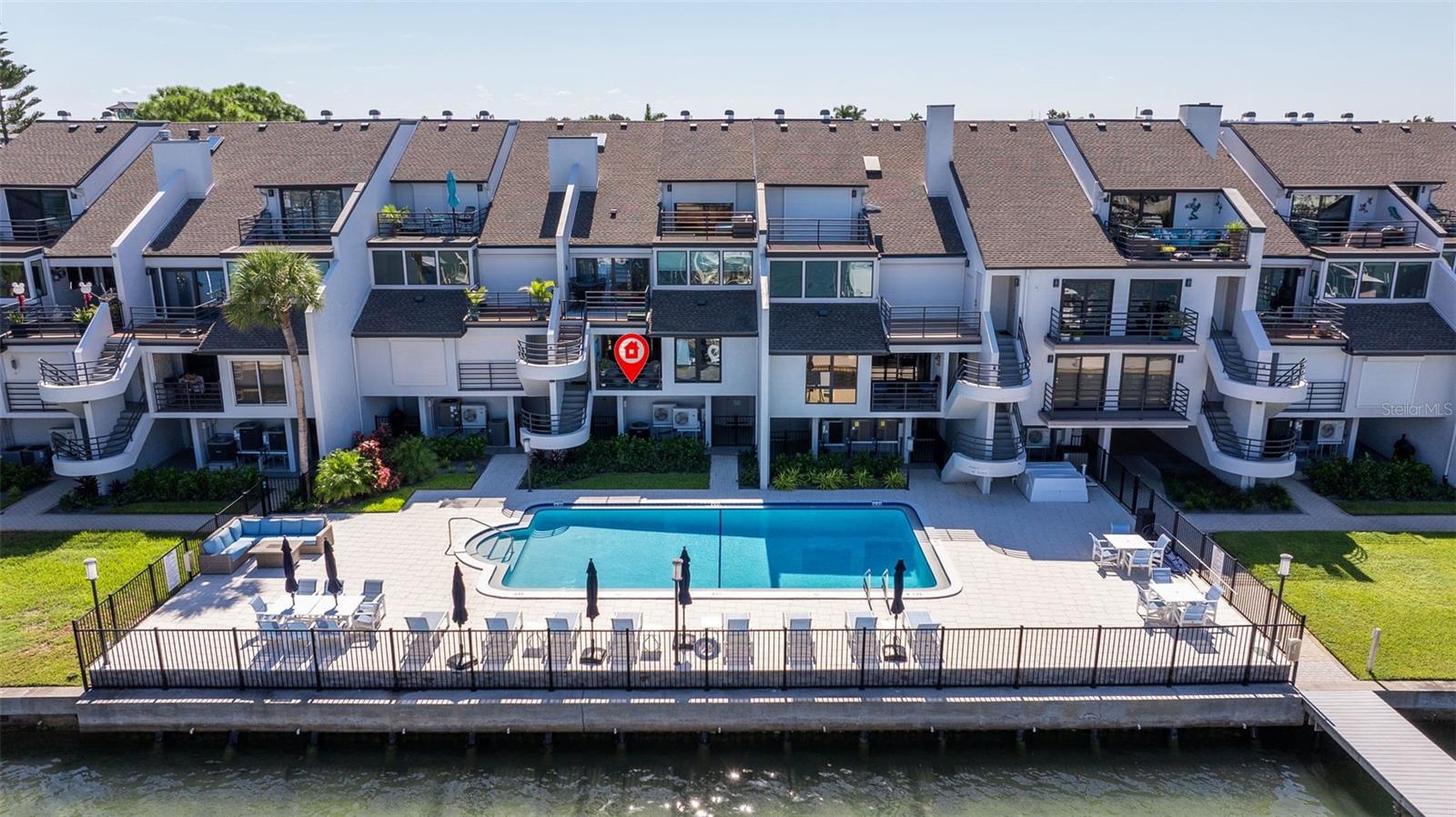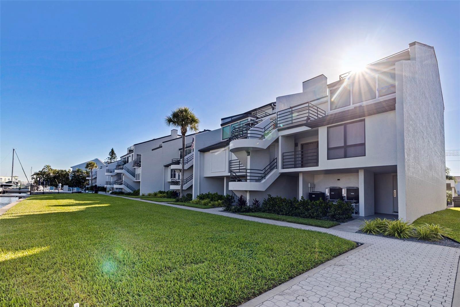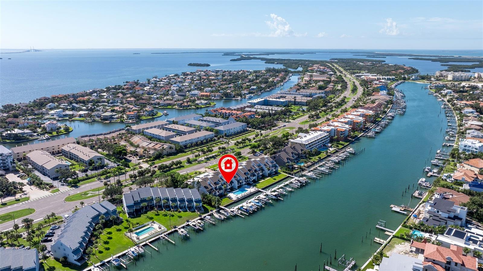 Coming home every evening to magical sunsets over Tierra Verde’s Grand Canal — this is the waterfront lifestyle you’ve been dreaming about. Spacious, open, and thoughtfully designed, this 2-bedroom, 2-bath condo offers effortless coastal living in a vibrant, welcoming community. The friendly entry with inviting porch greets you even before you step inside, showcasing the warmth of island life. As you enter, the elegant coastal-inspired kitchen on your right features soft blue cabinetry, quartz counters, and a breakfast bar with seating for casual dining. On the left, the dining area includes a custom built-in wood bar and beverage fridge — perfect for serving to the dining table next to and entertaining guests. The tiled living area flows naturally with space for your sofa and TV while overlooking the balcony and sparkling Grand Canal, with a private back door entry staircase down to the heated pool for added convenience. The primary suite is a true resort-style retreat with sweeping water views, custom lighting, an oversized walk-in closet, two separate vanities, and a fabulous spa-like walk-in shower. The guest bedroom, enjoys ample daylight, a spacious walk-in closet, and an updated bath. Full-size side-by-side washer and dryer plus additional large storage room downstairs with new water softener to complete the unit. Easy to maintain and lock-and-leave, it’s perfect for full-time living or as a second home. 2 assigned parking spots plus available guest parking spots in this waterfront, pet friendly, freshly painted and landscaped community. Featured amenities include a recently updated pool and fitness center. Enjoy waking or biking: designated bike and walk trail along Pinellas Bayway or downtown Tierra Verde, which offers several island restaurants. Scenic walk or ride across the bridge brings you to Isla del Sol Golf and Country Club. with close proximity to Fort De Soto Park and best local beaches, only 10 mins to Downtown St. Pete, and 40 mins to Tampa International Airport. Complete your lifestyle package with the deeded boat slip and 13, 000 lb lift. Furniture is optional, and the boat can be included— simply make an offer.