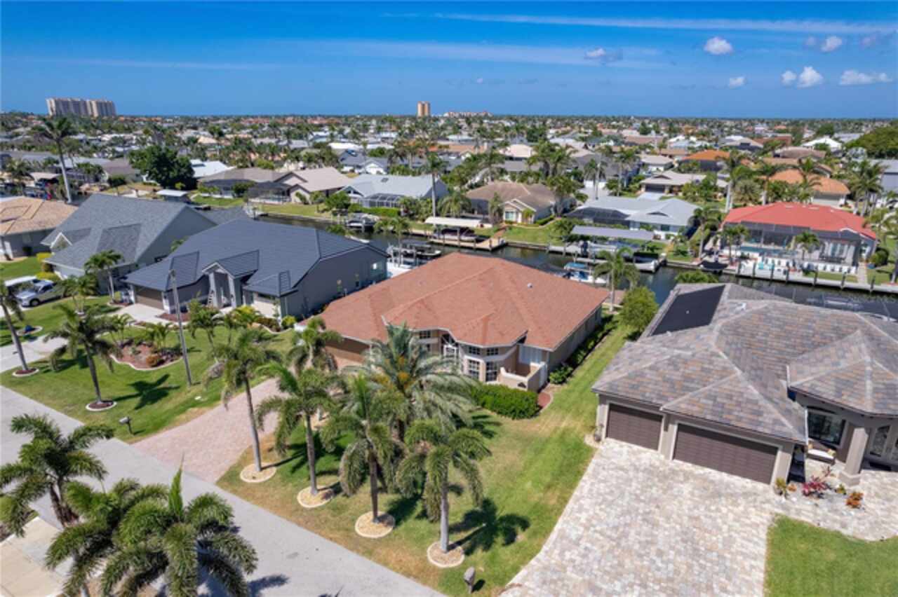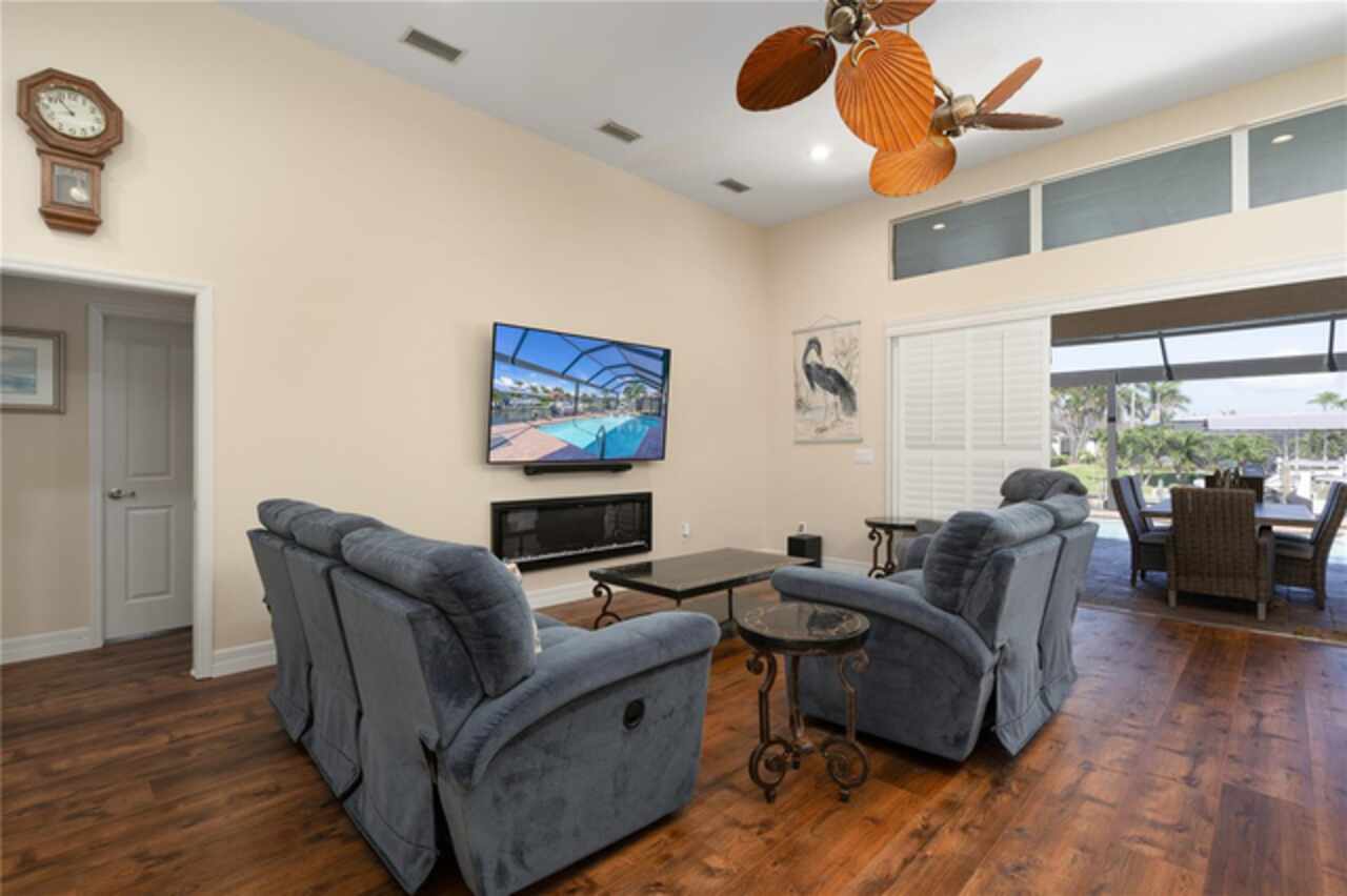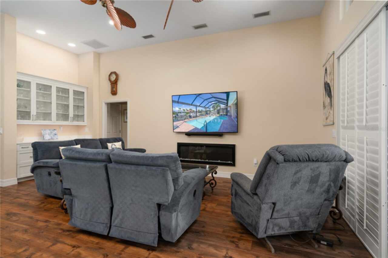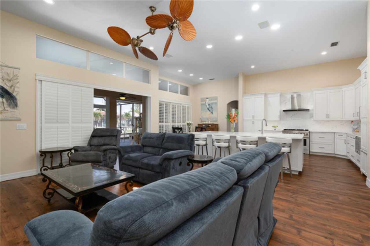 Welcome to your waterfront oasis with Gulf access and no bridges, offering the perfect blend of luxury, functionality, and outdoor living. This 3-bedroom plus den, 3-bath home is nestled on a wide canal and boasts a private boat dock and lift, making it a dream for boaters. Enjoy unforgettable sunsets from your beautiful saltwater pool and spa, all enclosed within a screened lanai for year-round enjoyment. Step inside and be captivated by the open-concept layout and rich wood laminate floors that flow throughout the home (bathrooms feature tile). The split-bedroom floor plan with volume ceilings creates privacy and openness all at once, perfect for both entertaining and everyday living. Plantation shutters throughout the home add timeless elegance and light control. The heart of the home is a spacious kitchen designed for both style and performance. Featuring cabinetry with crown molding, Quartz countertops, a large cook island with seating, and a high-end gas range, it’s a culinary dream. There’s even a dedicated bar area with glass cabinets and a beverage refrigerator, ideal for entertaining. The primary suite is a true retreat with a walk-in closet, a spa-inspired bathroom featuring a deep soaking tub, an expansive Quartz vanity, and a frameless glass walk-in shower. Two additional bedrooms, three full baths, and a flexible den with ample space for guests, hobbies, or a home office. Additional updates include a new roof (2018), AC unit (2019), and appliances (2021). What truly sets this home apart is the rare 500-gallon propane tank that fuels the gas range and is available for other uses as desired—adding convenience and value. Step out to the covered patio with paver flooring and ceiling fans, the perfect setting for poolside dining or relaxing while taking in tranquil sunset views over the canal. Whether you're boating, entertaining, or simply enjoying the serenity of waterfront living, this home offers the ultimate Florida lifestyle.