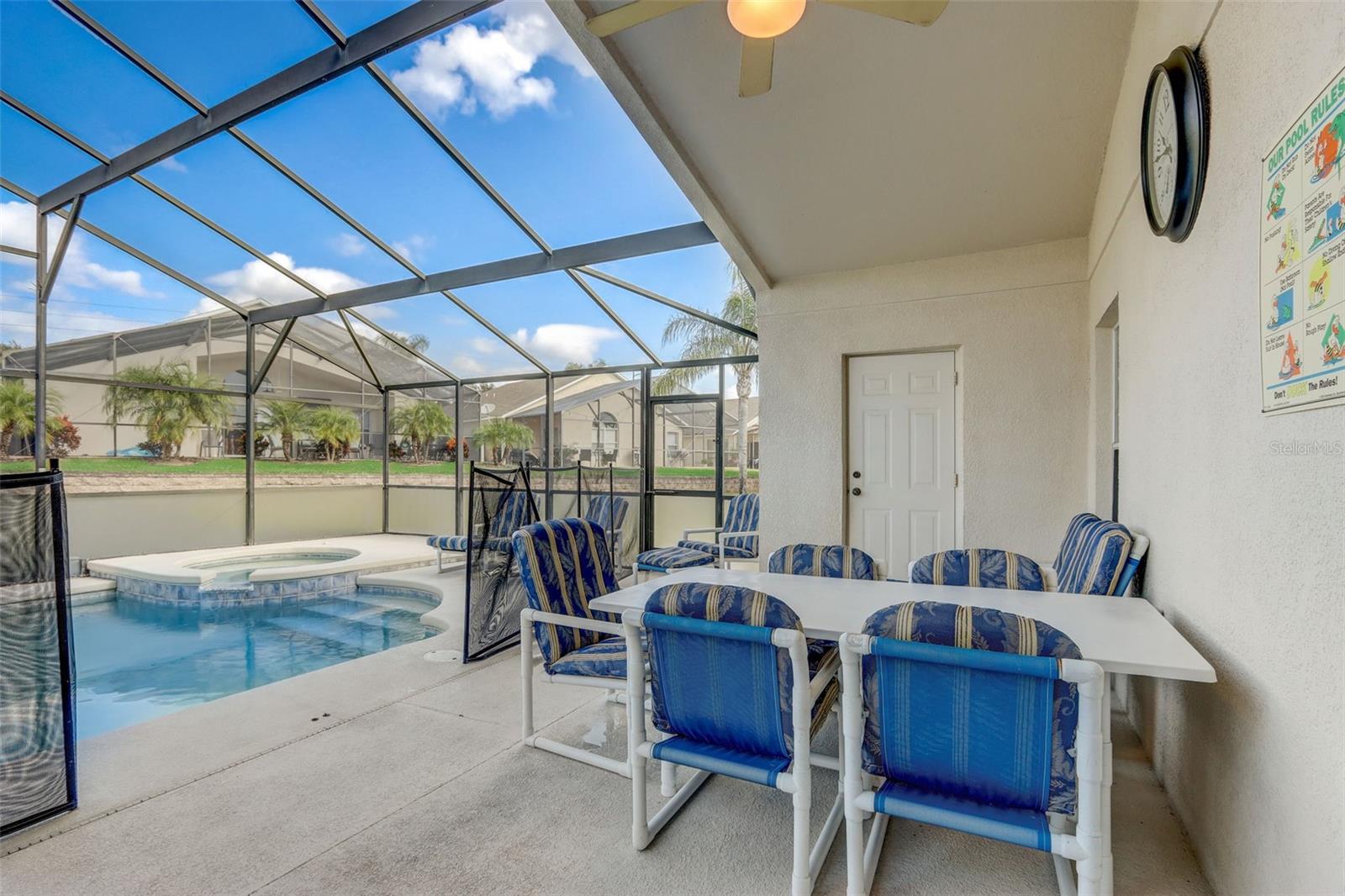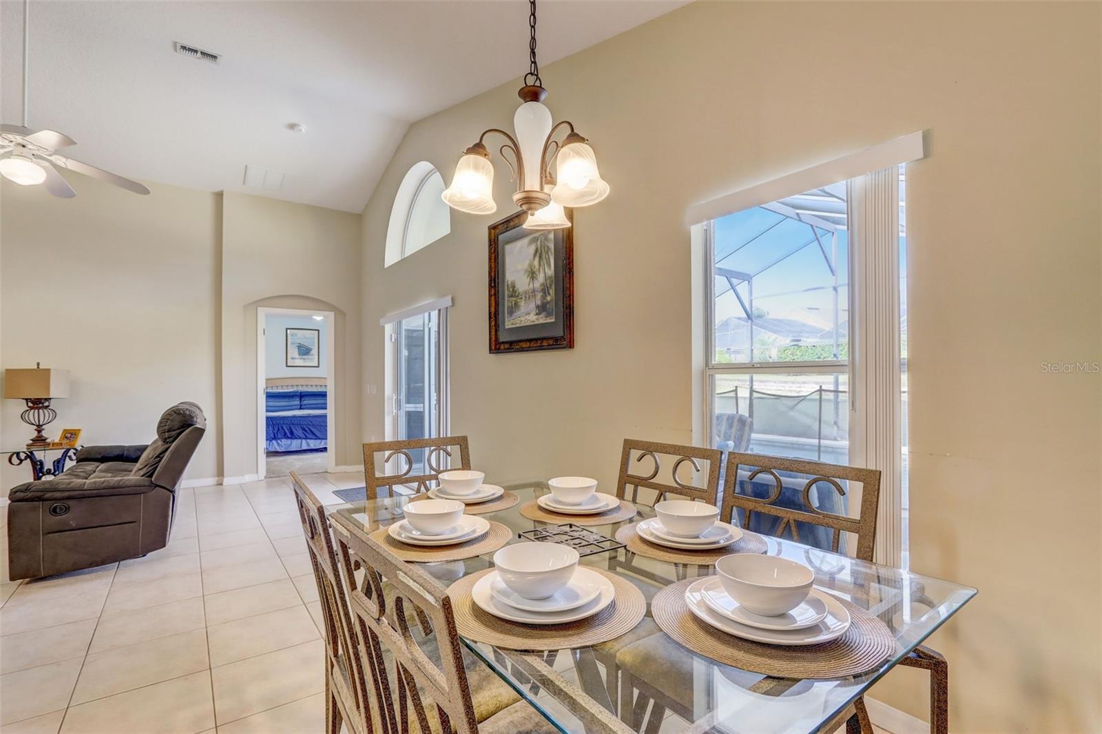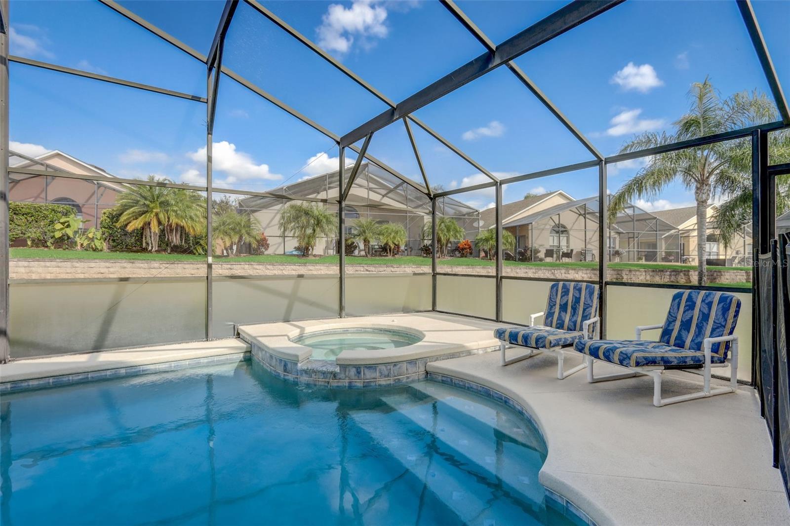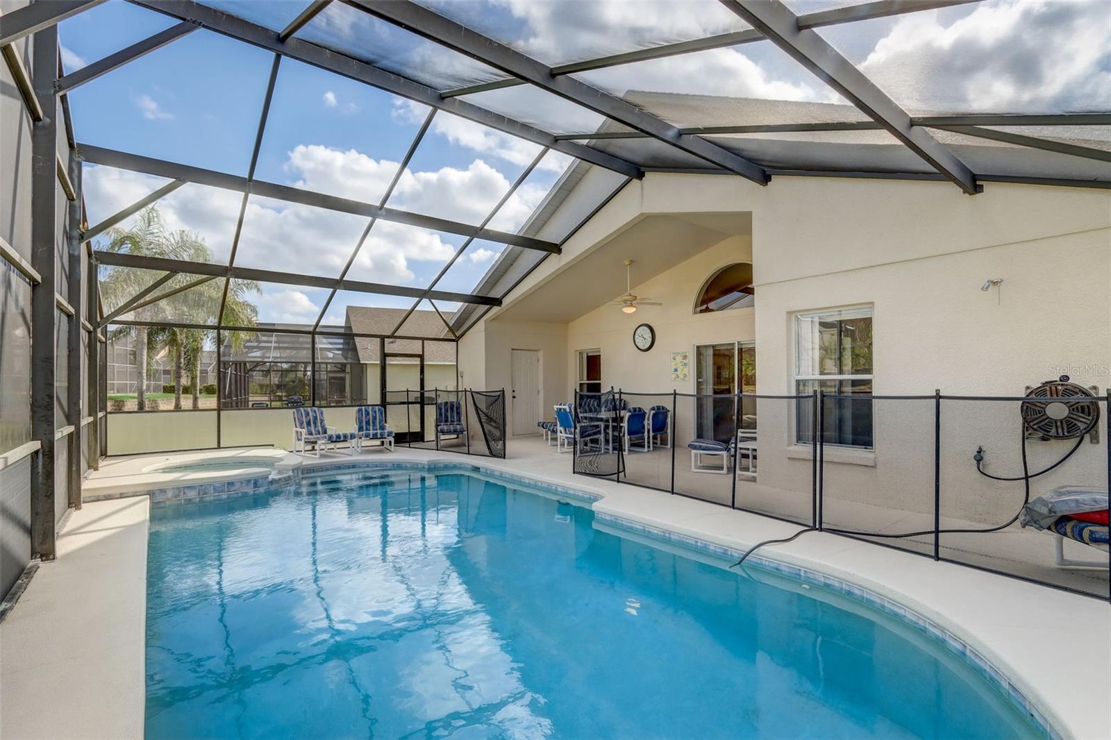 Experience the best of Florida living in this fully furnished pool home in the Sanctuary at West Haven. The open layout and vaulted ceilings create a bright, welcoming atmosphere from the moment you walk in. The kitchen features a large center island, ample storage, and direct access to the dining and living areas—perfect for entertaining family and friends. The primary suite offers a relaxing retreat with sliding doors to the pool and a spacious ensuite with dual vanities, a garden tub, and a separate shower. The garage has been converted into a game room, adding extra space for fun and entertainment. Step outside to your private backyard oasis with a screened-in heated pool and spa, outdoor shower, and a generous pool deck ideal for lounging or hosting gatherings. The home backs onto open green space, providing added privacy and a tranquil view. A new roof (2024) offers peace of mind and lasting value. Conveniently located near theme parks, shopping, and dining, this property is perfect as a full-time residence, vacation home, or short-term rental.
