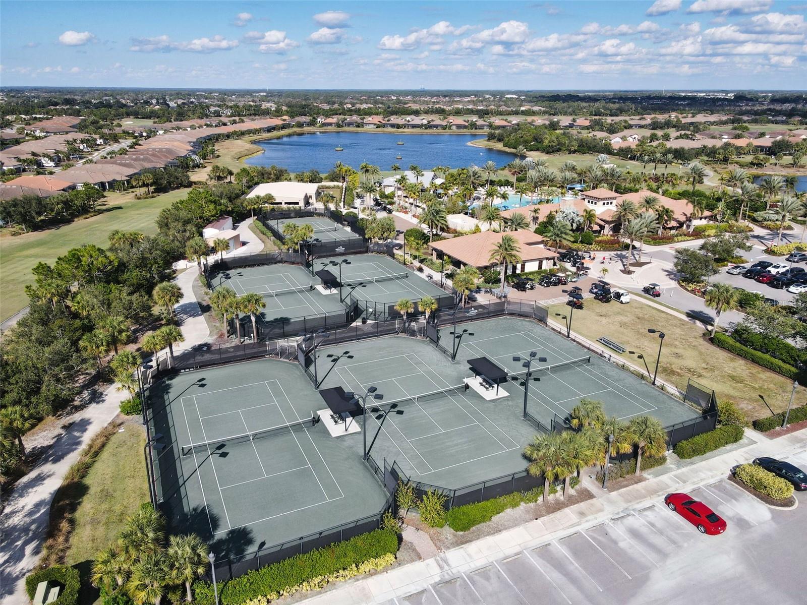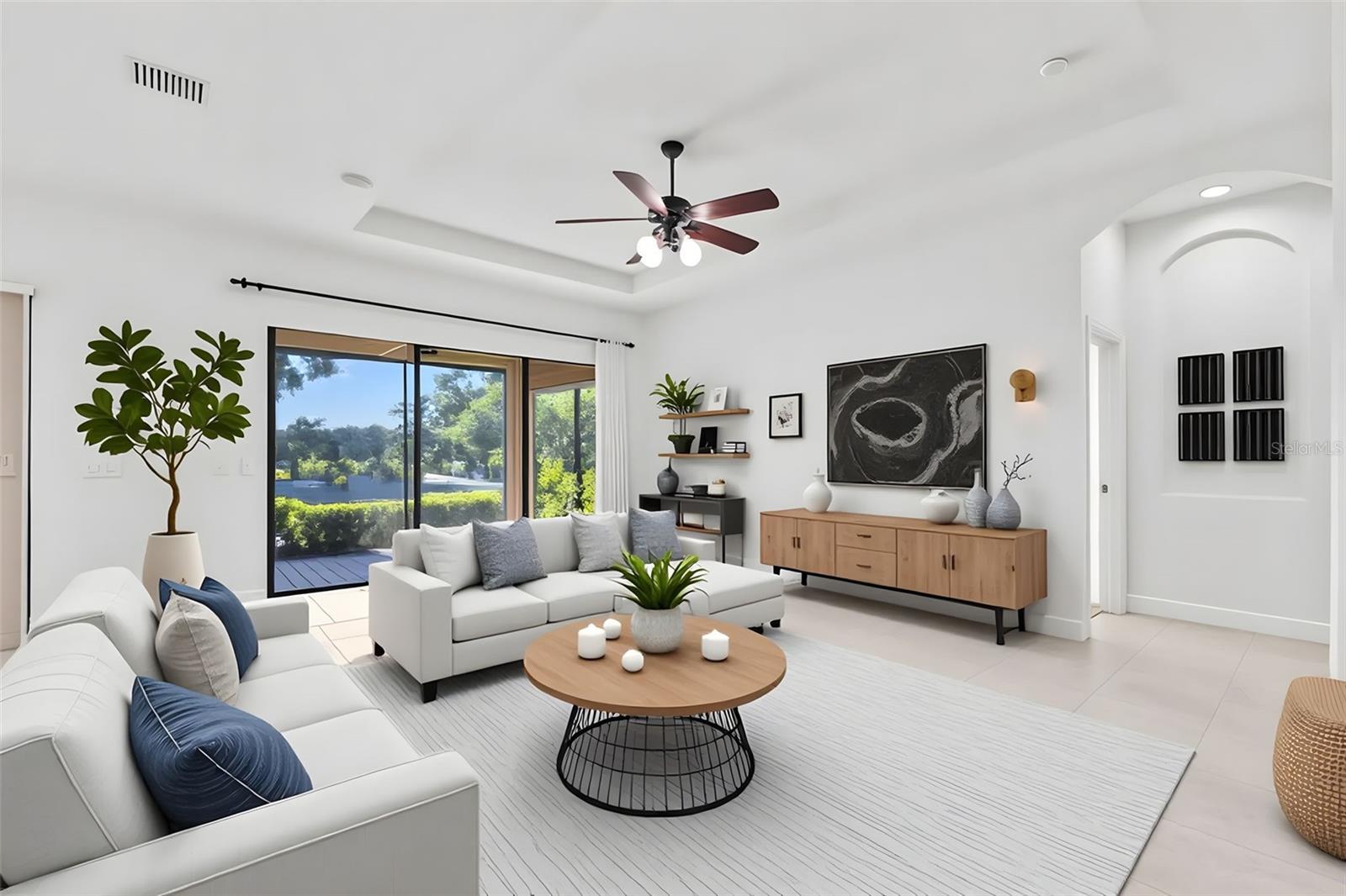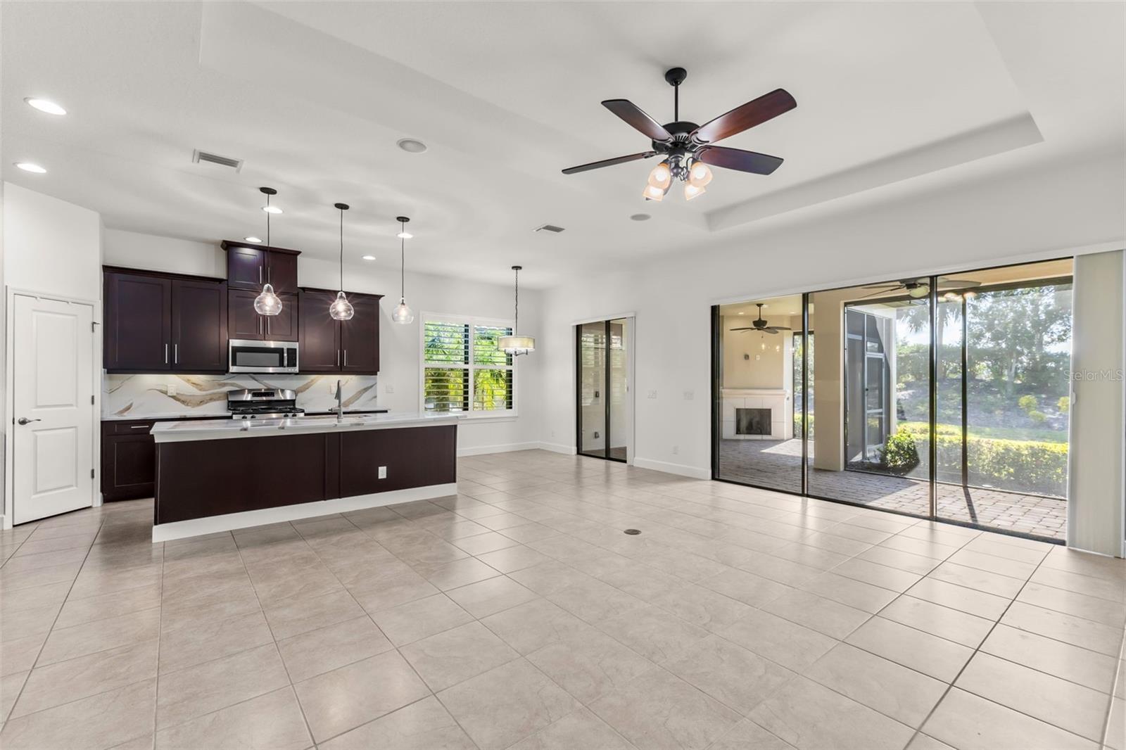 Welcome to 5242 Napoli Run, an exceptional residence located in the highly desirable Esplanade Golf & Country Club in Lakewood Ranch. This beautifully upgraded 2-bedroom plus den/office, 2.5-bath home offers 2, 053 sq. ft. of elegant living space and includes a golf-deeded homesite, providing golf membership for two—all included in the HOA fees. Step inside to discover a thoughtfully designed floor plan enhanced by premium upgrades throughout, including stylish flooring, upgraded bathrooms, and custom closets that elevate both comfort and functionality. The spacious gourmet kitchen and open-concept living areas make this home ideal for entertaining or enjoying quiet evenings in. One of the standout features of this property is its expansive screened-in back porch, complete with a built-in outdoor gas fireplace—perfect for year-round relaxation. The backyard offers exceptional privacy with lush landscaping and a tranquil pond view just beyond, creating a serene outdoor retreat. Esplanade is renowned for its amenity-rich lifestyle, featuring a resort-style community pool, tennis courts, pickleball courts, a state-of-the-art fitness center, on-site restaurant, Tiki bar, and beautifully maintained walking paths. With its vibrant community atmosphere and unparalleled amenities, Esplanade remains one of Lakewood Ranch’s most sought-after neighborhoods. Updates completed recently in this home include: New quartz countertops, new showers, LVP flooring in bedrooms and office, custom closets, new light in kitchen/foyer, plantation shutters, new hot water heater (2025) and hurricane screens on all Lanai/porch openings. **Some photos have been virtually staged.
