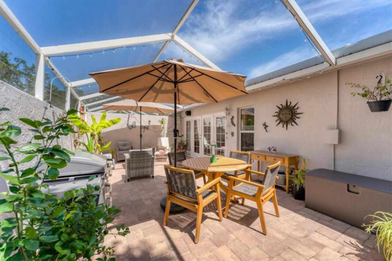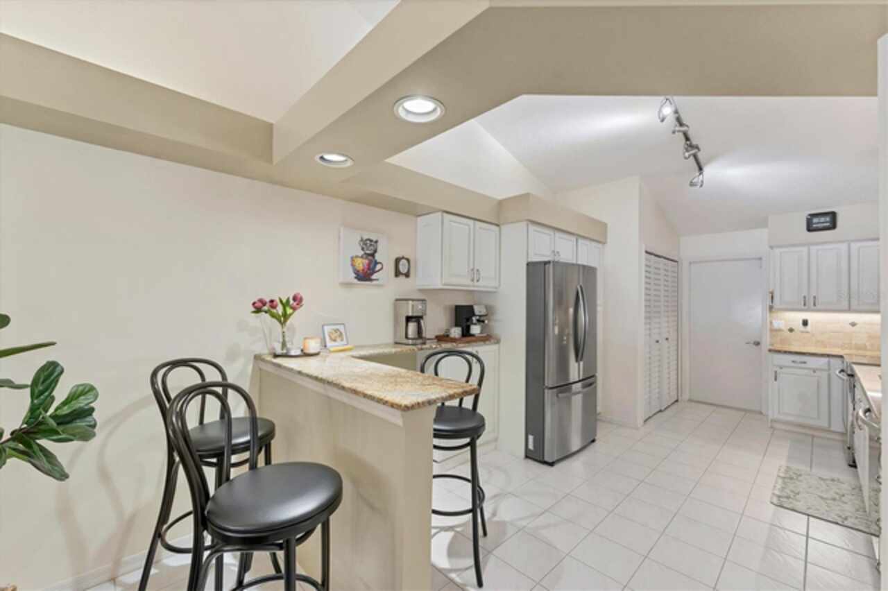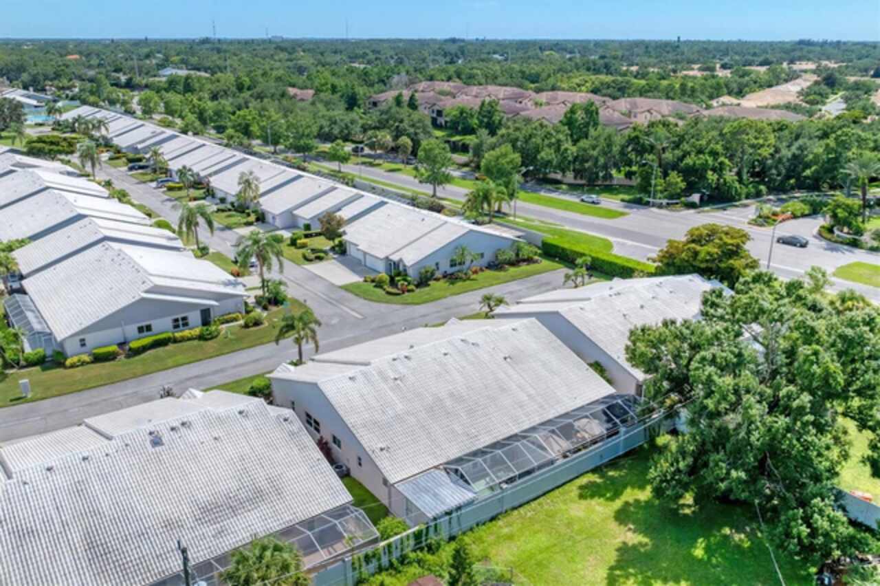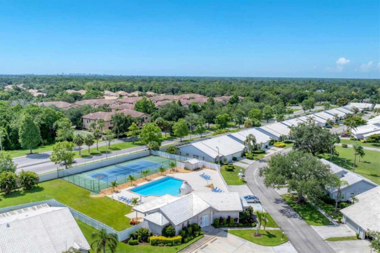 Step inside this beautifully maintained and thoughtfully updated 3-bedroom, 2-bath residence, offering 1, 938 square feet of spacious, light-filled living. From the moment you cross the threshold, the world fades away, and you're welcomed into a haven of calm—where comfort and elegance meet in perfect harmony. Color-drenched walls and rich, upgraded light fixtures complement an elegant, timeless color palette, while soaring cathedral ceilings and plantation shutters enhance the home’s sense of scale and refinement. The flexible floor plan includes a formal living room, family room, and dining area, giving you endless options to tailor the space to your lifestyle. One of the bedrooms is currently being used as a stylish home office, ideal for remote work or quiet reflection. The kitchen is a true culinary delight, offering abundant cabinetry and counter space, stainless steel appliances, and a bar-height counter perfect for casual dining or entertaining. Just off the kitchen, the garage boasts a utility sink, gleaming epoxy floors, and an additional refrigerator that conveys with the home. Your serene primary suite offers two generous walk-in closets and an ensuite bath with a luxurious soaking tub—the perfect place to unwind at the end of the day. Thoughtfully positioned, the two secondary bedrooms ensure privacy for the primary suite, making this home feel even more spacious and well-planned. Step outside to a screened-in patio that serves as a delightful escape—an outdoor living area finished with classic pavers, framed by a private stucco wall, and brimming with charm. Whether dining alfresco, enjoying a quiet morning coffee, or soaking in the included hot tub, this serene retreat offers shade, privacy, and ample headroom for umbrellas—making it your go-to sanctuary year-round. Located in a vibrant, amenity-rich community, residents enjoy access to a recently renovated geothermal heated pool (2024), NEW ROOFS ON THE VILLA and an active clubhouse with year-round events and games like Mahjongg, Bridge, and Poker, as well as tennis and pickleball courts. Ideally positioned near shopping, dining, A-rated schools, hospitals, and I-75—plus just a short drive to Siesta Key, America’s #1 Beach—this home offers the perfect balance of peaceful living and everyday convenience.
