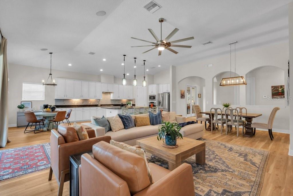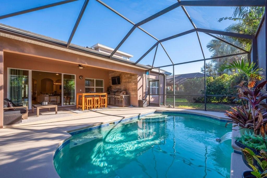 Discover West Bay’s highly sought-after Biscayne II model in FishHawk Ranch! This stunning home offers nearly 3, 200 sq ft of living space with 5 bedrooms, 4 baths, a den, a 3-car garage, and a beautiful pool. The inviting curb appeal begins with a spacious front porch and continues inside where the open-concept layout provides the perfect blend of togetherness and privacy, with bedrooms and the den thoughtfully positioned throughout the home. At the heart of the home sits a chef-inspired kitchen featuring 42" cabinetry, a walk-in pantry, a large center island with abundant storage, generous prep space, and ample seating. The kitchen overlooks the dinette, grand room, and dining room, creating an ideal setting for entertaining. Step outside to your backyard oasis—a screened lanai showcasing a temperature-controlled pool and a full outdoor kitchen, perfect for year-round Florida living. Located in Starling at FishHawk, a celebrated “green” community recognized by the Florida Green Building Coalition, residents enjoy exceptional amenities including multiple pools, fitness centers, tennis courts, parks, trails, and private access to Lithia Springs Regional Park. With top-rated schools, convenient access to Tampa, bus service to MacDill AFB, and an easy drive to world-class beaches, this home checks every box for exceptional suburban living.