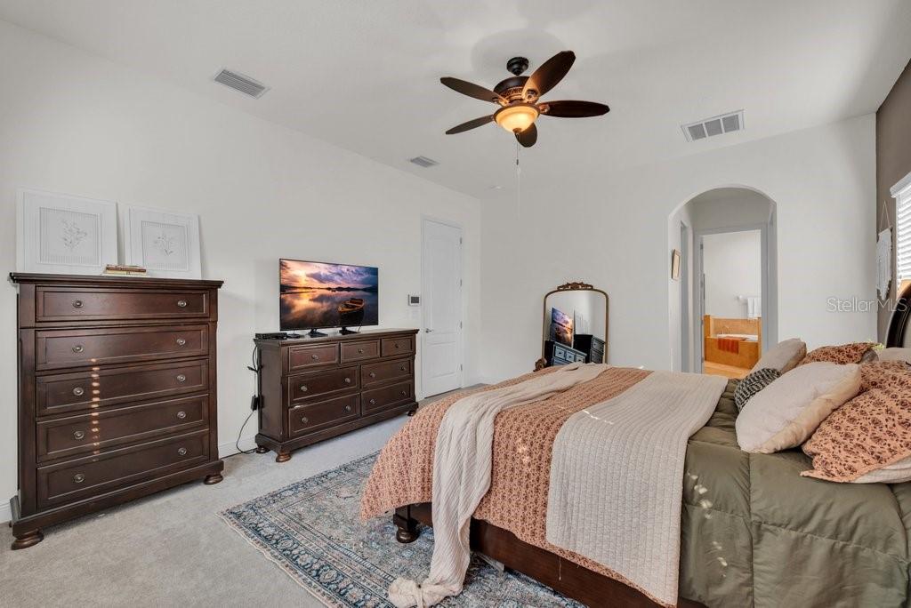 Built-in Features, Ceiling Fans(s), Crown Molding, Eat-in Kitchen, High Ceilings, In Wall Pest System, Kitchen/Family Room Combo, Living Room/Dining Room Combo, Open Floorplan, Primary Bedroom Main Floor, Solid Wood Cabinets, Split Bedroom, Stone Counters, Thermostat, Tray Ceiling(s), Walk-In Closet(s), Window Treatments